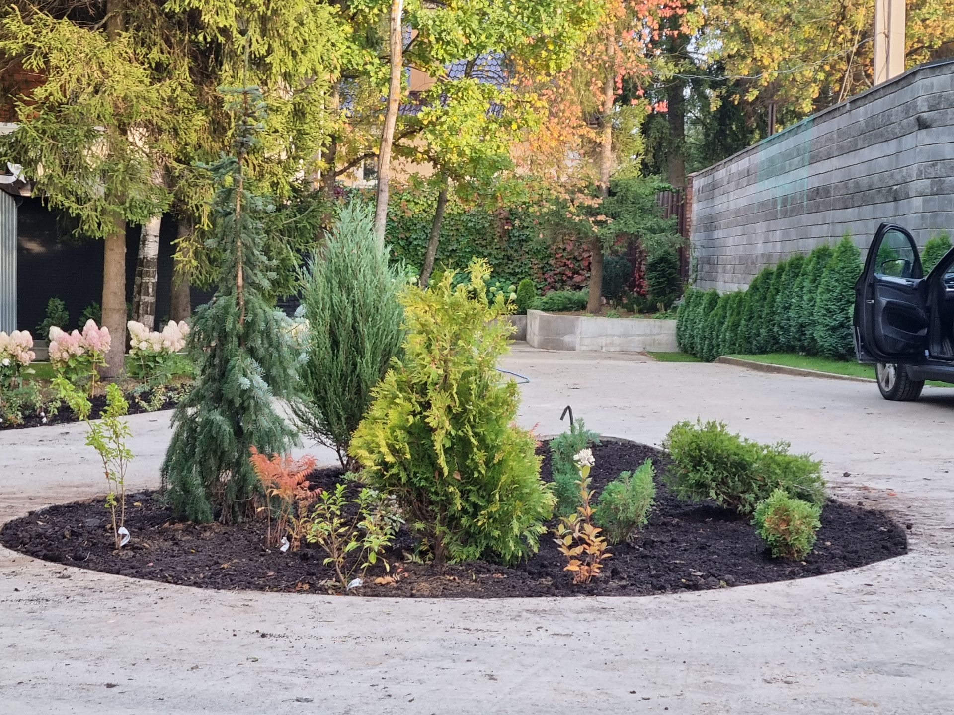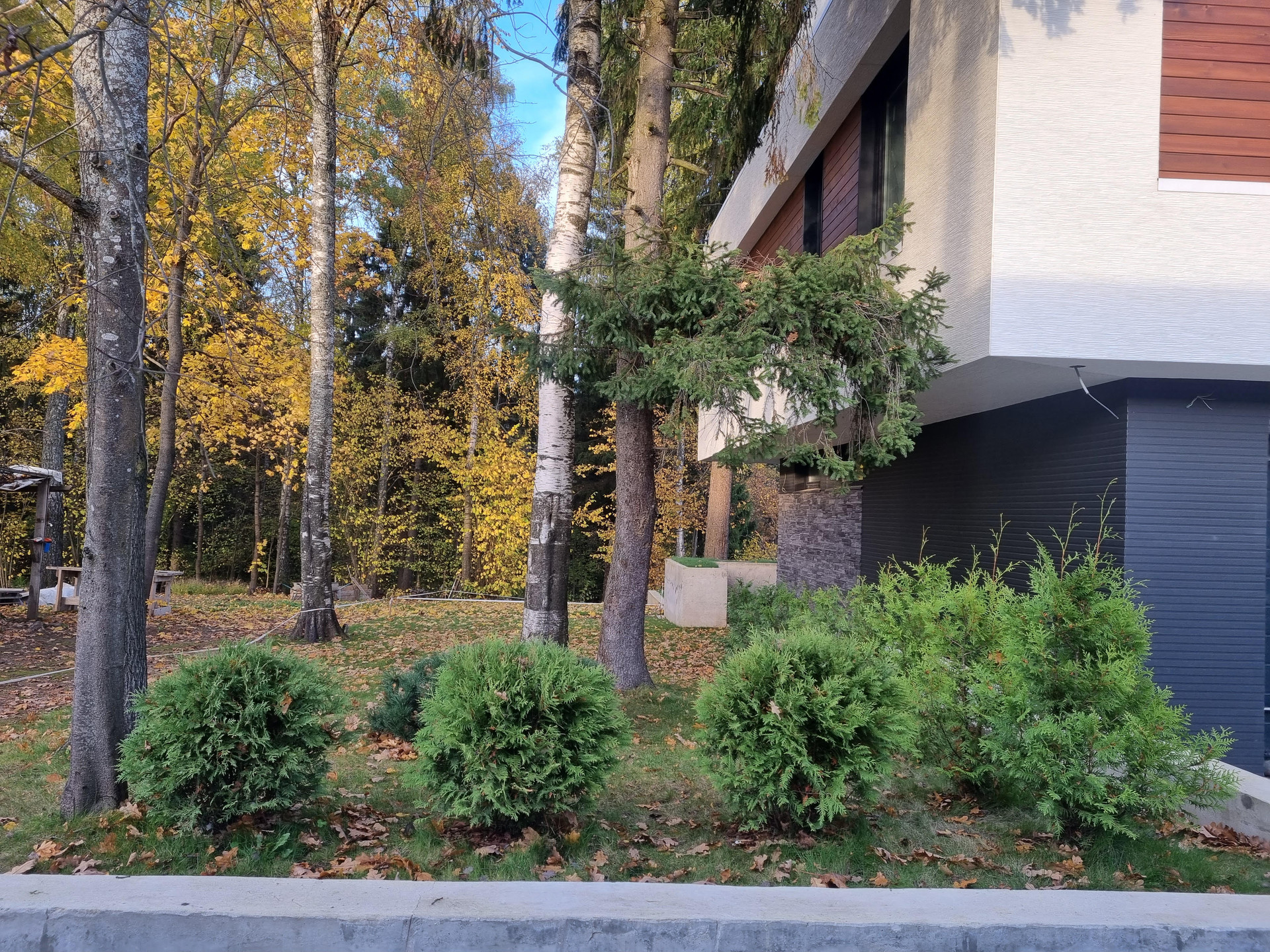 Участок лесной с многолетними лиственными и хвойными деревьями), расположен на склоне, что открывает перспективы живописных пейзажей в любое время года. В концепции ландшафта высажены разнообразные, в том числе редкие виды декоративных растений и кустарников, выполнено искусственное террасирование и зонирование участка.