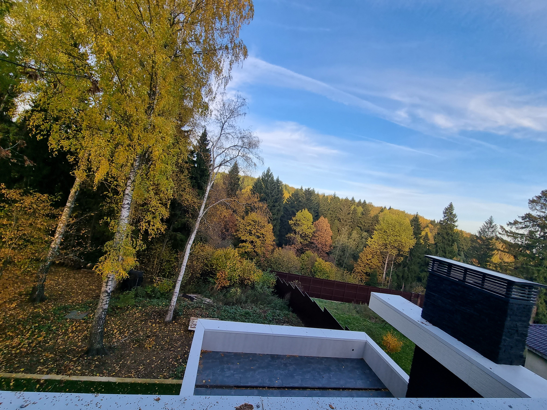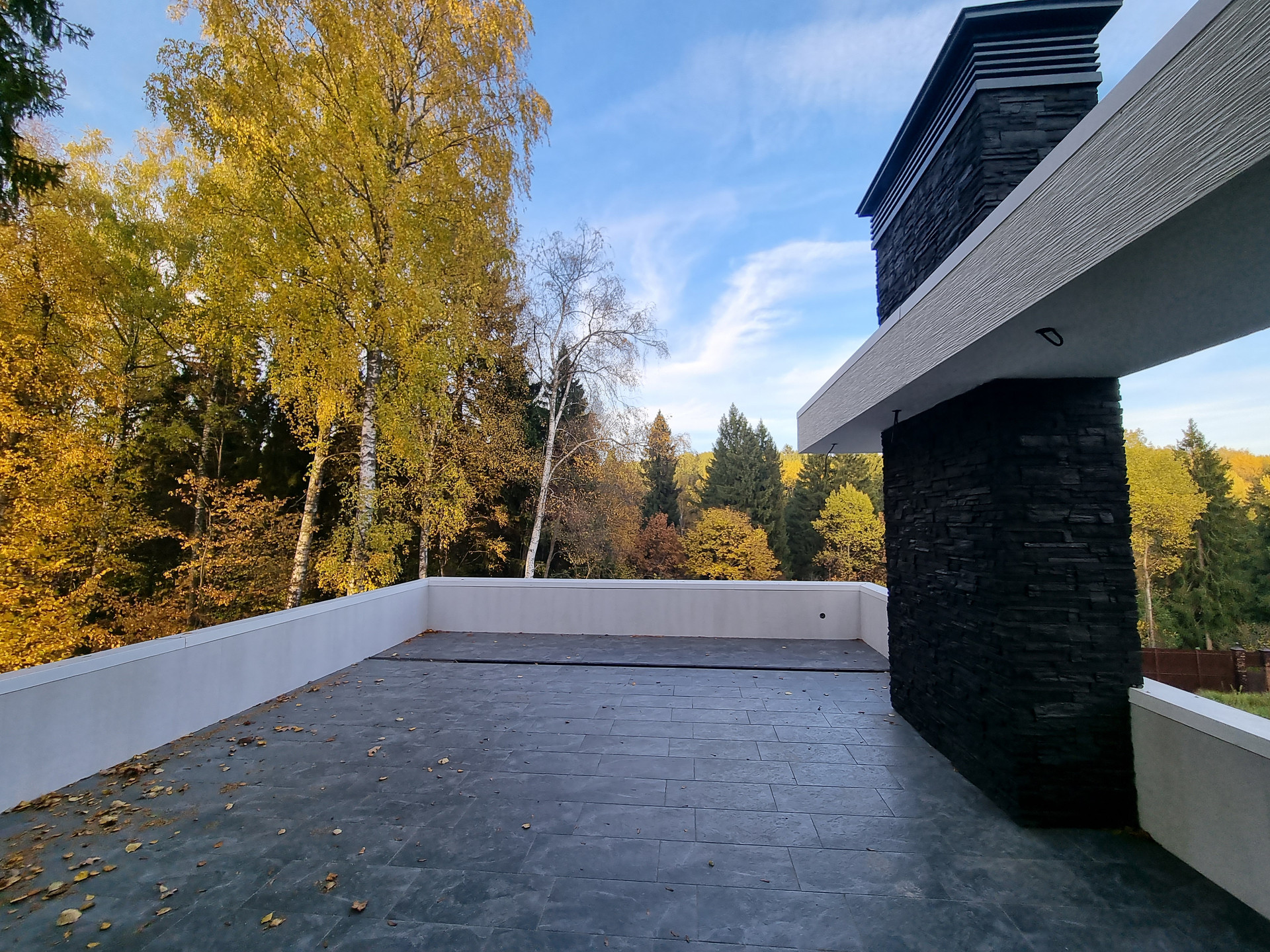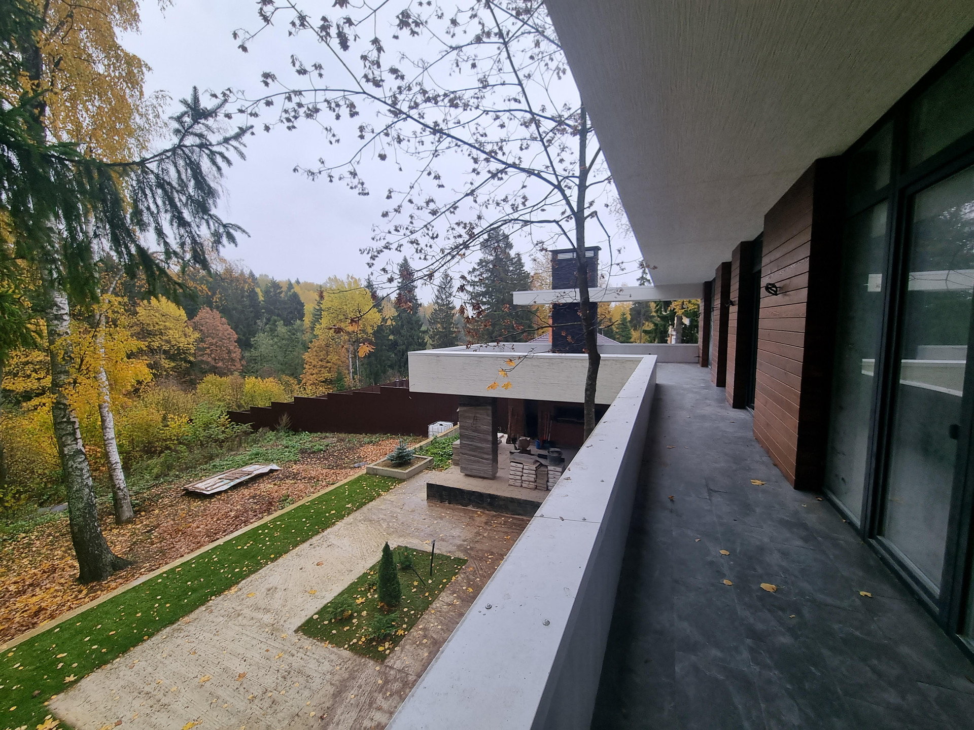 Неотъемлемой частью дома являются террасы: 1 этаж - Терраса 48,2 м2 с оборудованной зоной барбекю, которая включает в себя современный камин, зону отдыха с видом на лес.