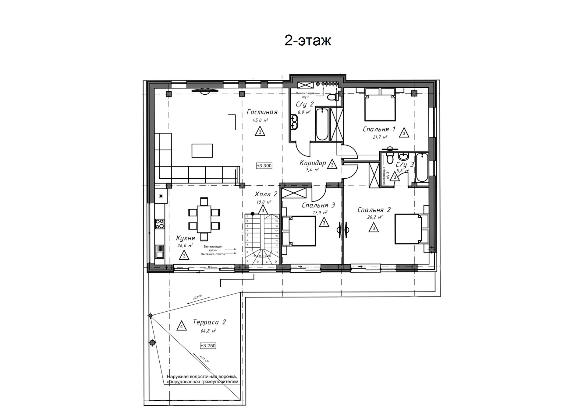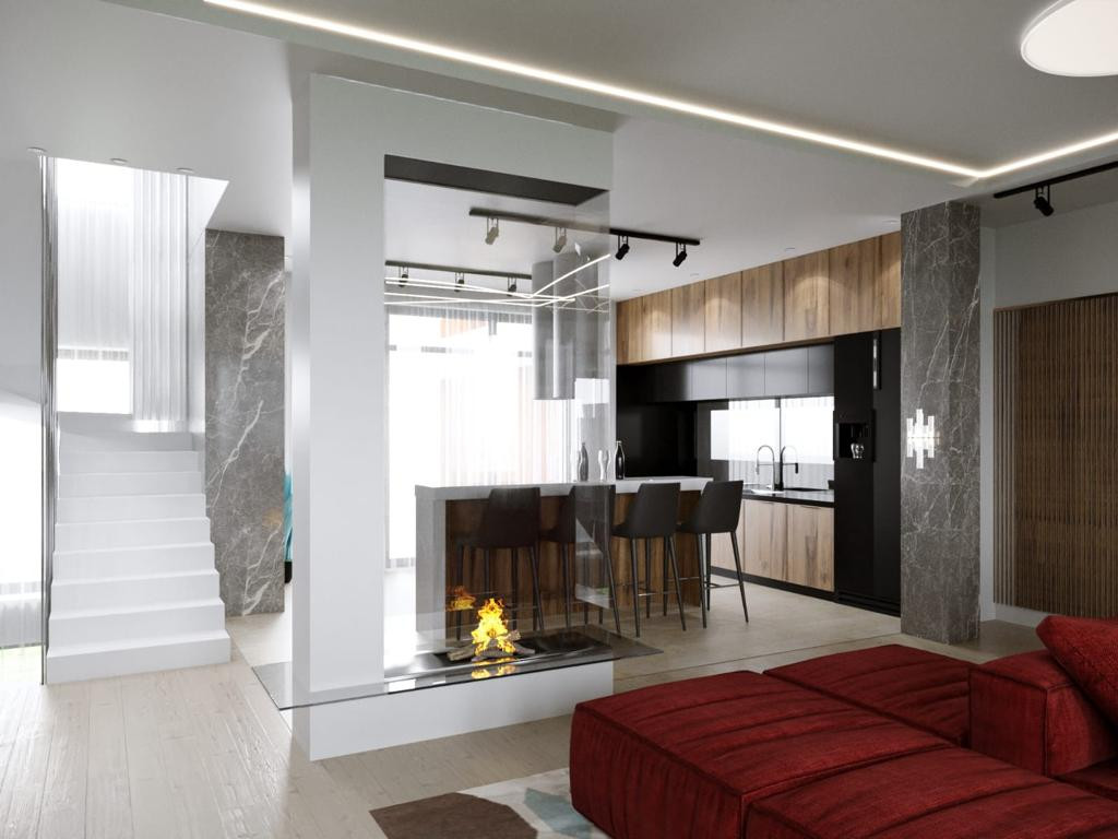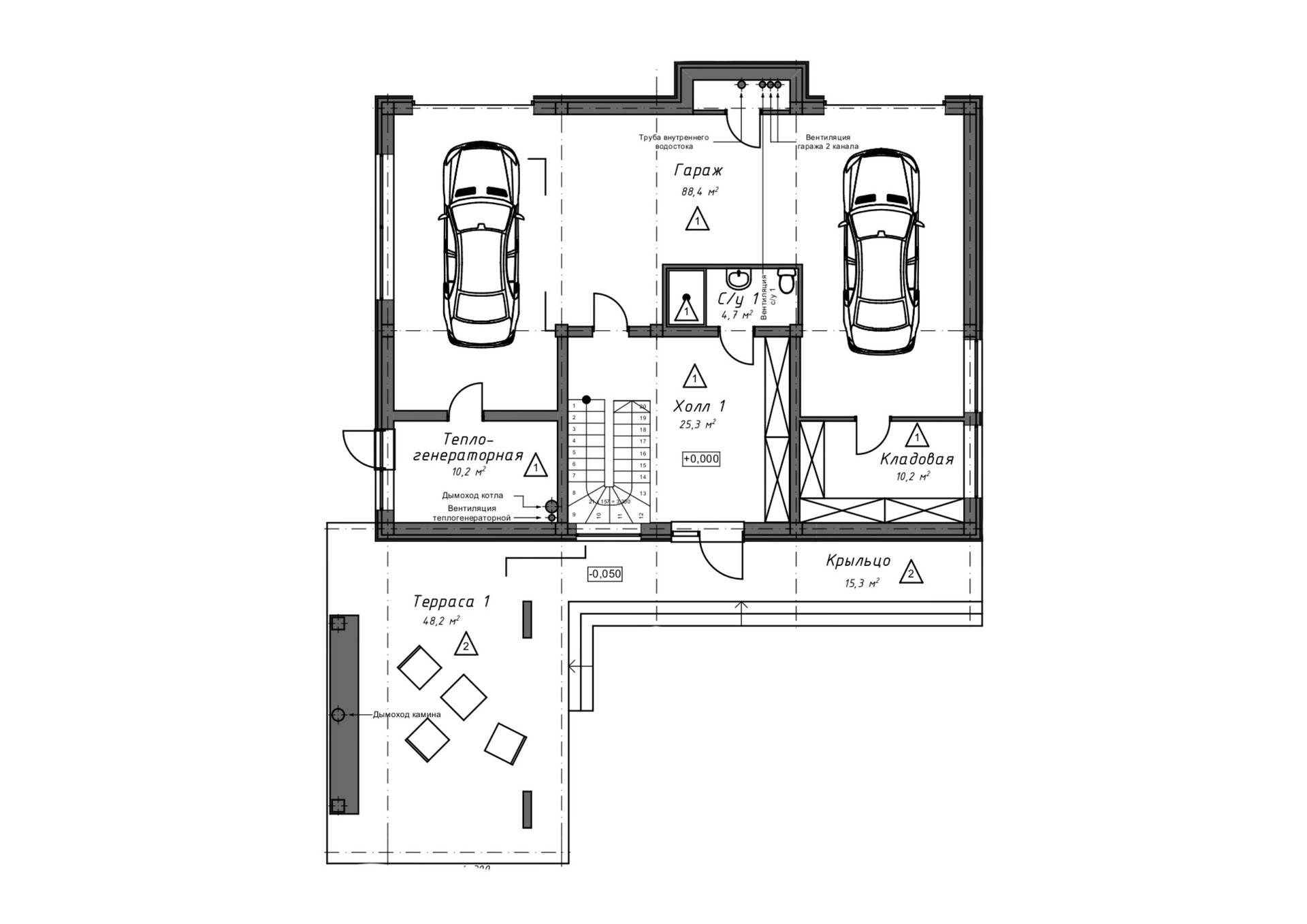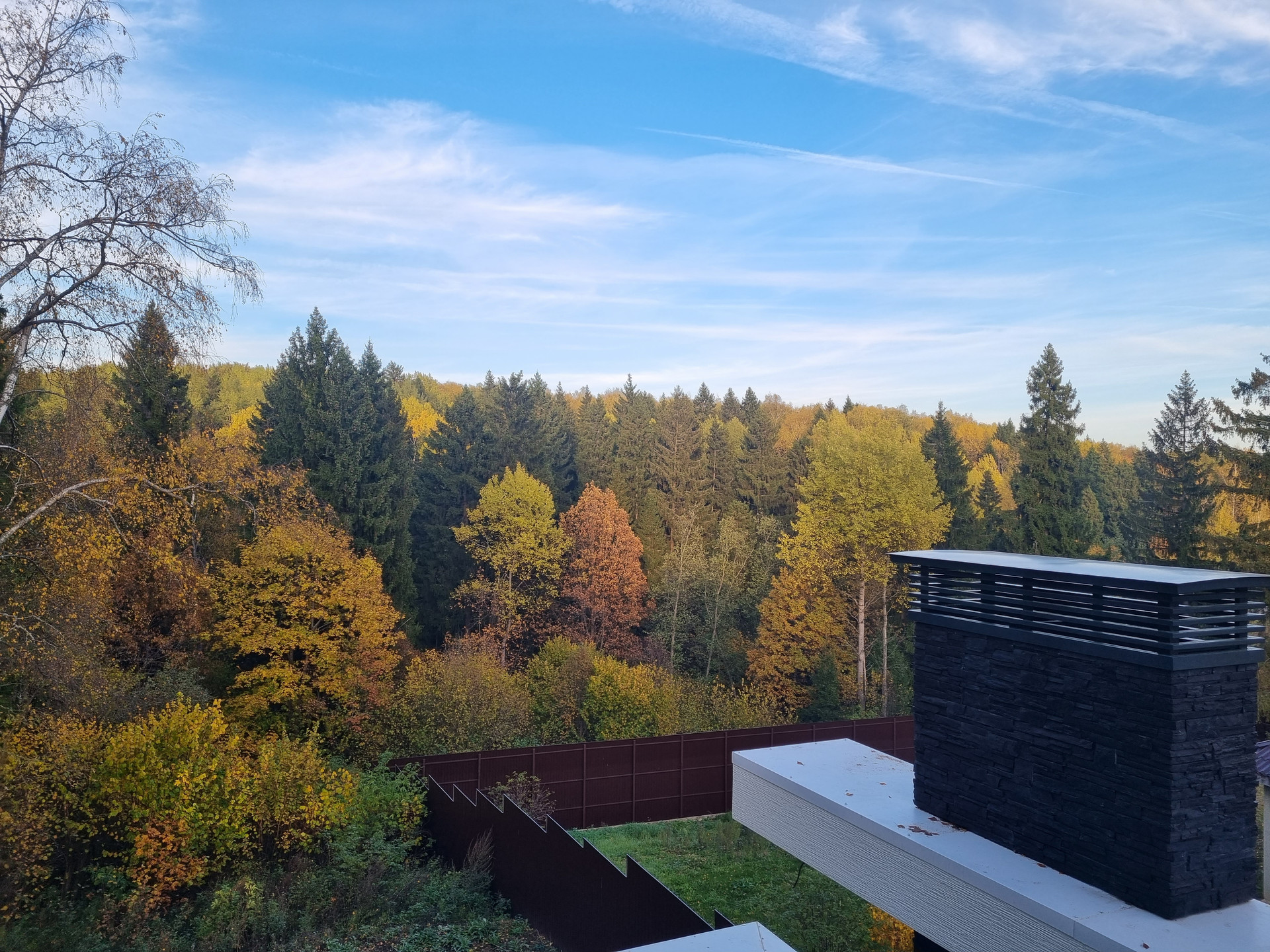 Неотъемлемой частью дома являются террасы: 1 этаж - Терраса 48,2 м2 с оборудованной зоной барбекю, которая включает в себя современный камин, зону отдыха с видом на лес.