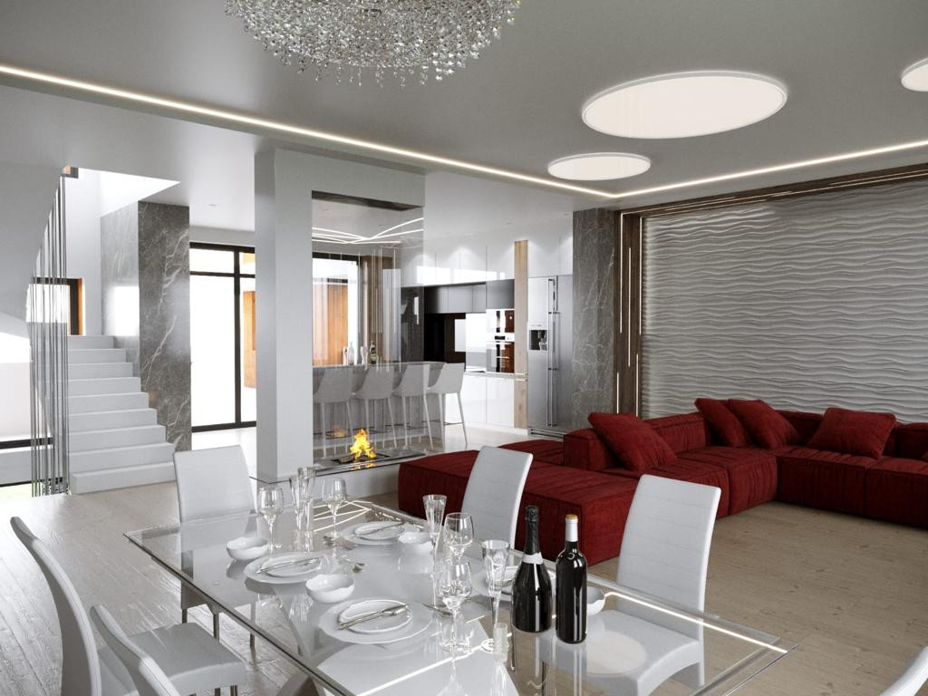 Планировка дома включает в себя: гостиную, 4 спальни, 3 санузла, зону SPA гардеробную, библиотеку, кладовую, котельную, гараж, технические помещения.