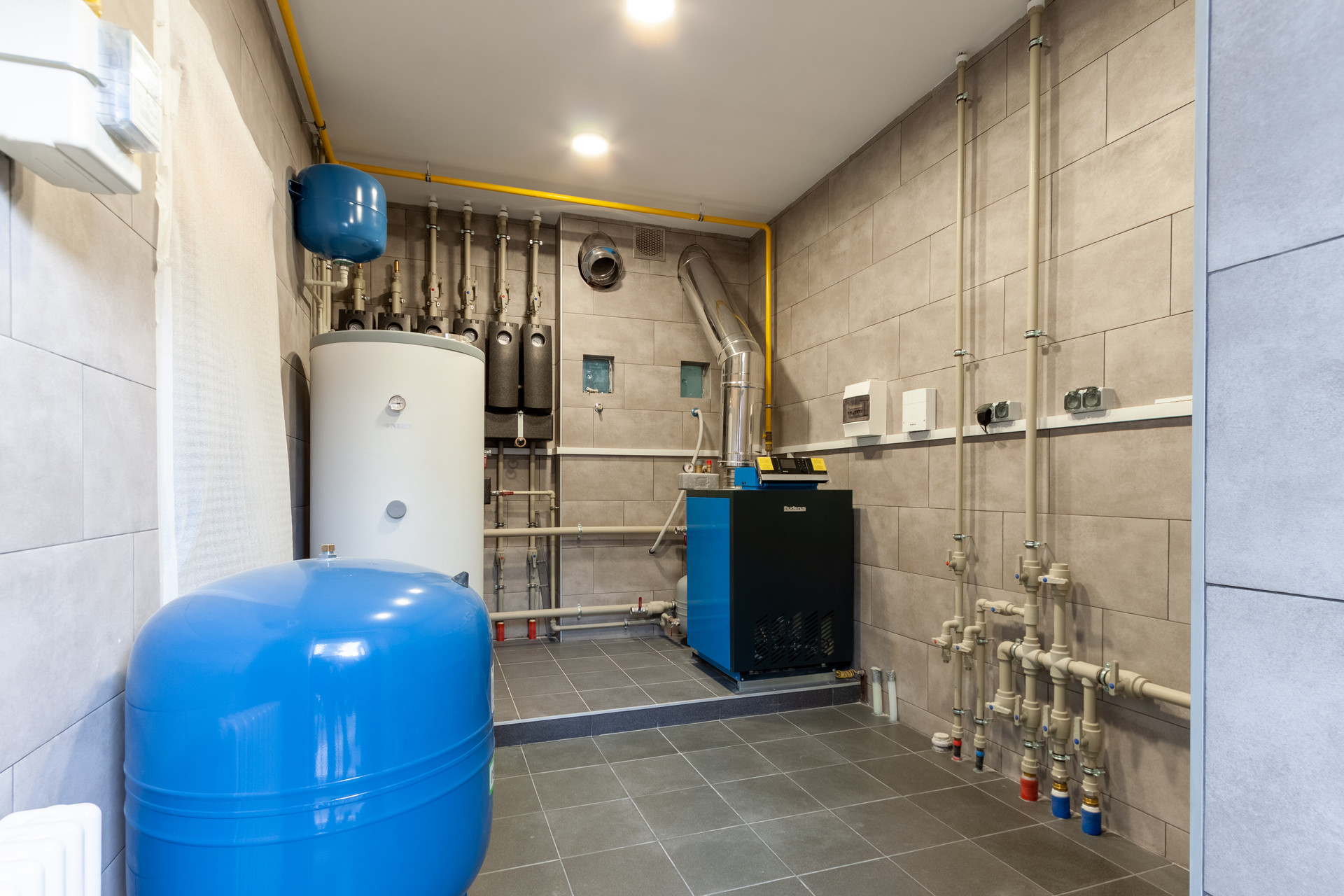 Коммуникации: газ (центральный), электричество (15 квт), артезианская скважина (145 м.), септик. Вода заведена в дом, опресована. Установлен напольный, газовый котел (Buderos), отопление подключено. По дому разведена система водоснабжения, отопления (радиаторы - Arbonia (Германия, оригинал), немецкие напольные конвектора) и тёплых полов (трубы Швеция, оригинал), а так же канализации, вентиляции и электричества.