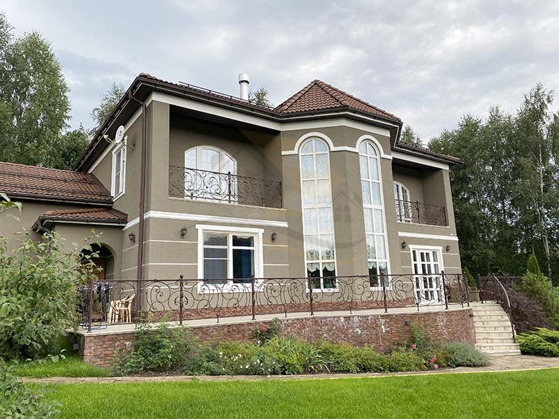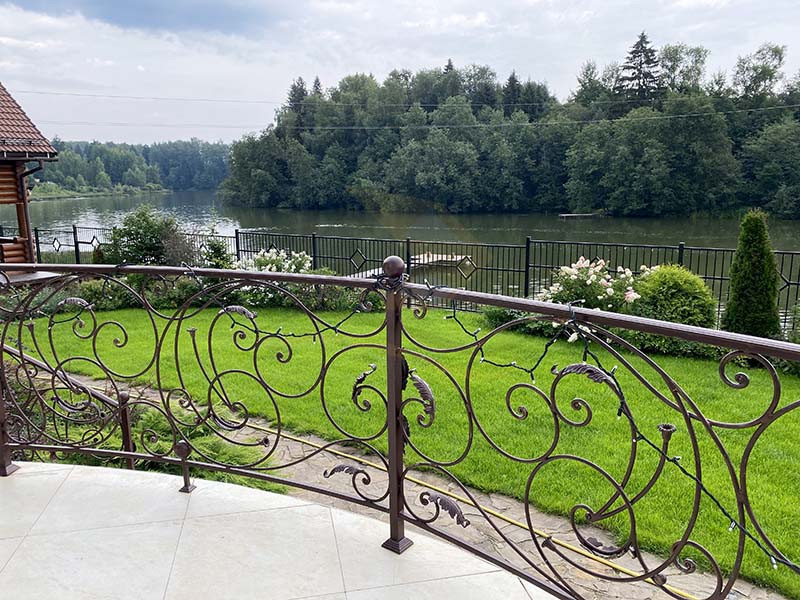 Лестница бетон отделана цельным дубом. Перила ковка.