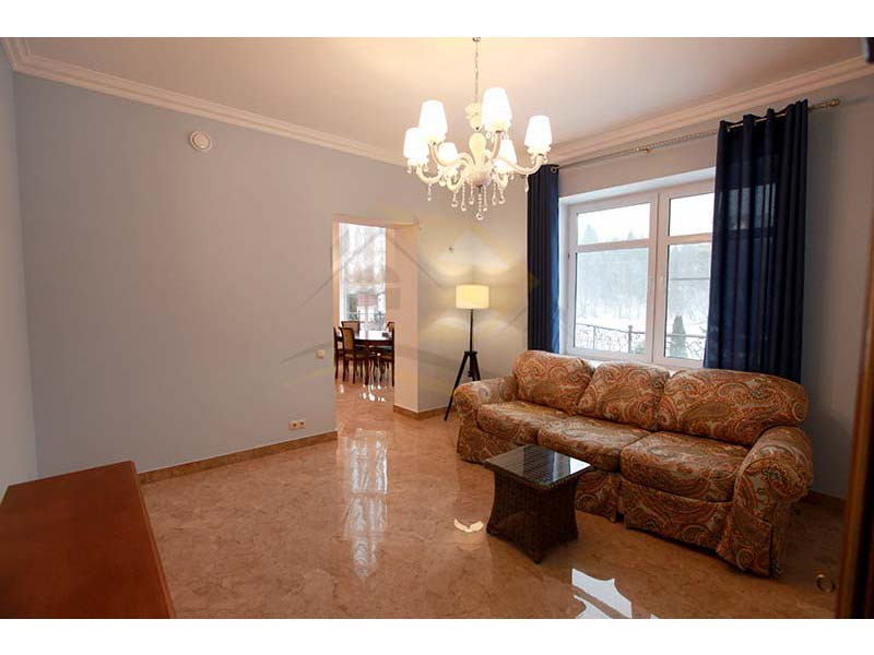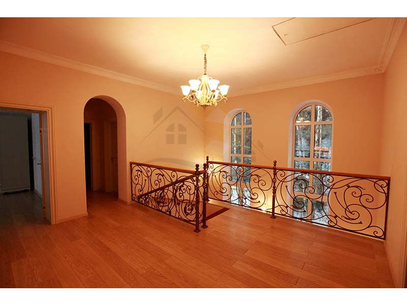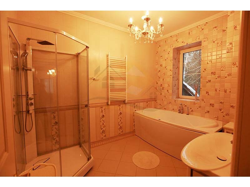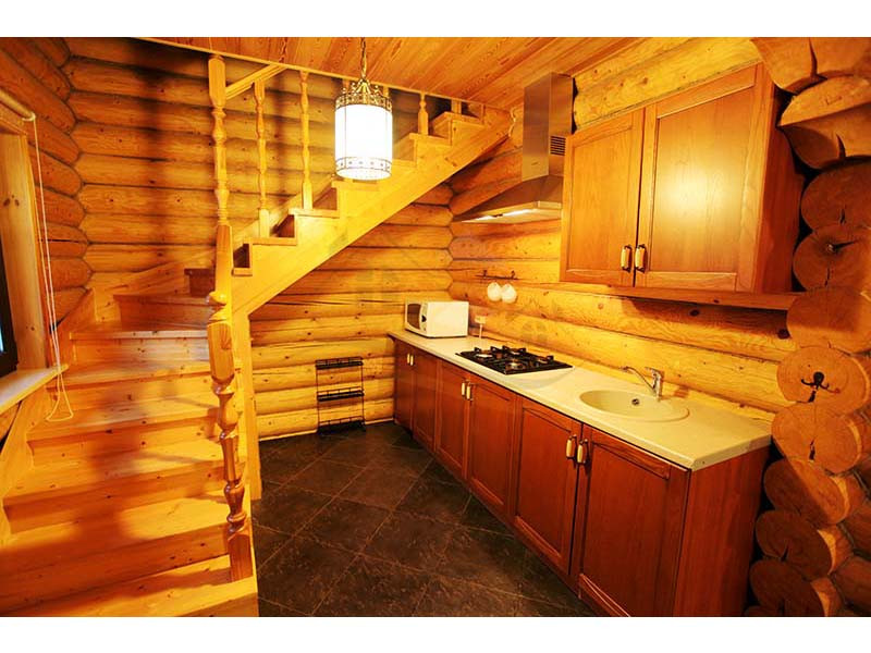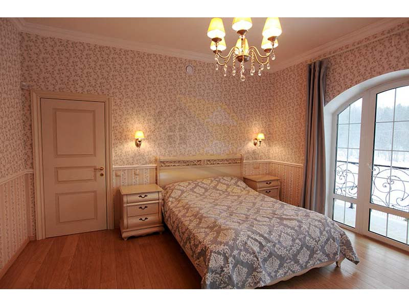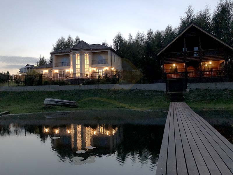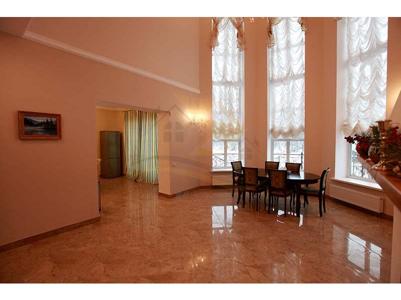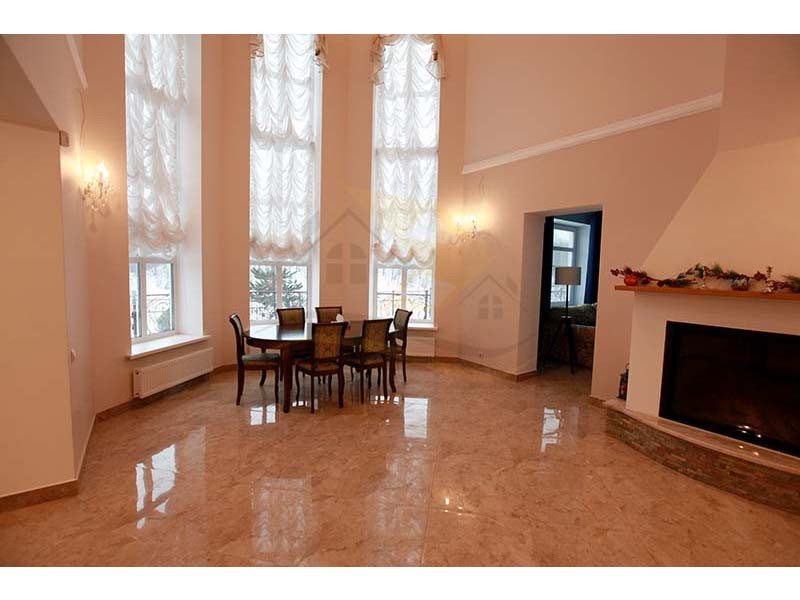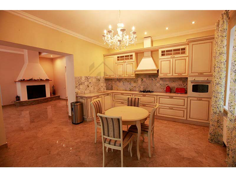 Материал стен оцилиндрованное бревно диаметр 24 см, высота потолка 3 – 4 м, кровля натуральная черепица. Перекрытия бетон и дерево. Полы плитка с водяным теплым полом и ламинат.