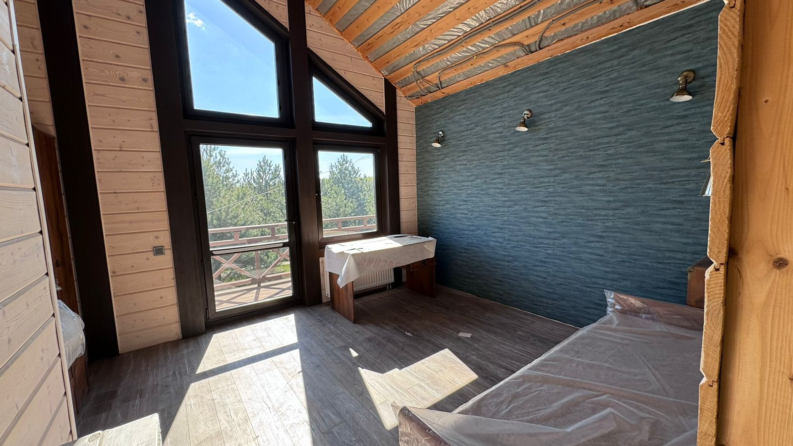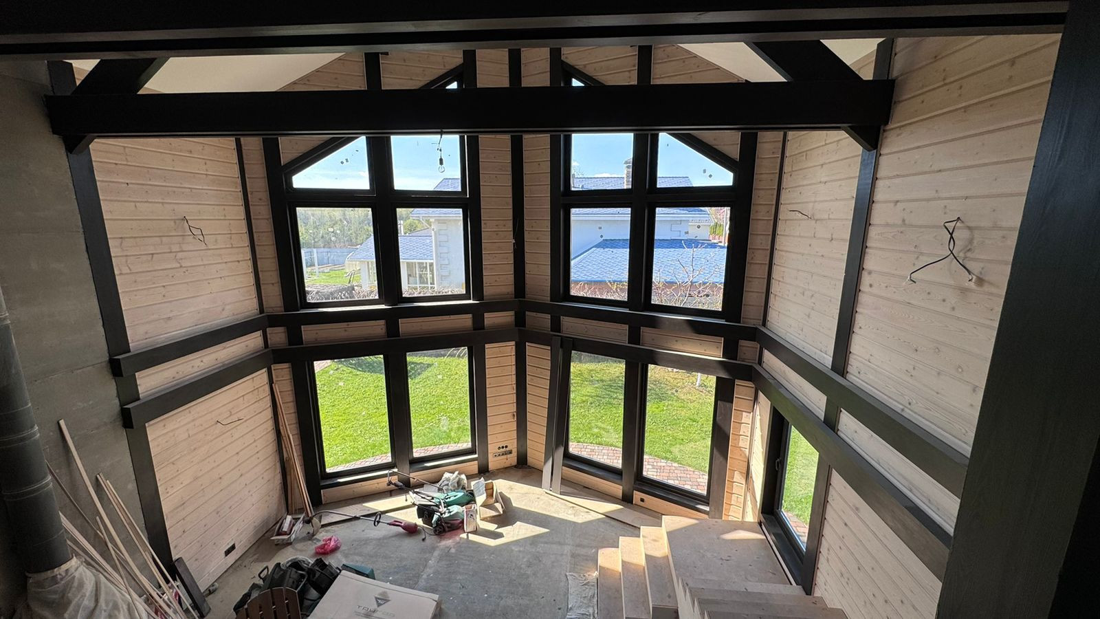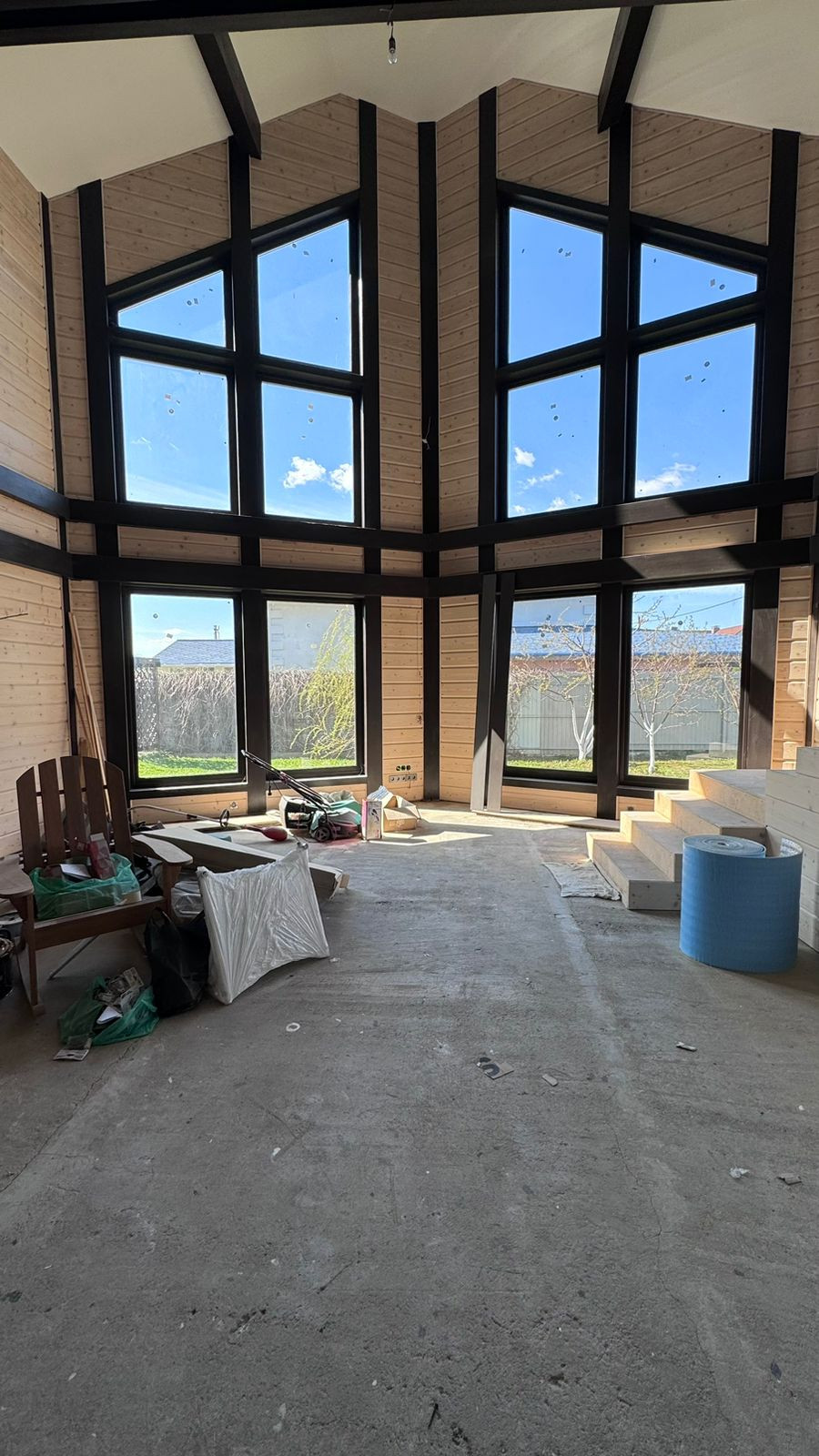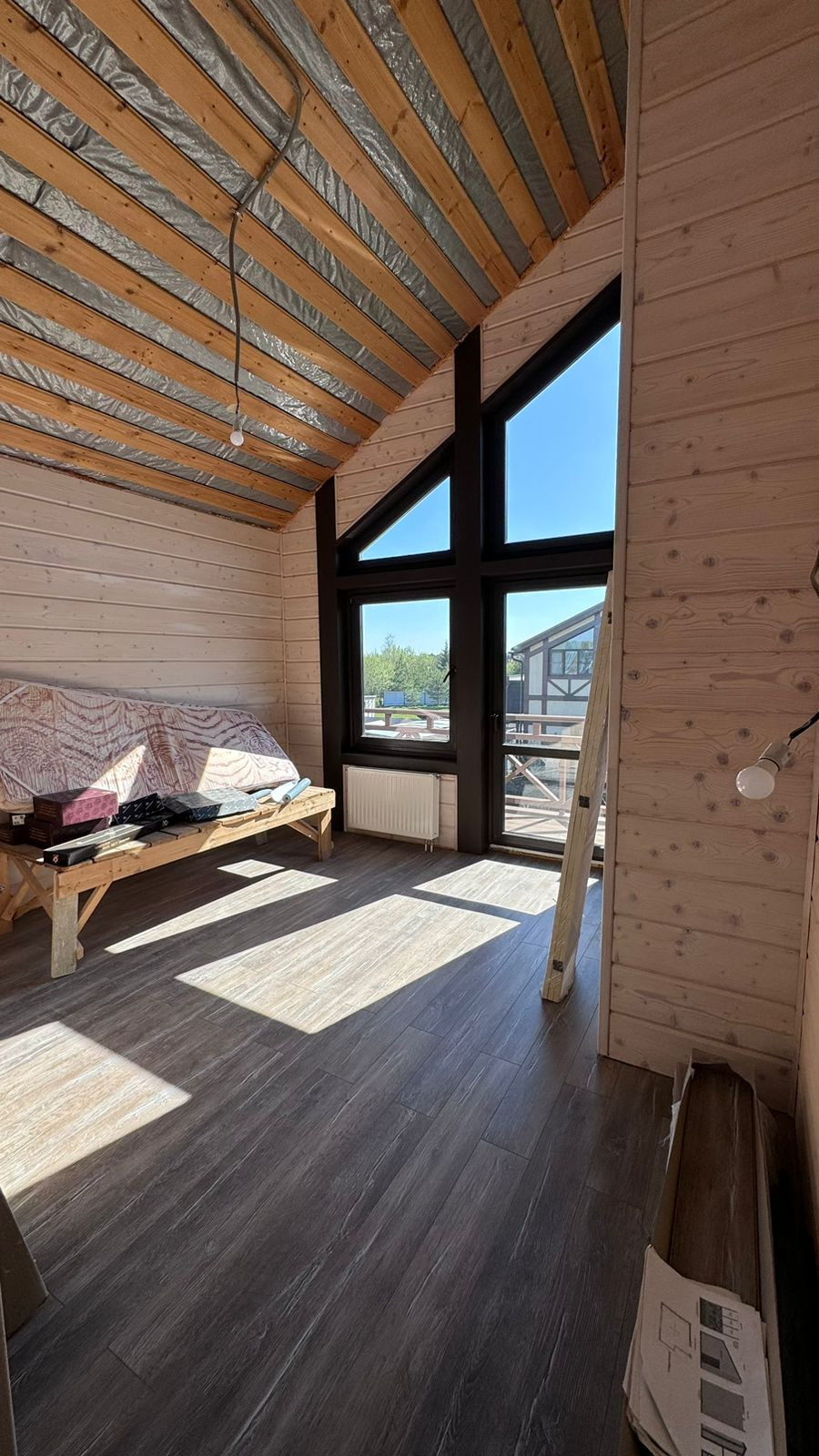 Каркас из клееного бруса 200 мм., внешняя отделка декоративная штукатурка, крыша гибкая черепица, внутренняя отделка имитация бруса. Окна ПВХ (двухкамерные).