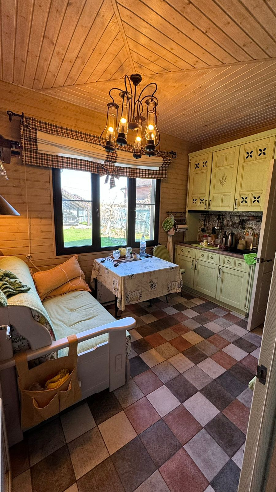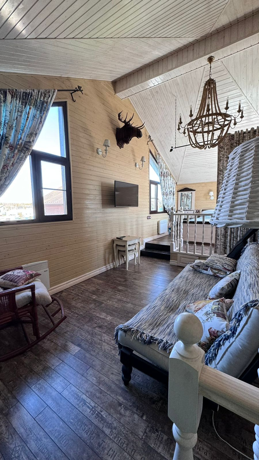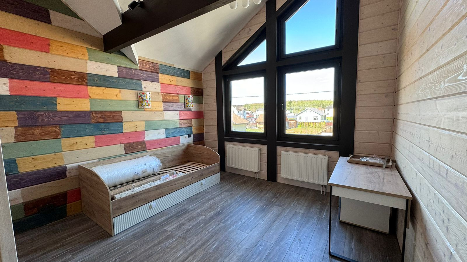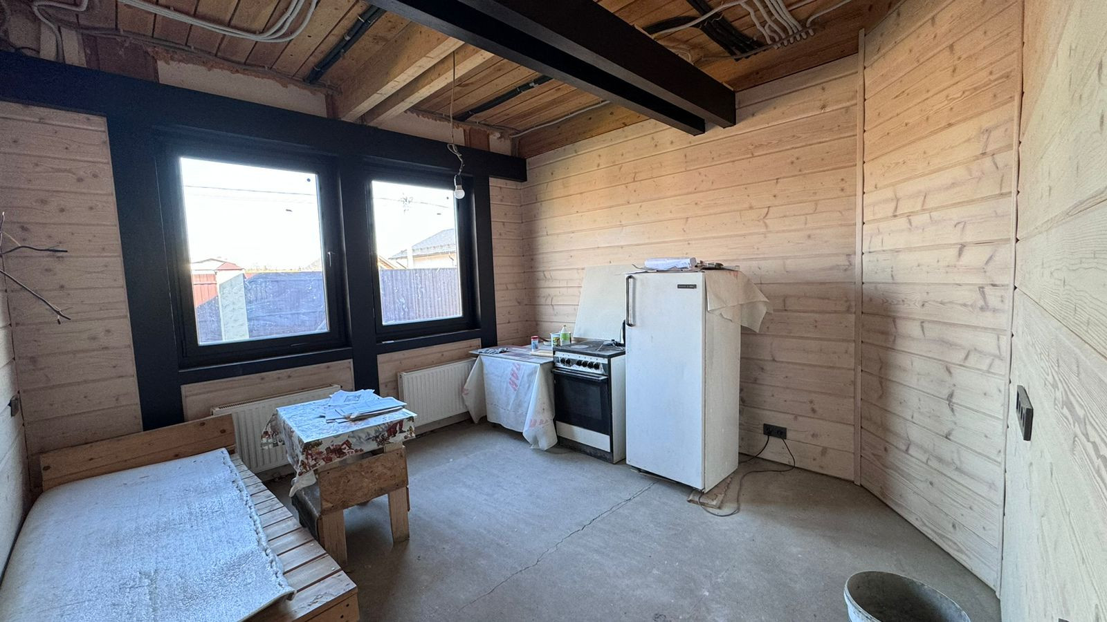 Каркас из клееного бруса 200 мм., внешняя отделка декоративная штукатурка, крыша гибкая черепица, внутренняя отделка имитация бруса. Окна ПВХ (двухкамерные).