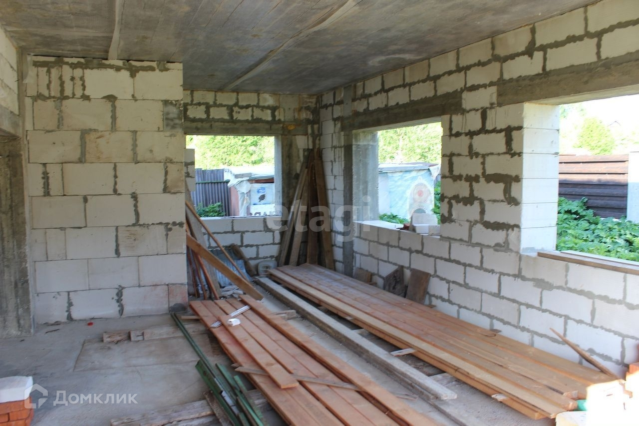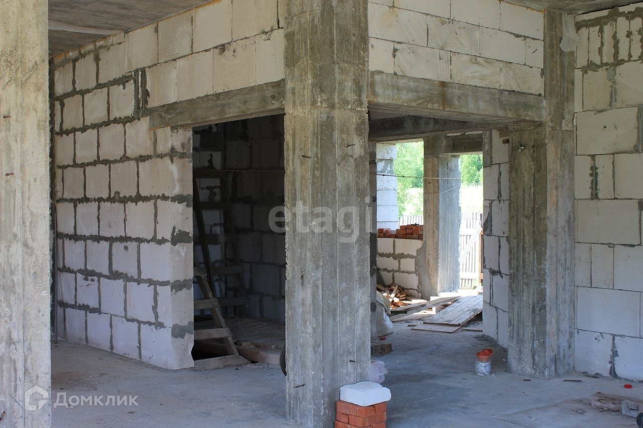 Дом из газобетона в два этажа, высокий цоколь и мансардный этаж. Дом не достроен.