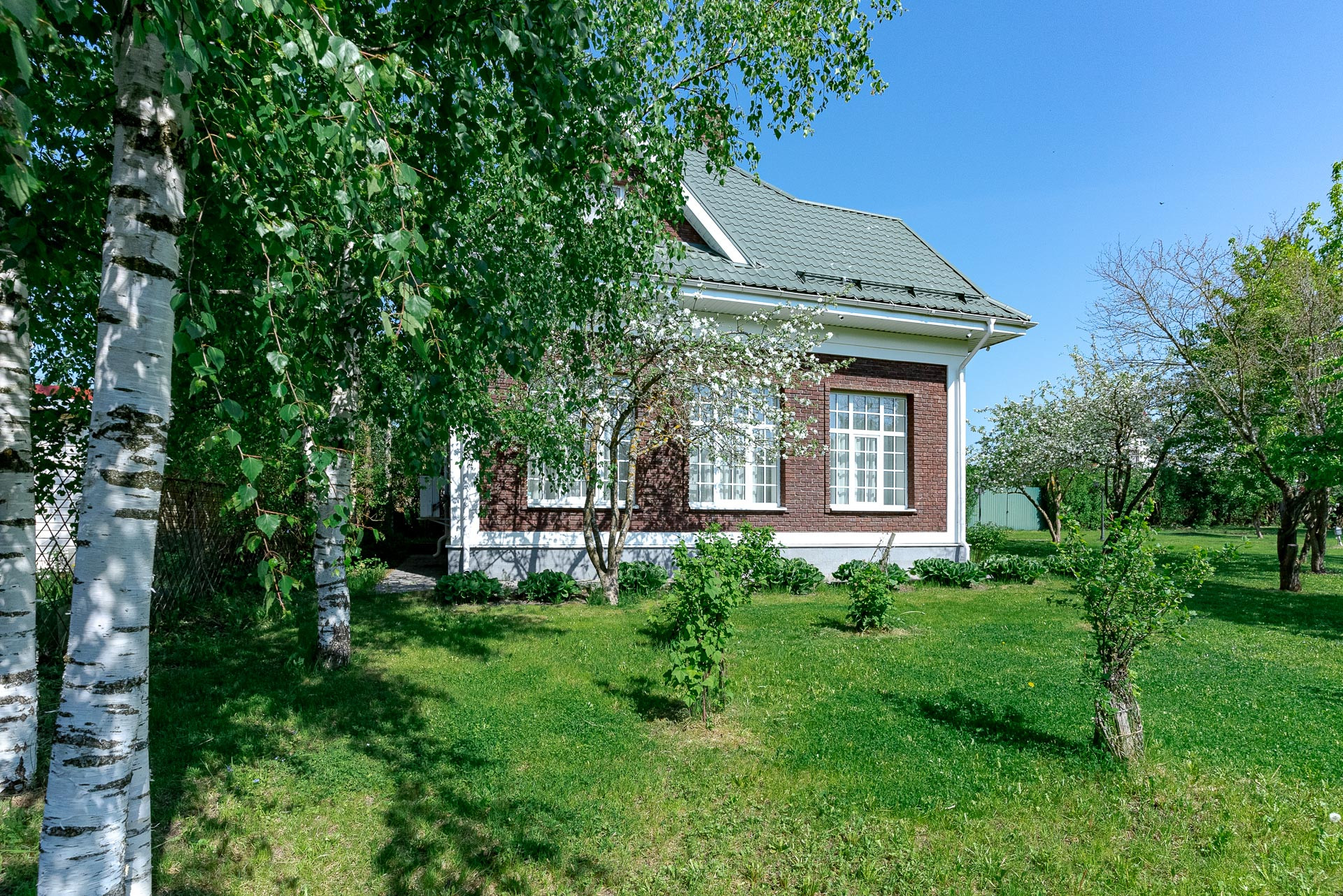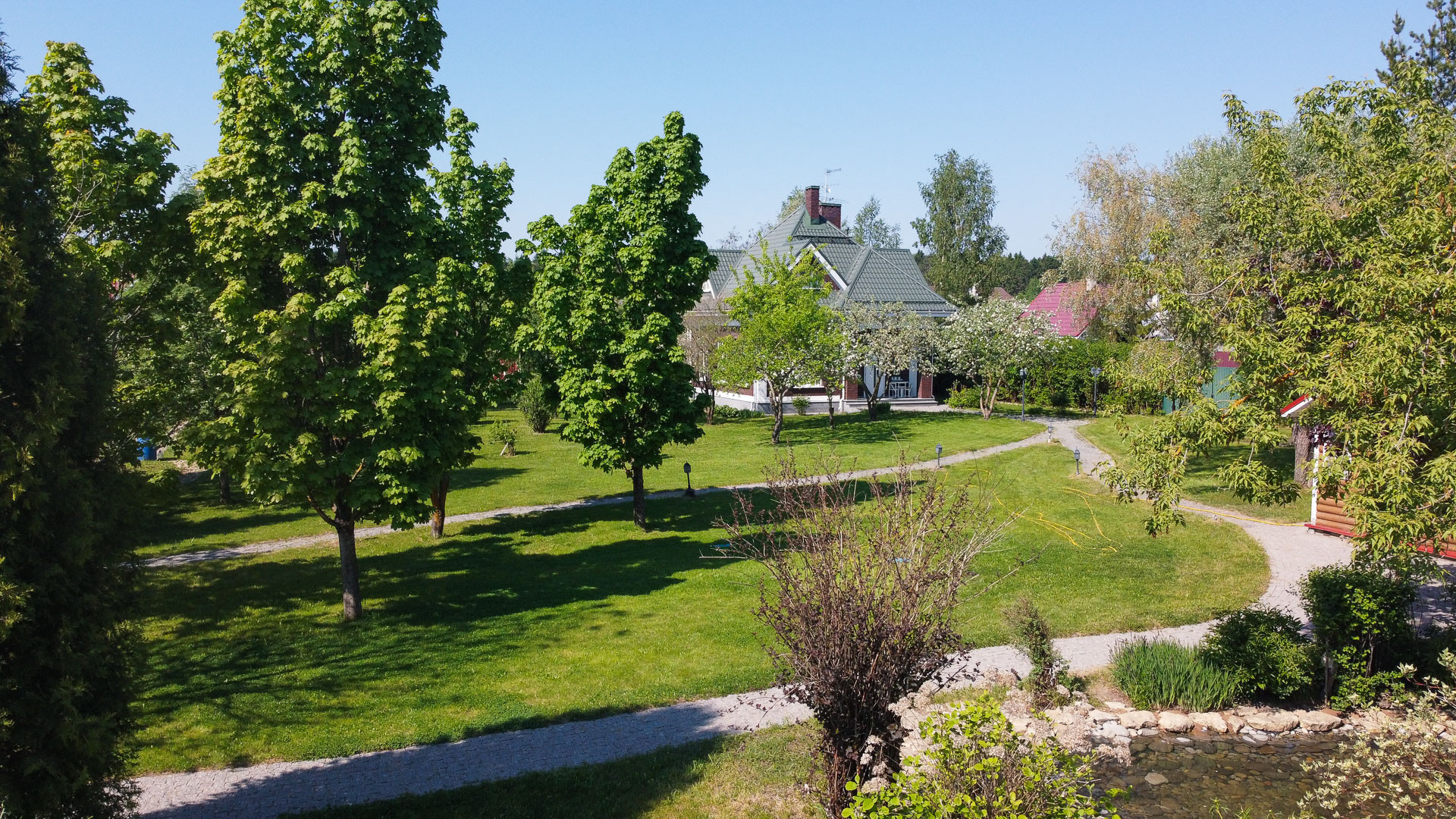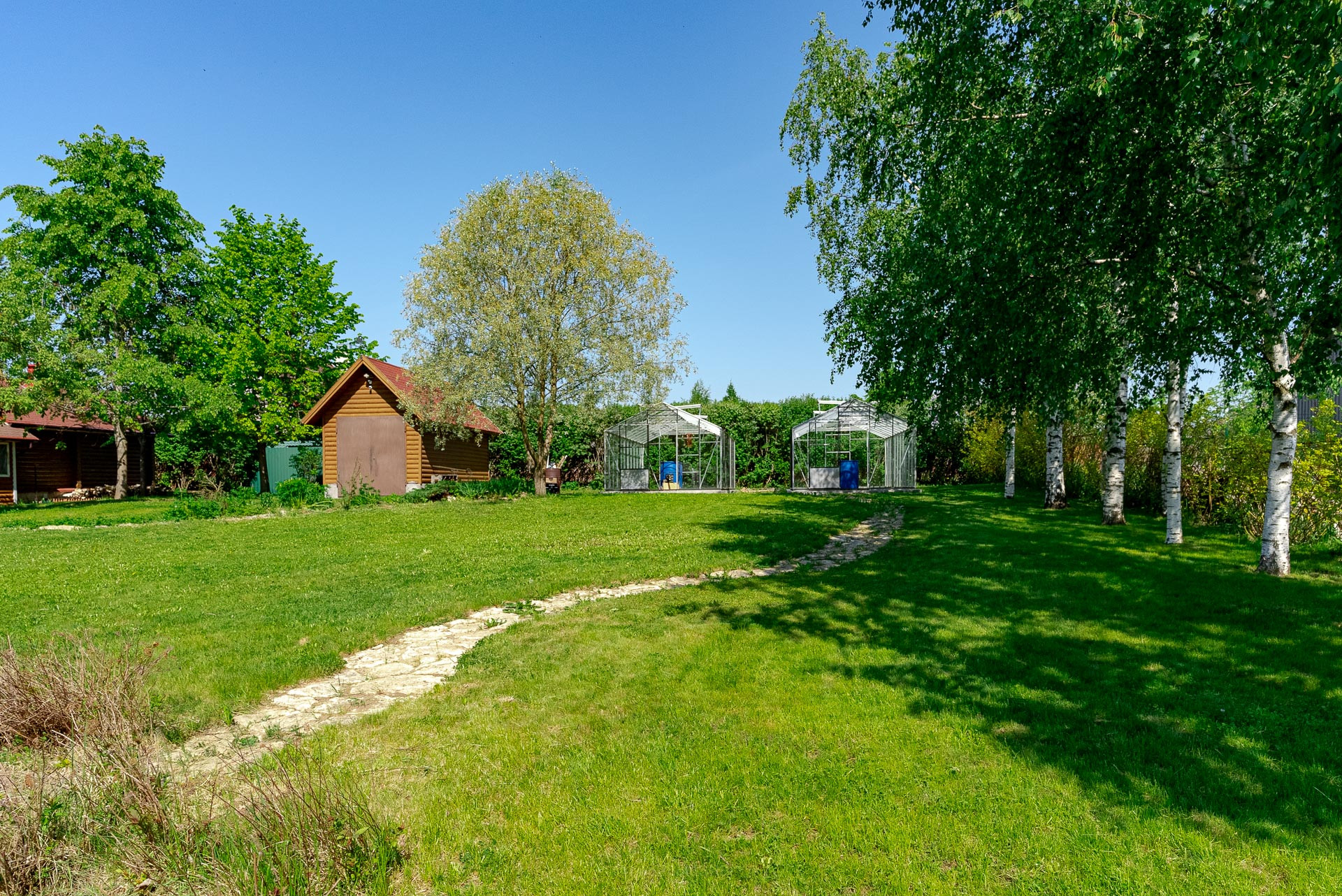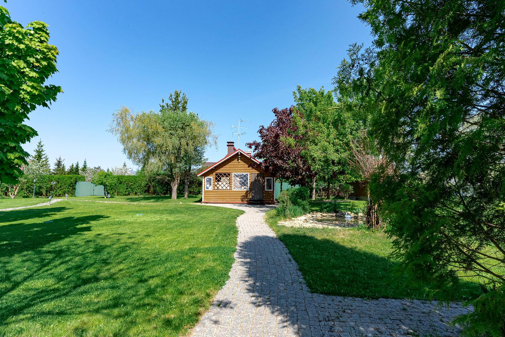 Ландшафтный дизайн участка также продуман: четкие формы клумб и газонов, мощеные дорожки, водоем, много плодоносящих деревьев. Дополнительные постройки: баня на дровах, зона барбекю, беседка, 2 стеклянные теплицы, хоз. постройка для хранения с погребом.