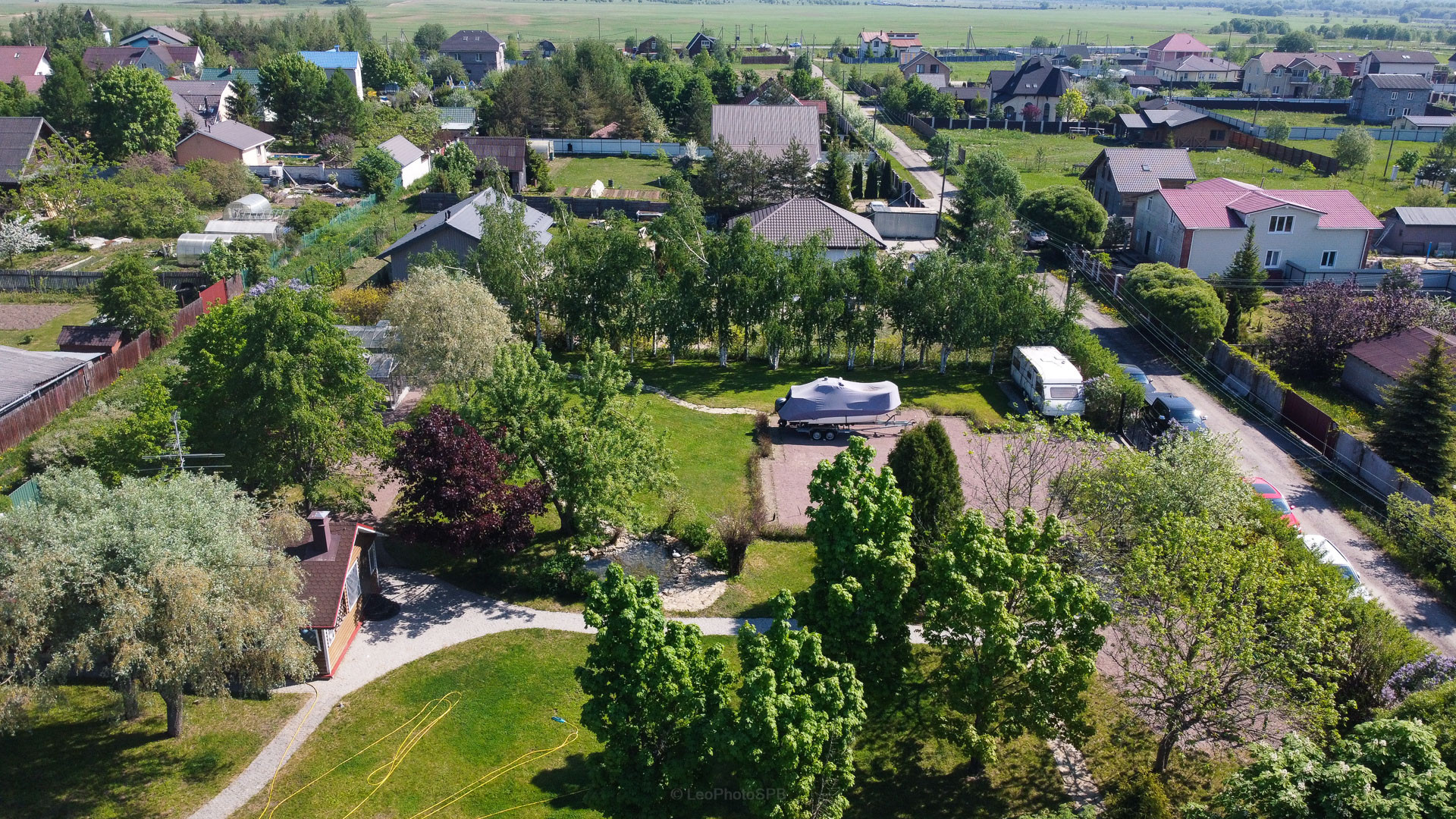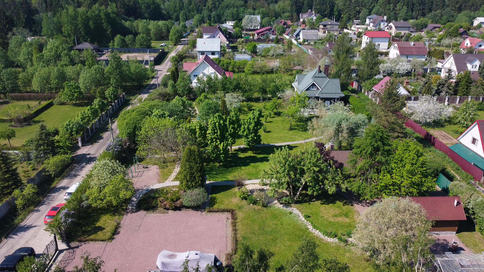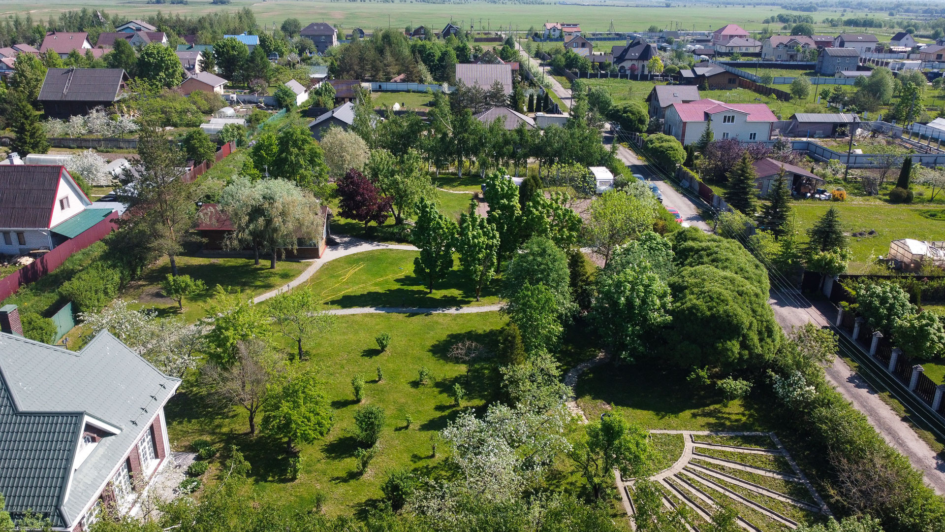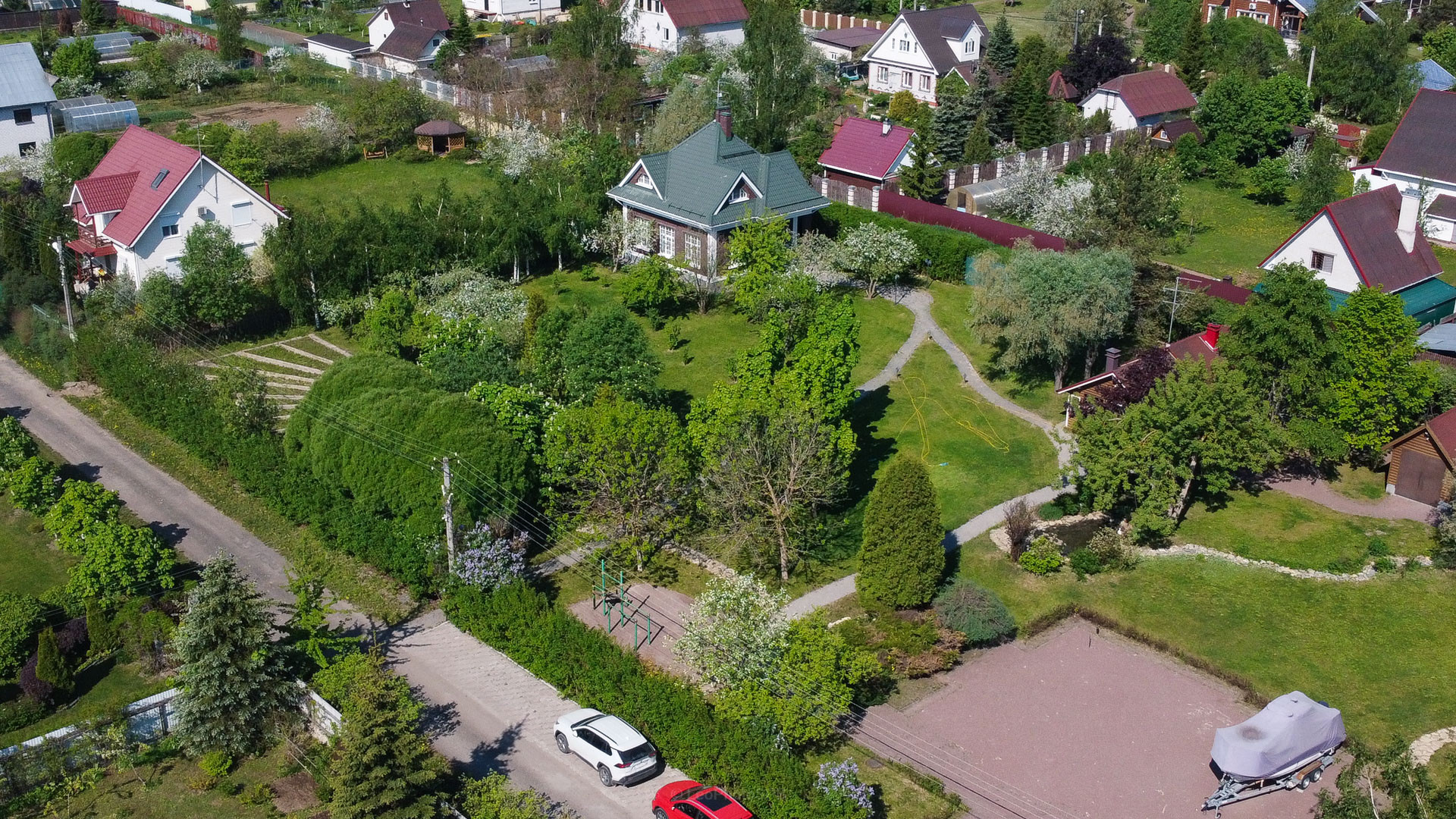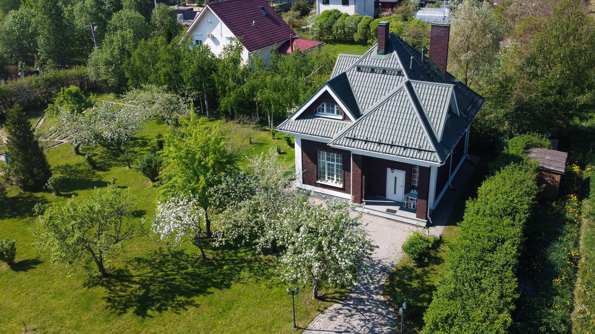 Ландшафтный дизайн участка также продуман: четкие формы клумб и газонов, мощеные дорожки, водоем, много плодоносящих деревьев. Дополнительные постройки: баня на дровах, зона барбекю, беседка, 2 стеклянные теплицы, хоз. постройка для хранения с погребом.
