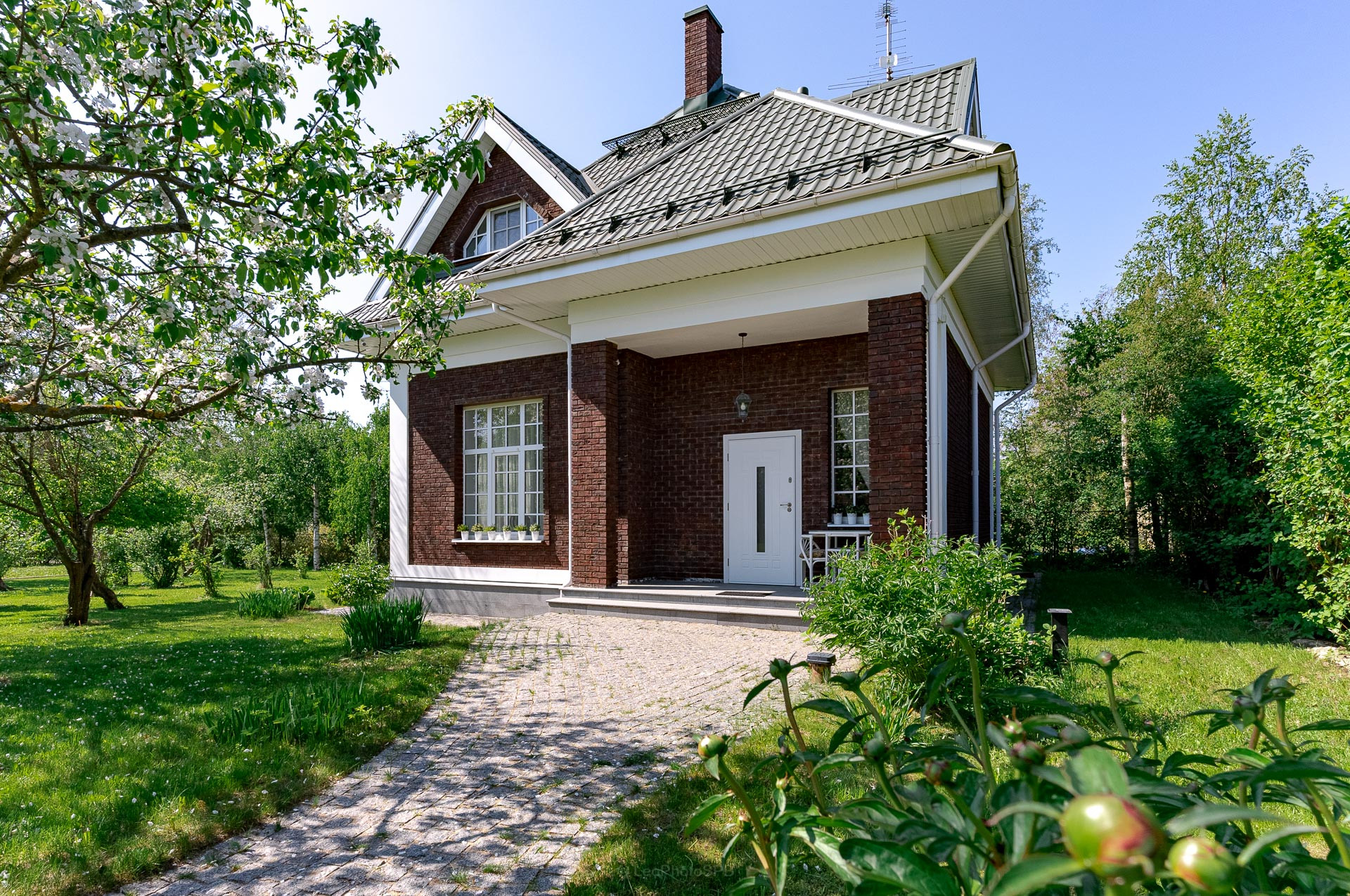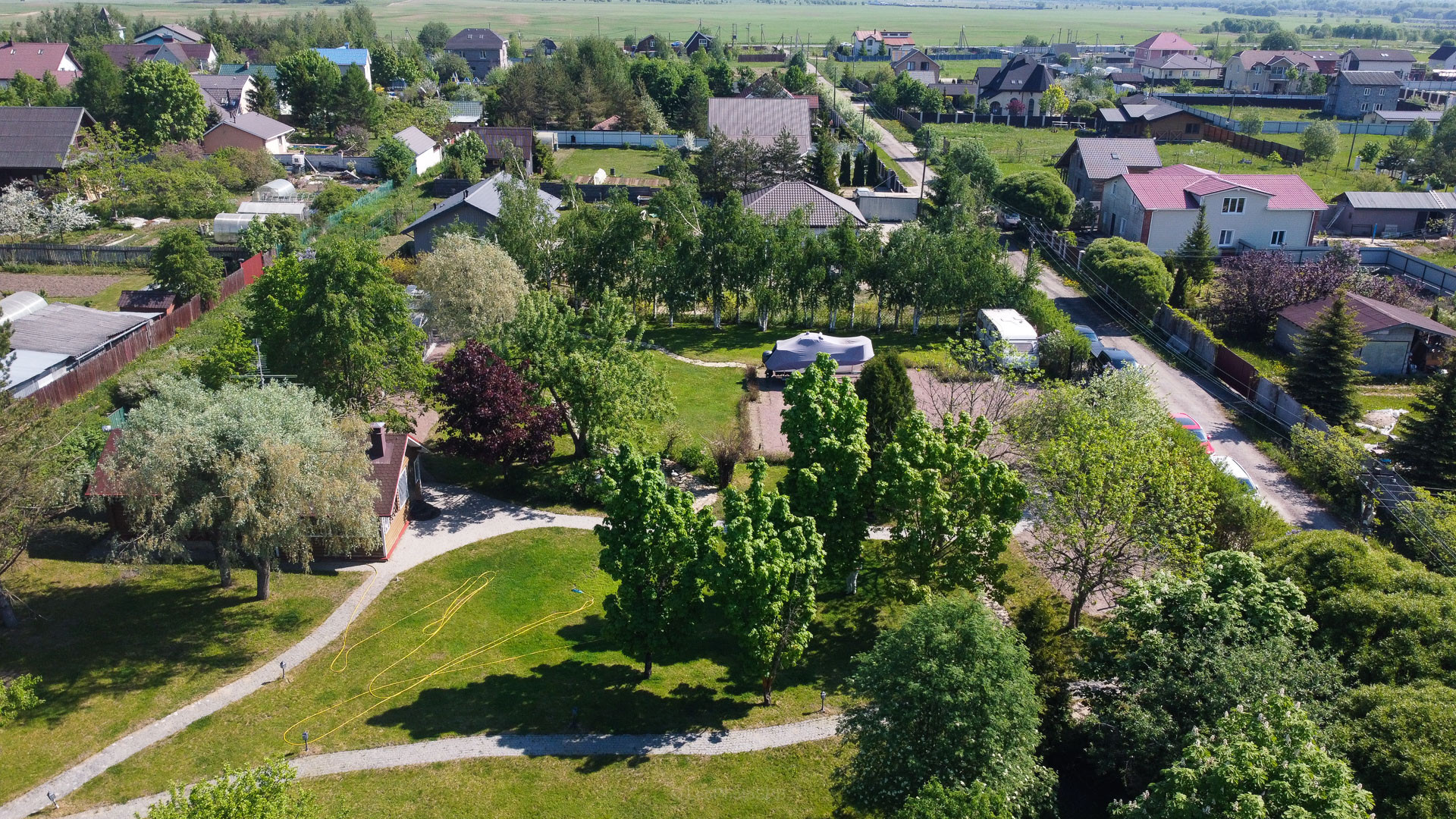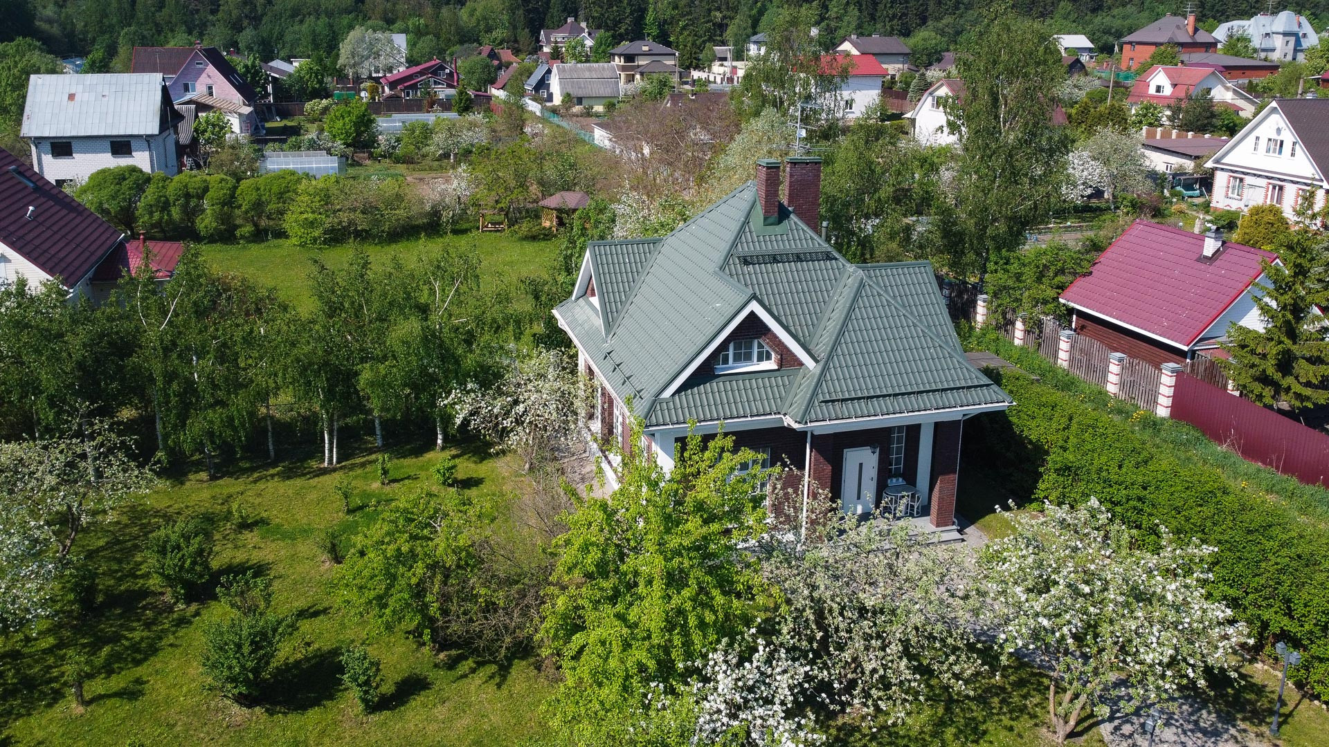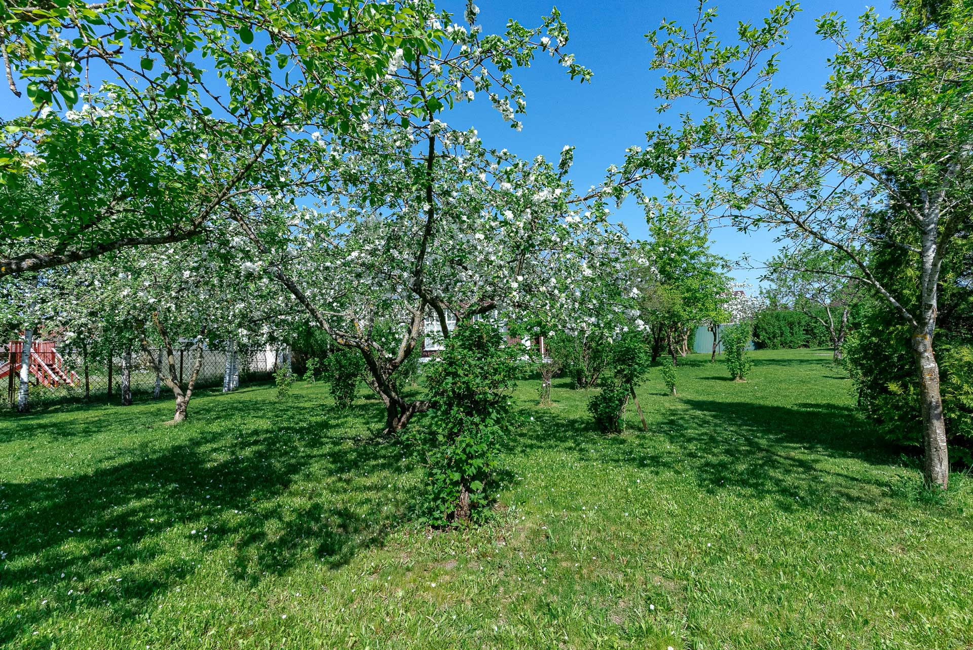 Ландшафтный дизайн участка также продуман: четкие формы клумб и газонов, мощеные дорожки, водоем, много плодоносящих деревьев. Дополнительные постройки: баня на дровах, зона барбекю, беседка, 2 стеклянные теплицы, хоз. постройка для хранения с погребом.