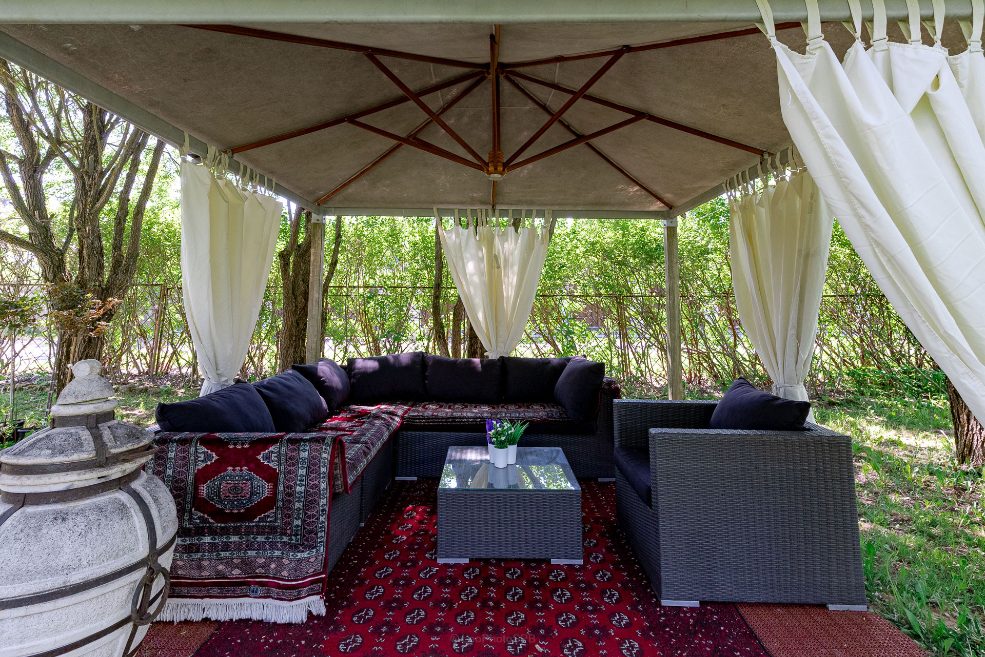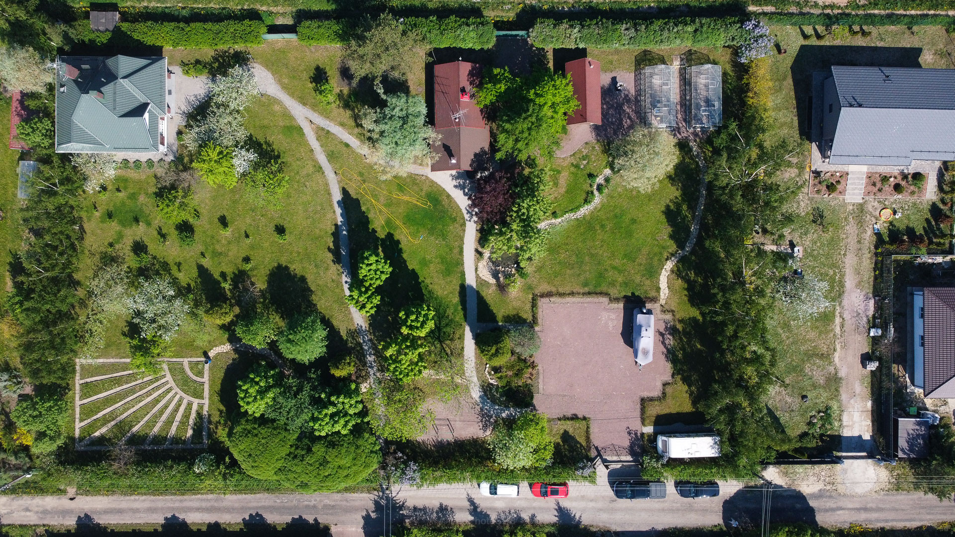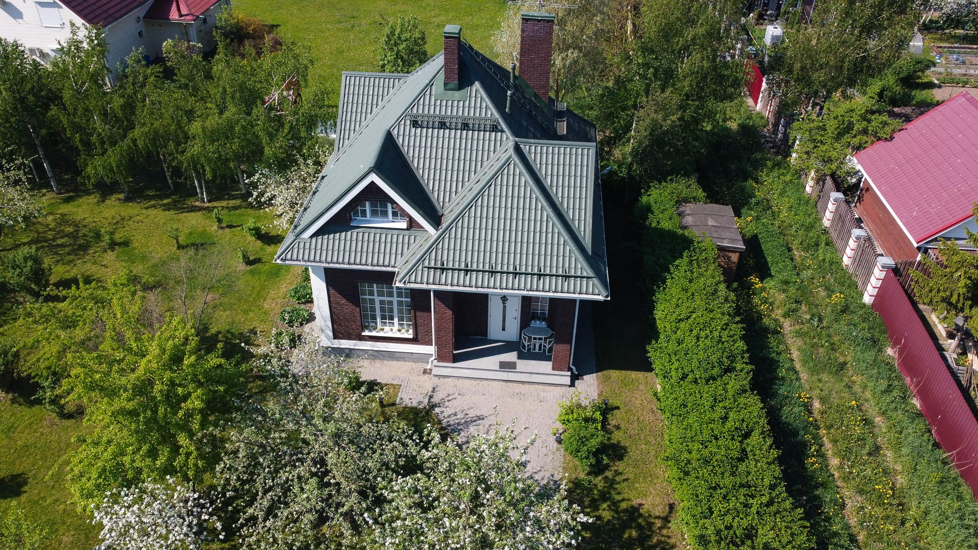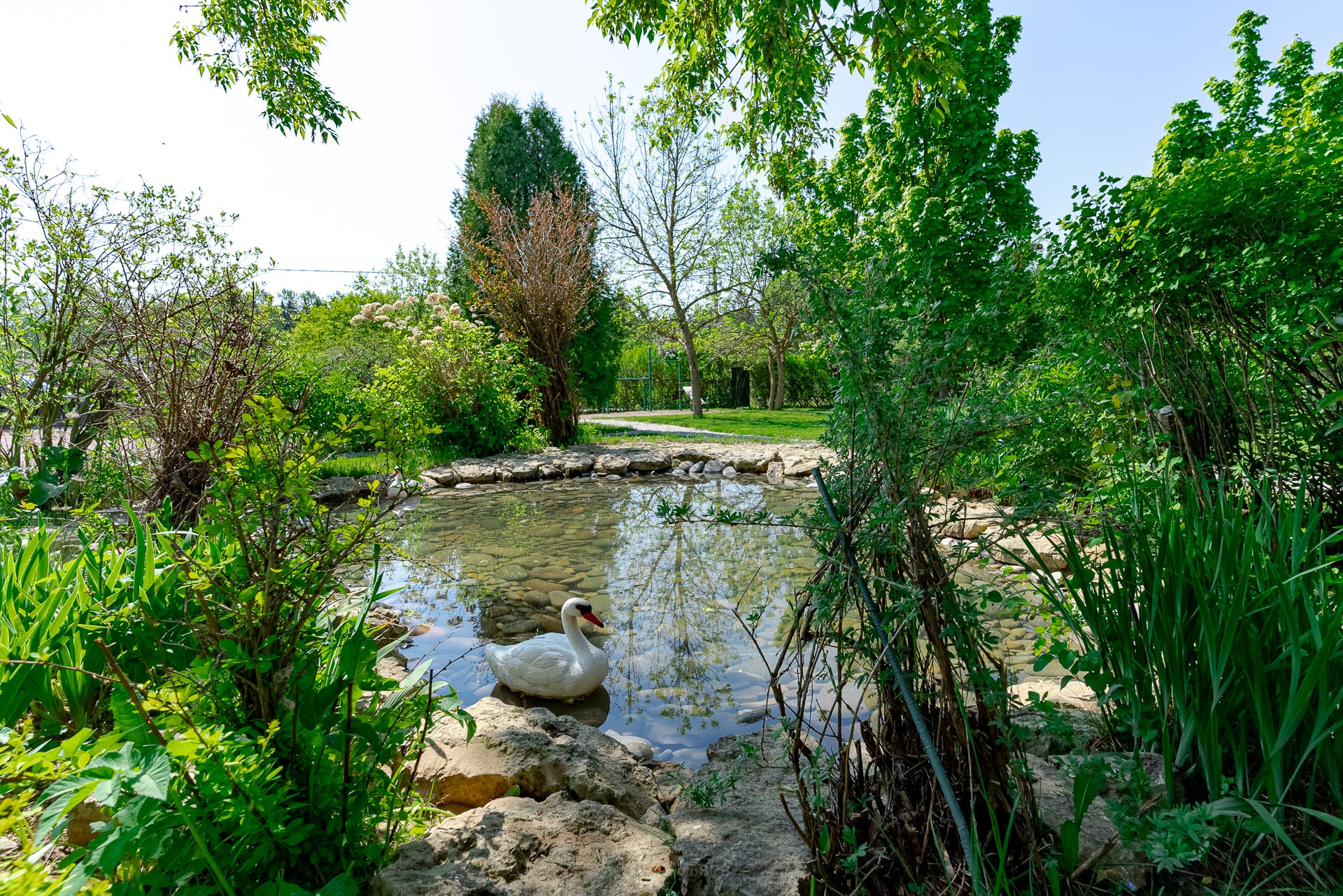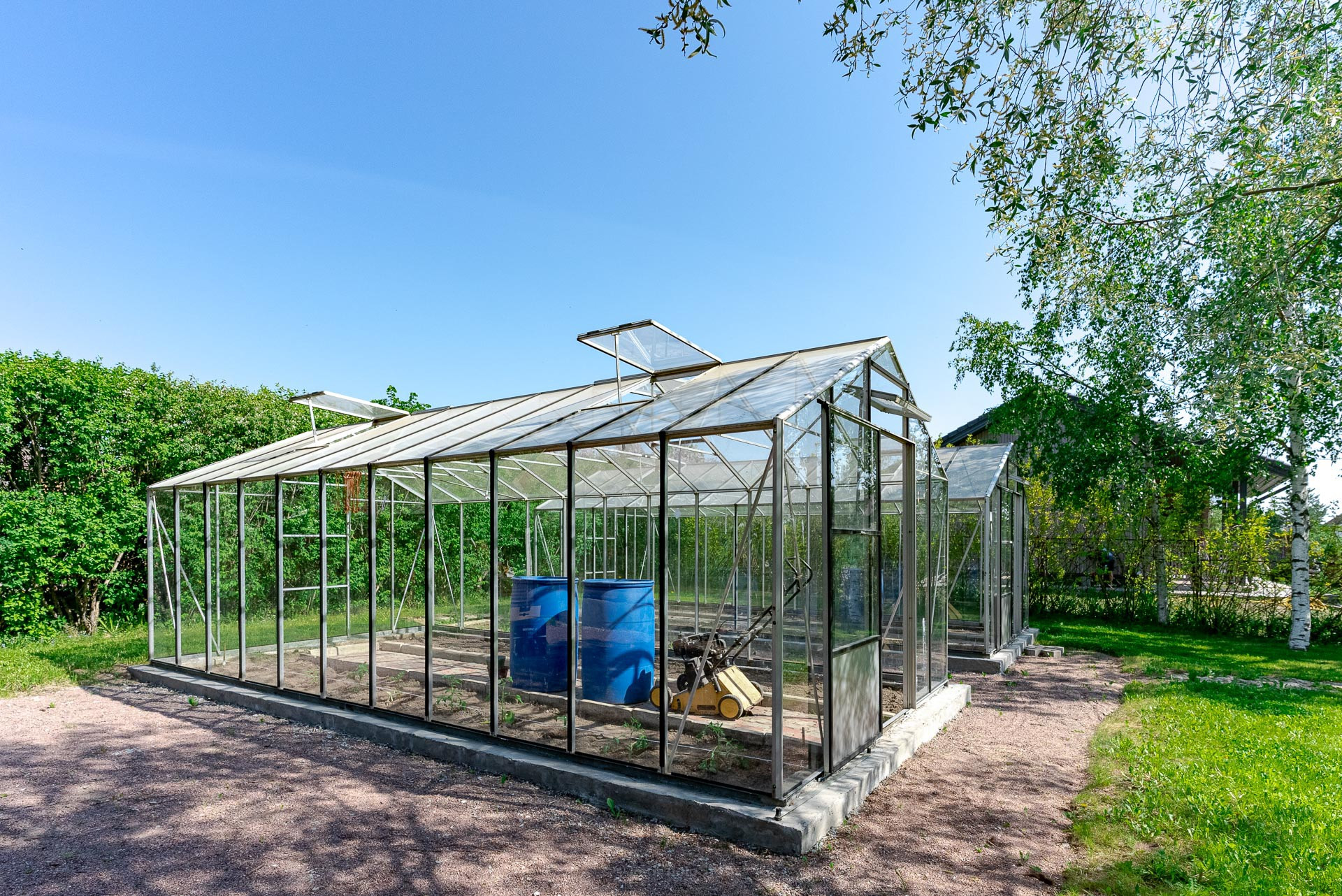 Ландшафтный дизайн участка также продуман: четкие формы клумб и газонов, мощеные дорожки, водоем, много плодоносящих деревьев. Дополнительные постройки: баня на дровах, зона барбекю, беседка, 2 стеклянные теплицы, хоз. постройка для хранения с погребом.