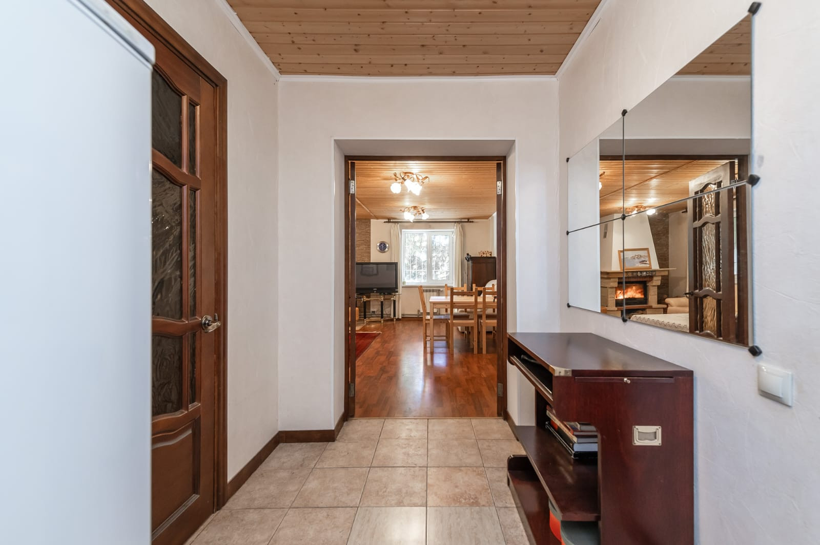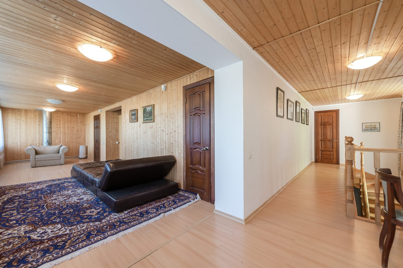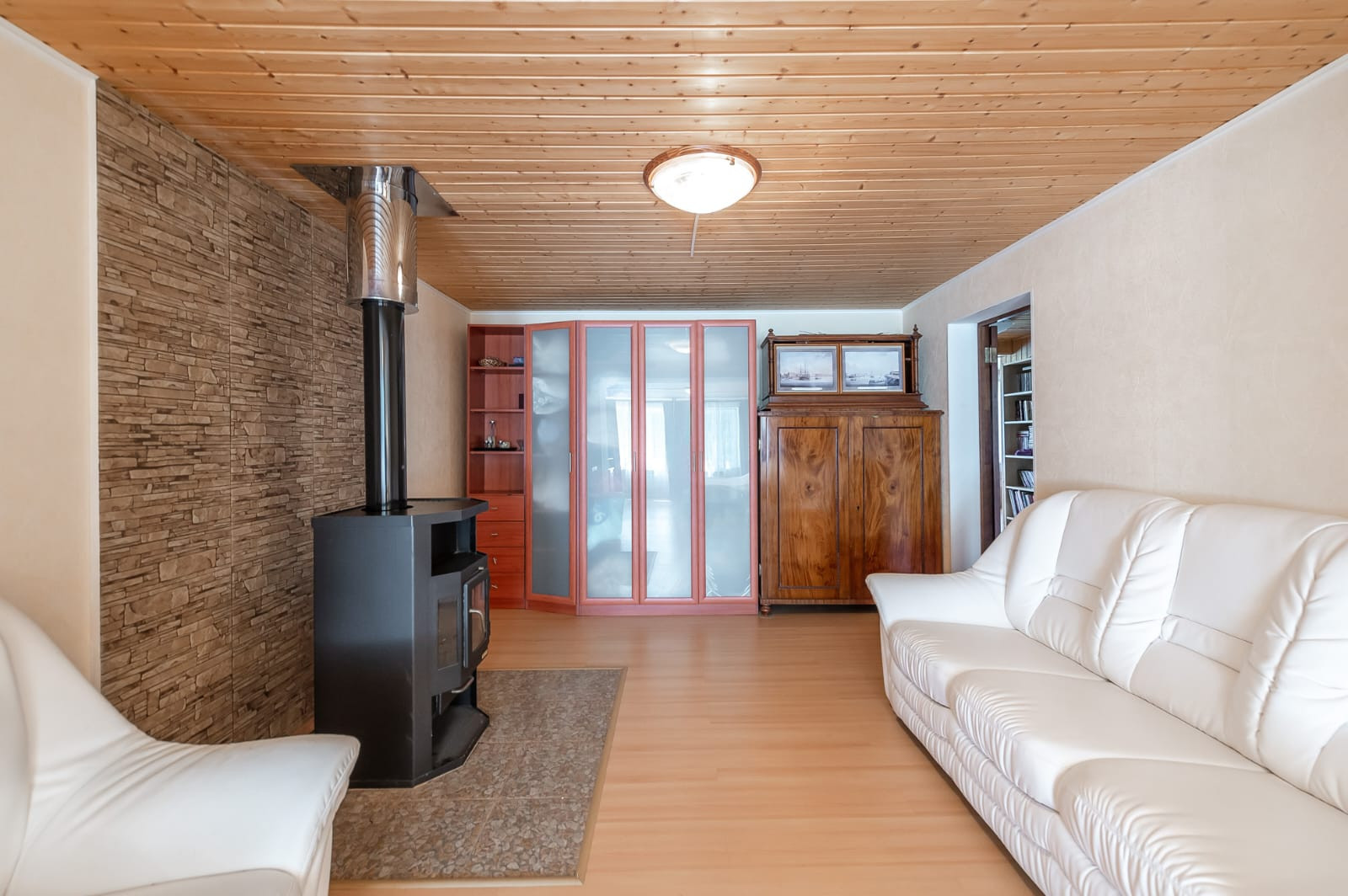 Гостиная с дровяным камином, кухня с теплыми полами, большая веранда, 4 спальни, одна из них с камином, 2 санузла, сауна. Также есть спальные места на третьем этаже.