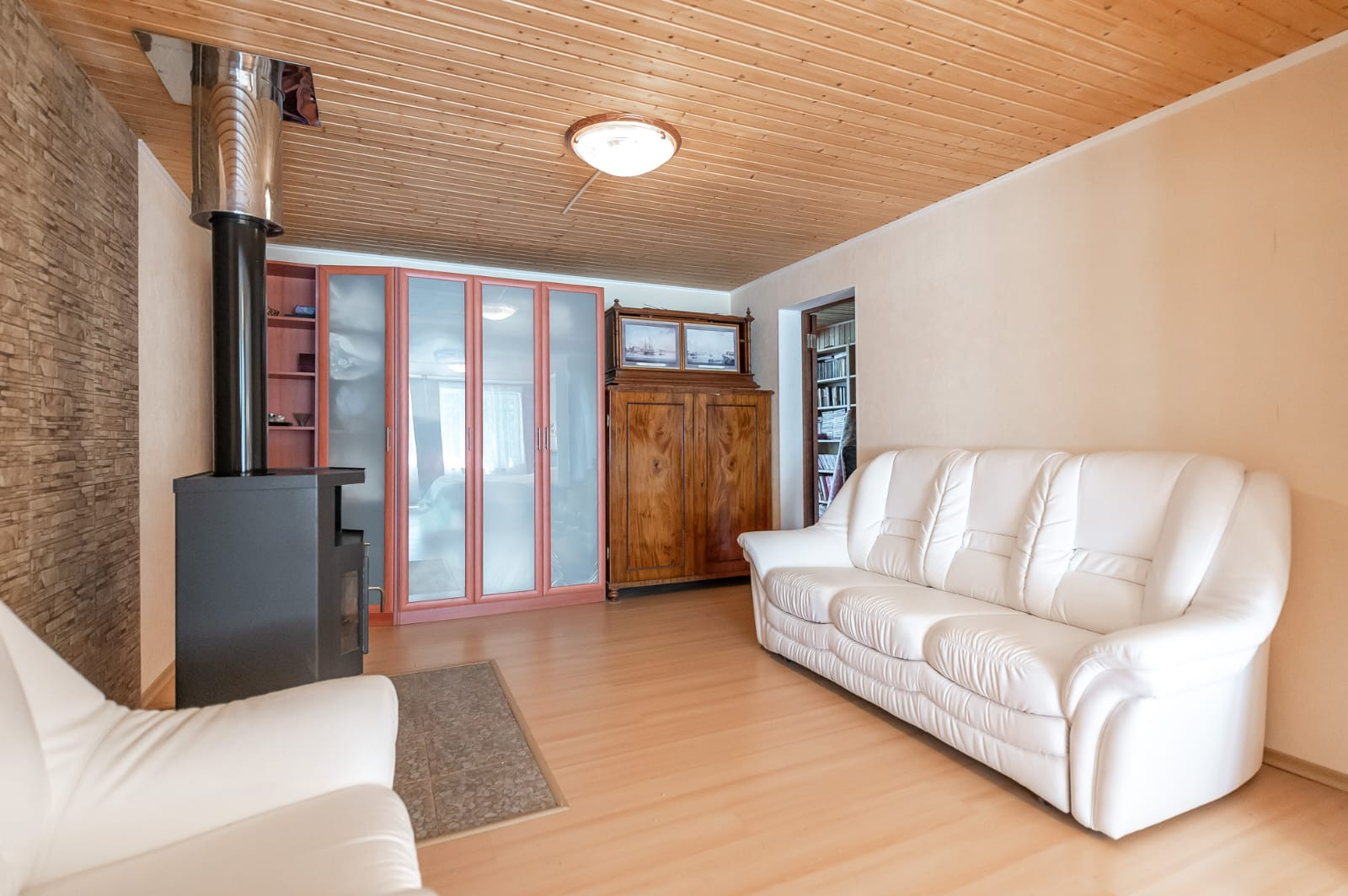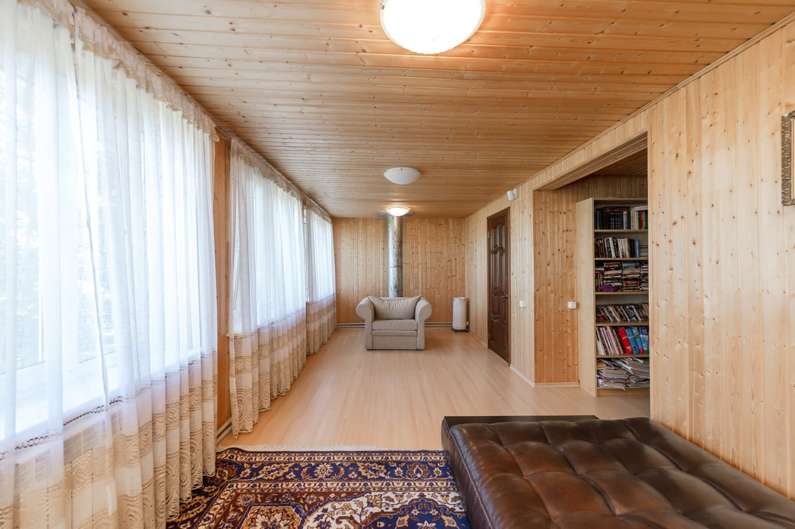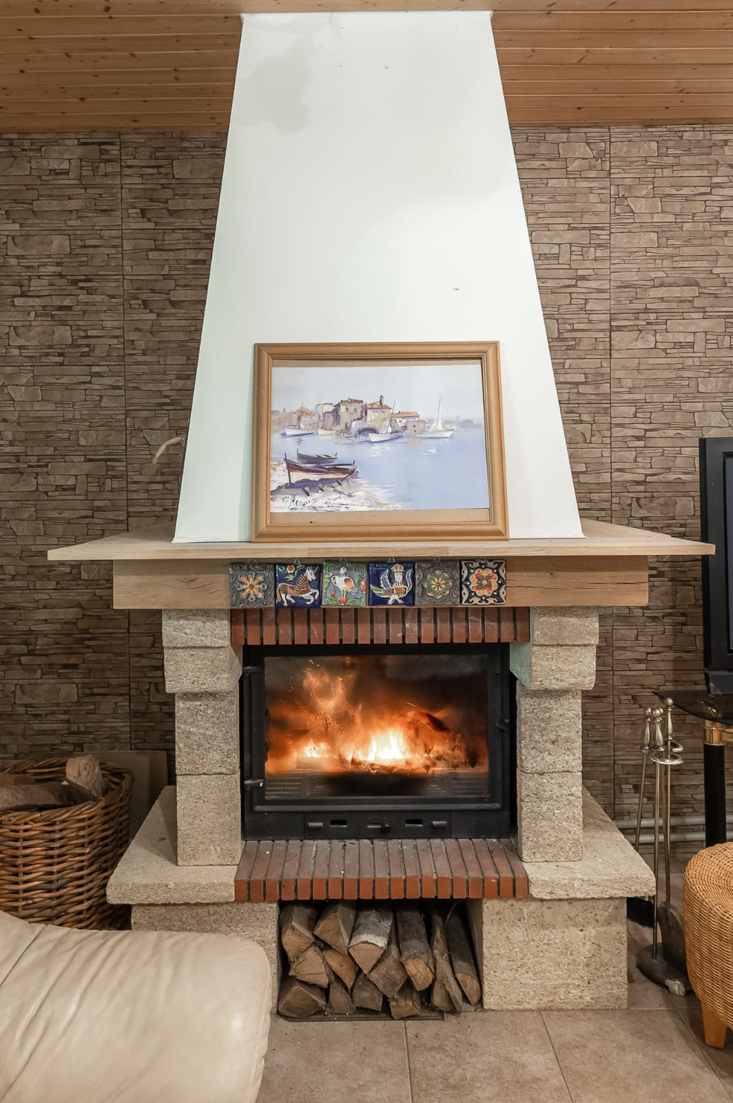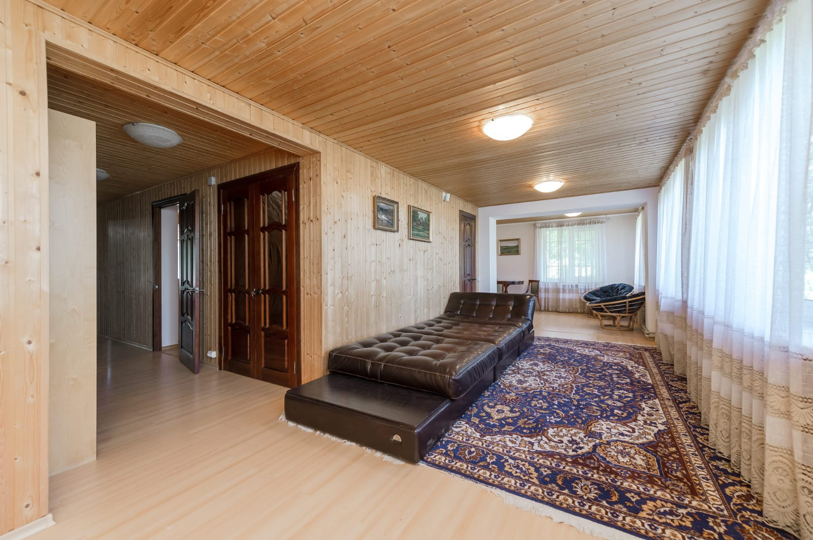 Гостиная с дровяным камином, кухня с теплыми полами, большая веранда, 4 спальни, одна из них с камином, 2 санузла, сауна. Также есть спальные места на третьем этаже.