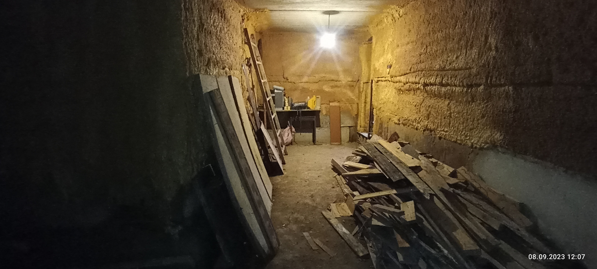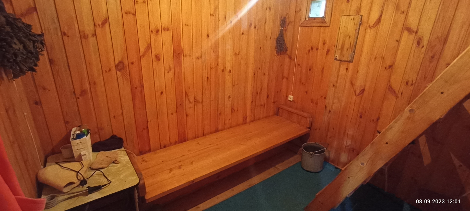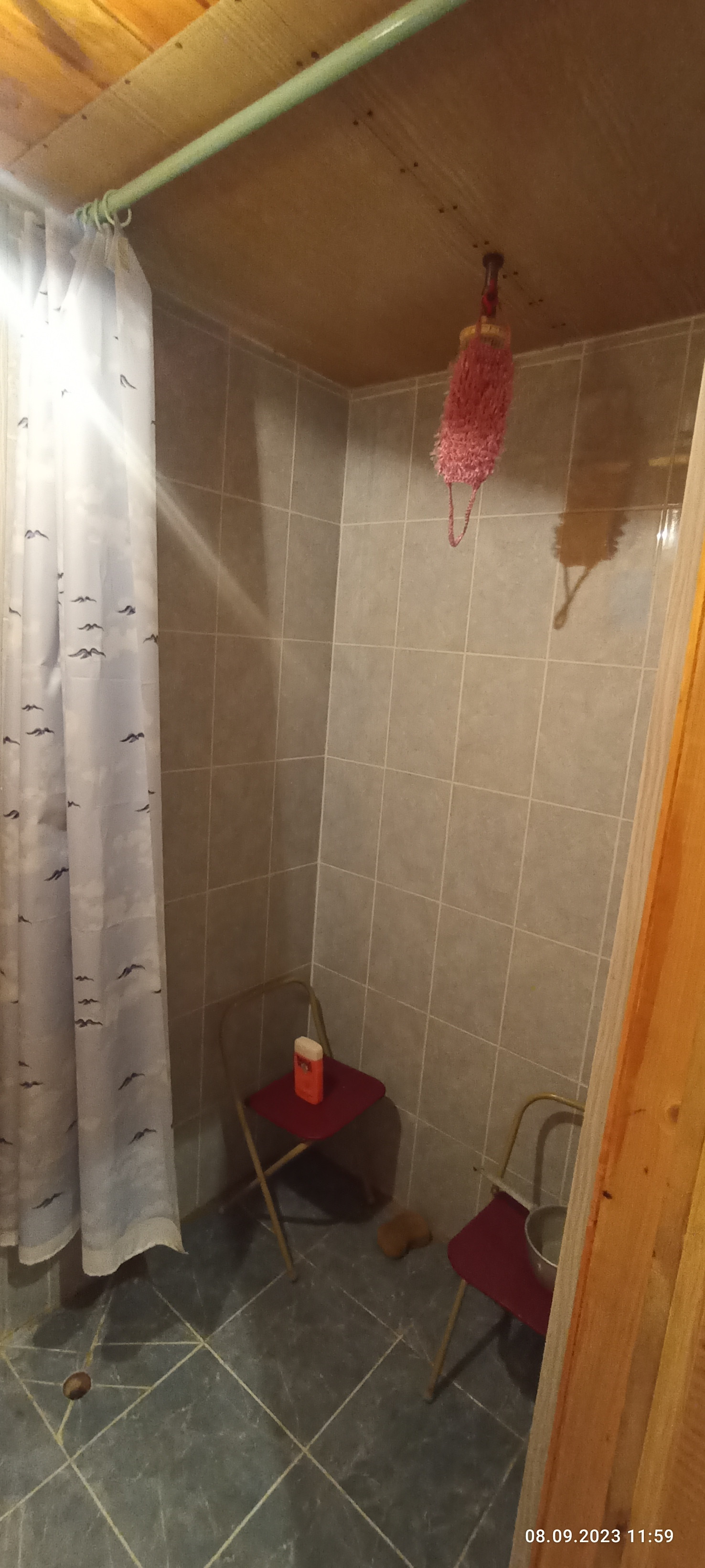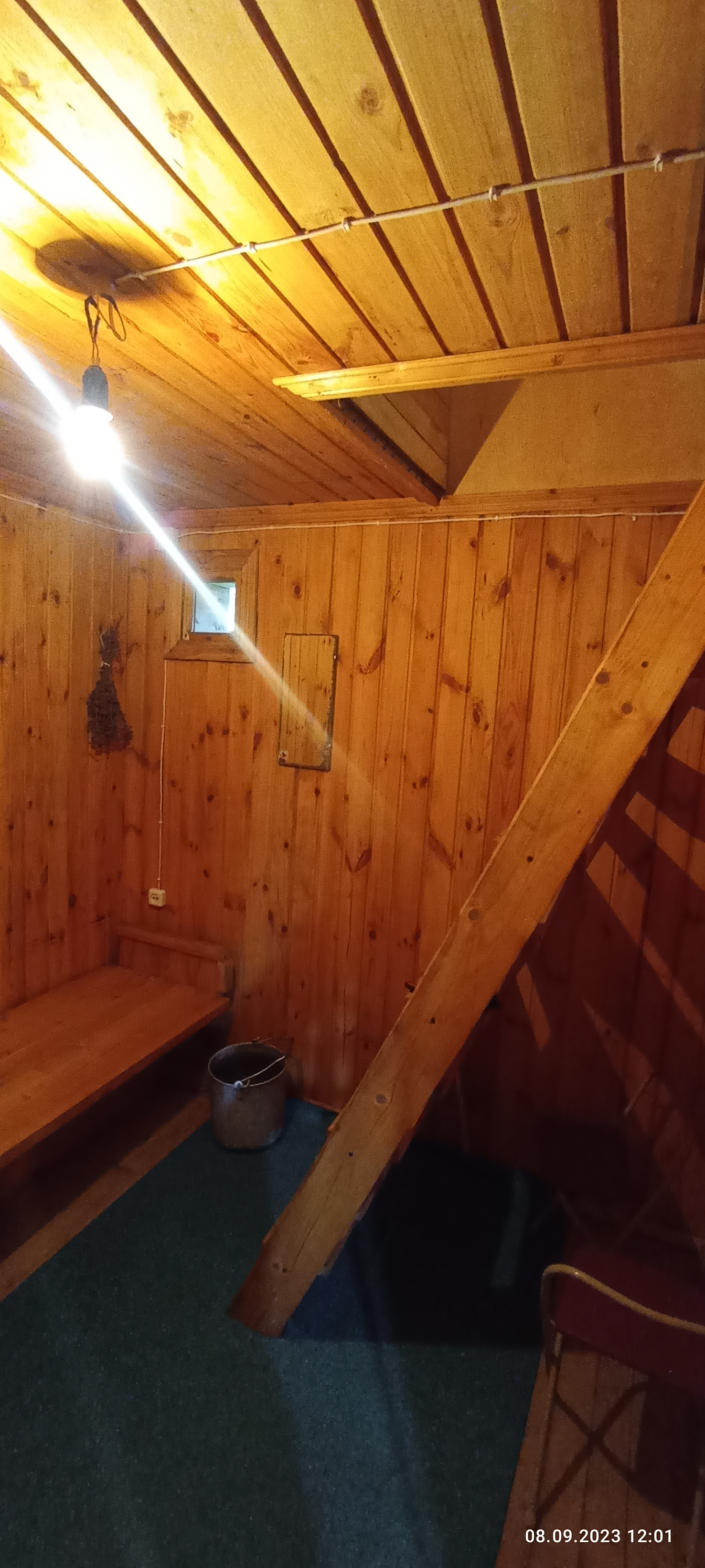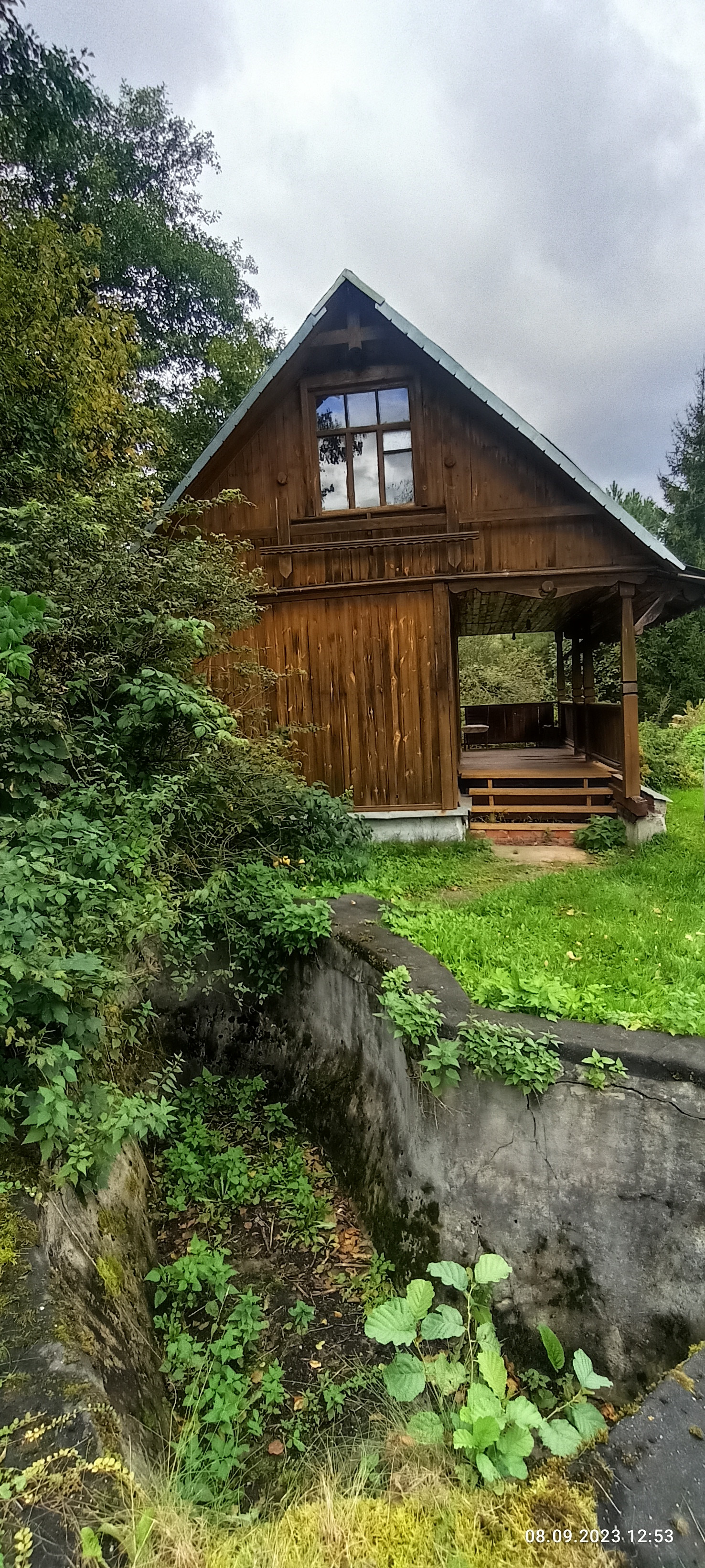 Так же на участке( на краю обрыва, в котором протекает родник из каскада прудов) расположена отдельно стоящая уютная баня, фундамент лента, стены из бруса. Внутри расположена парная с электрической печью, помывочная и комната отдыха на втором этаже. Перед баней расположена бетонная, действующая купель.