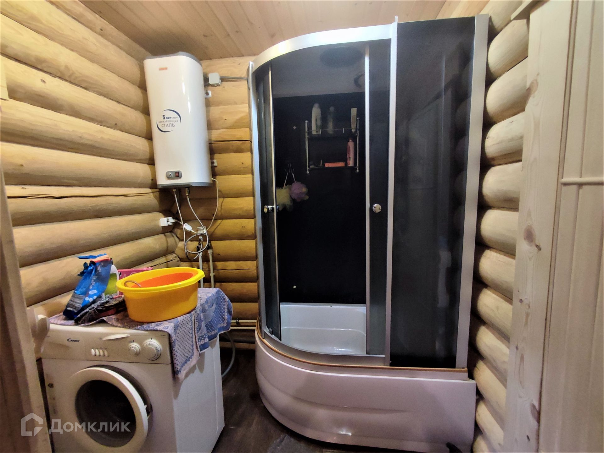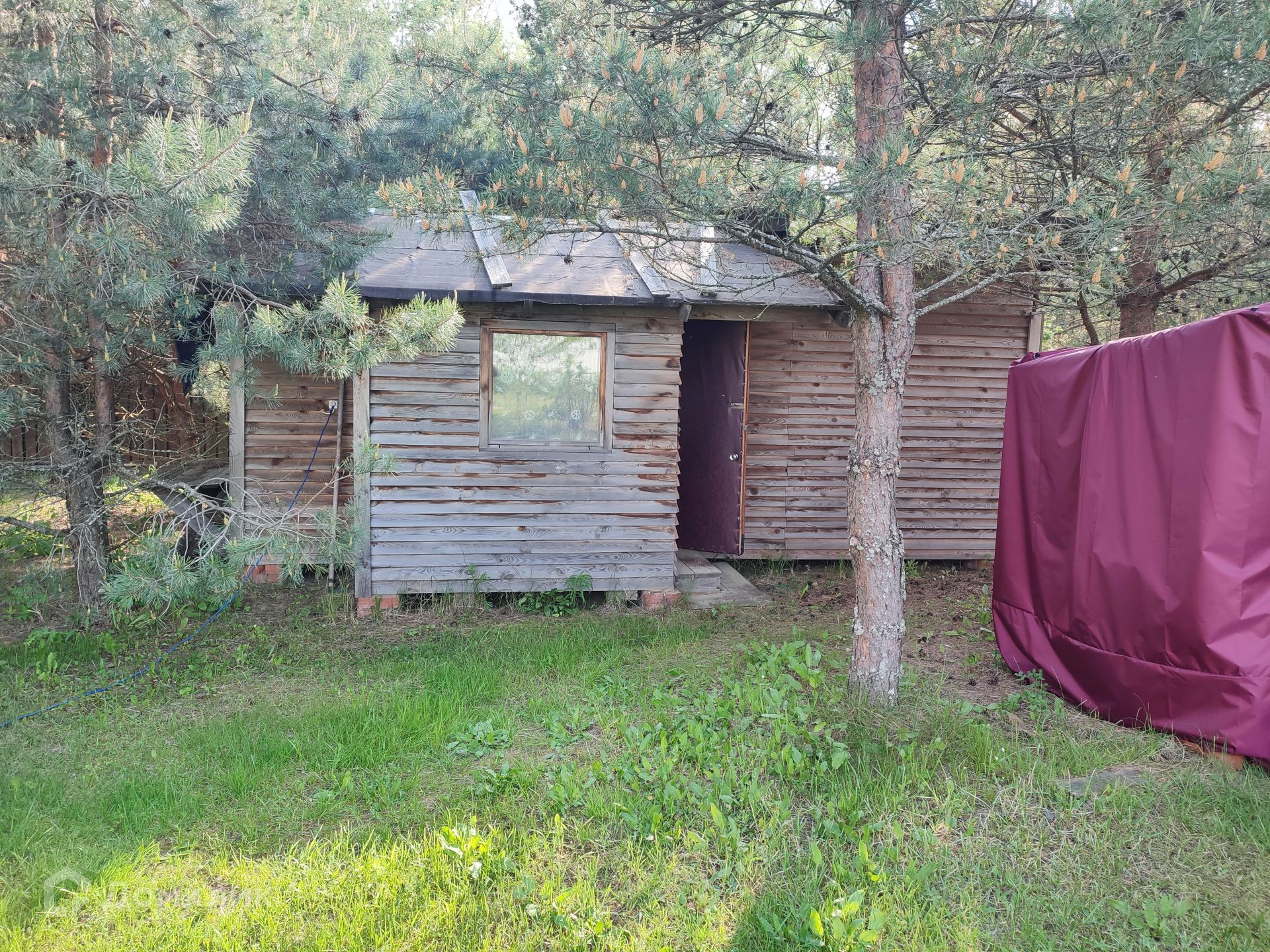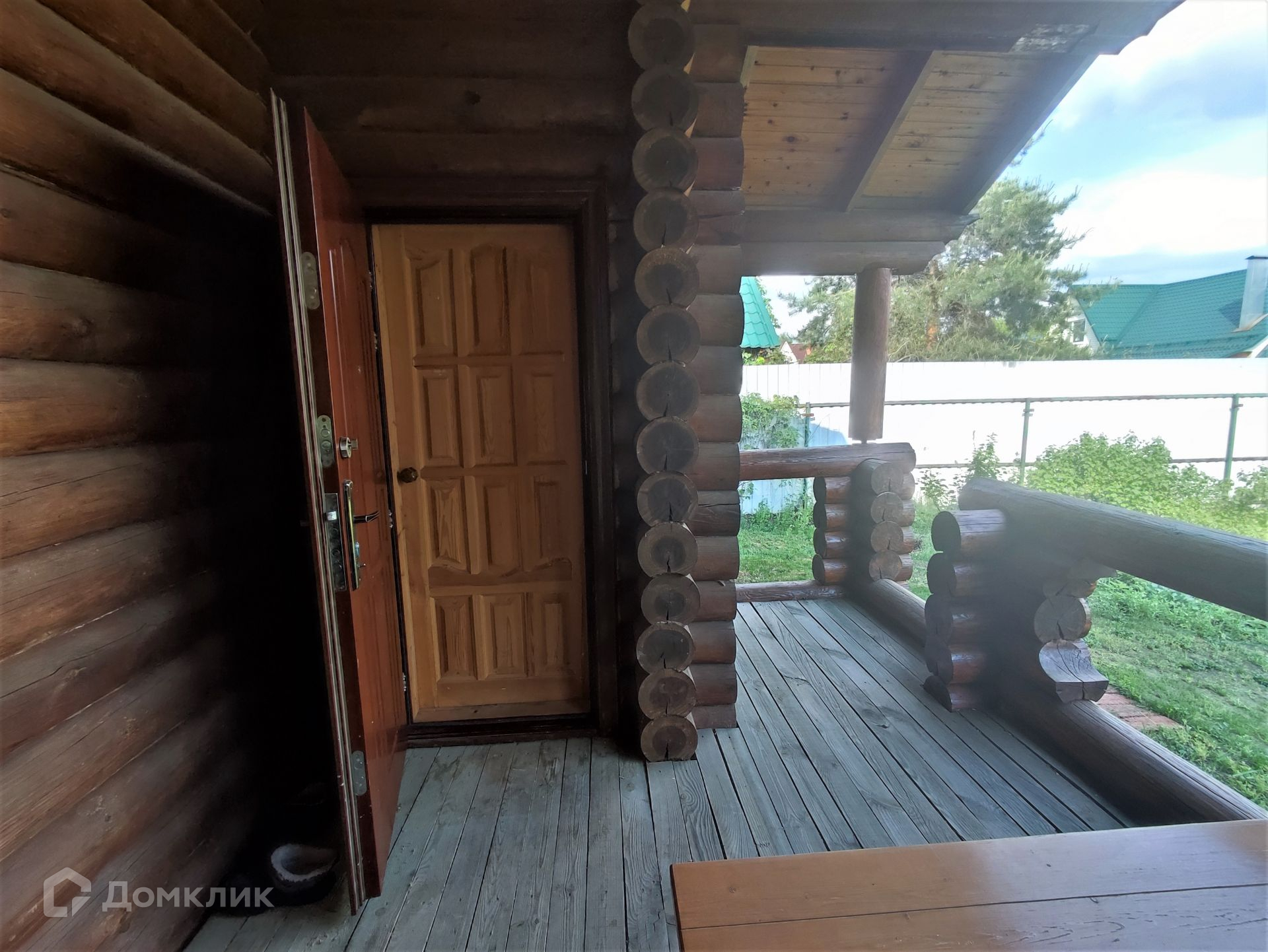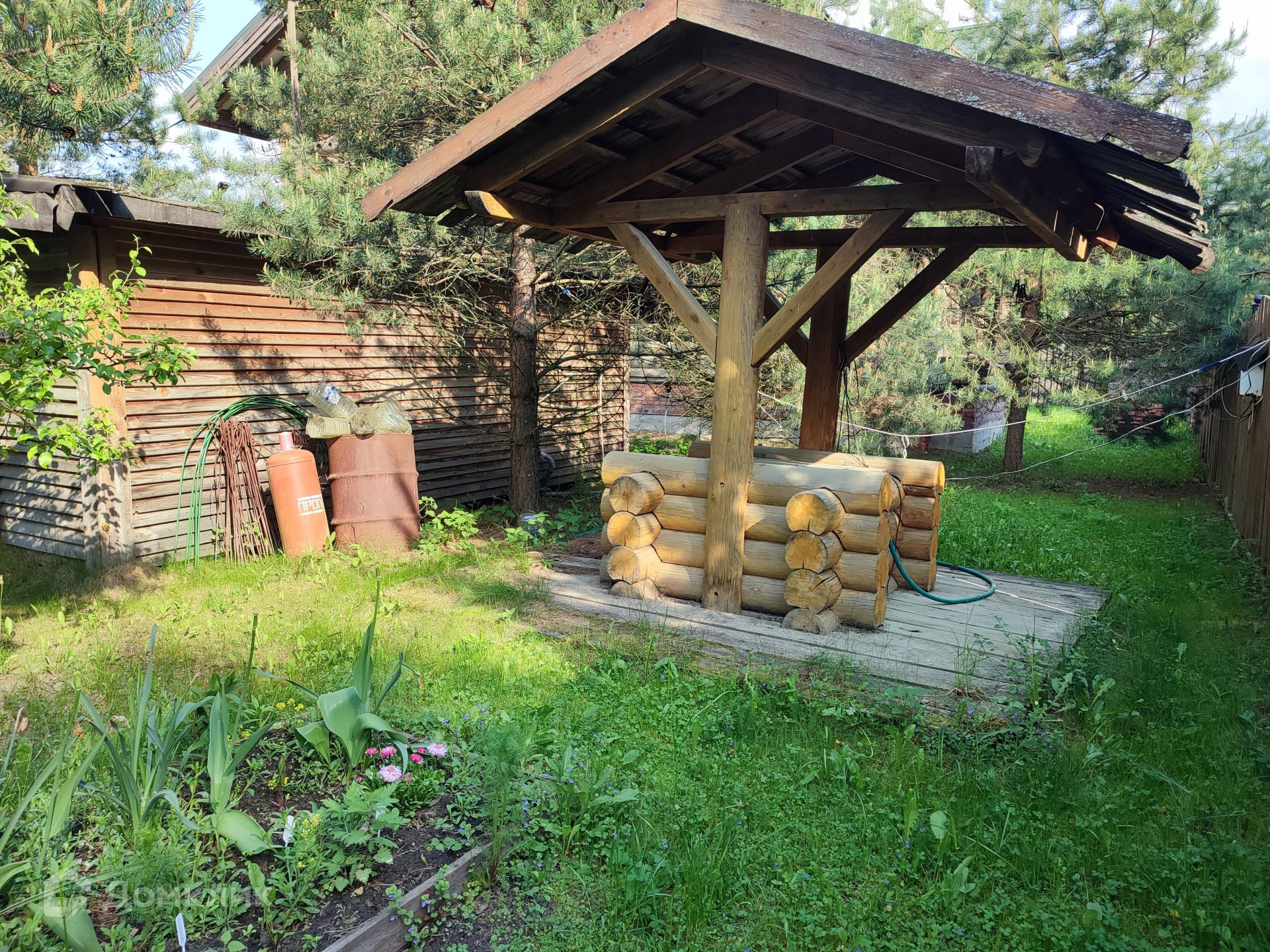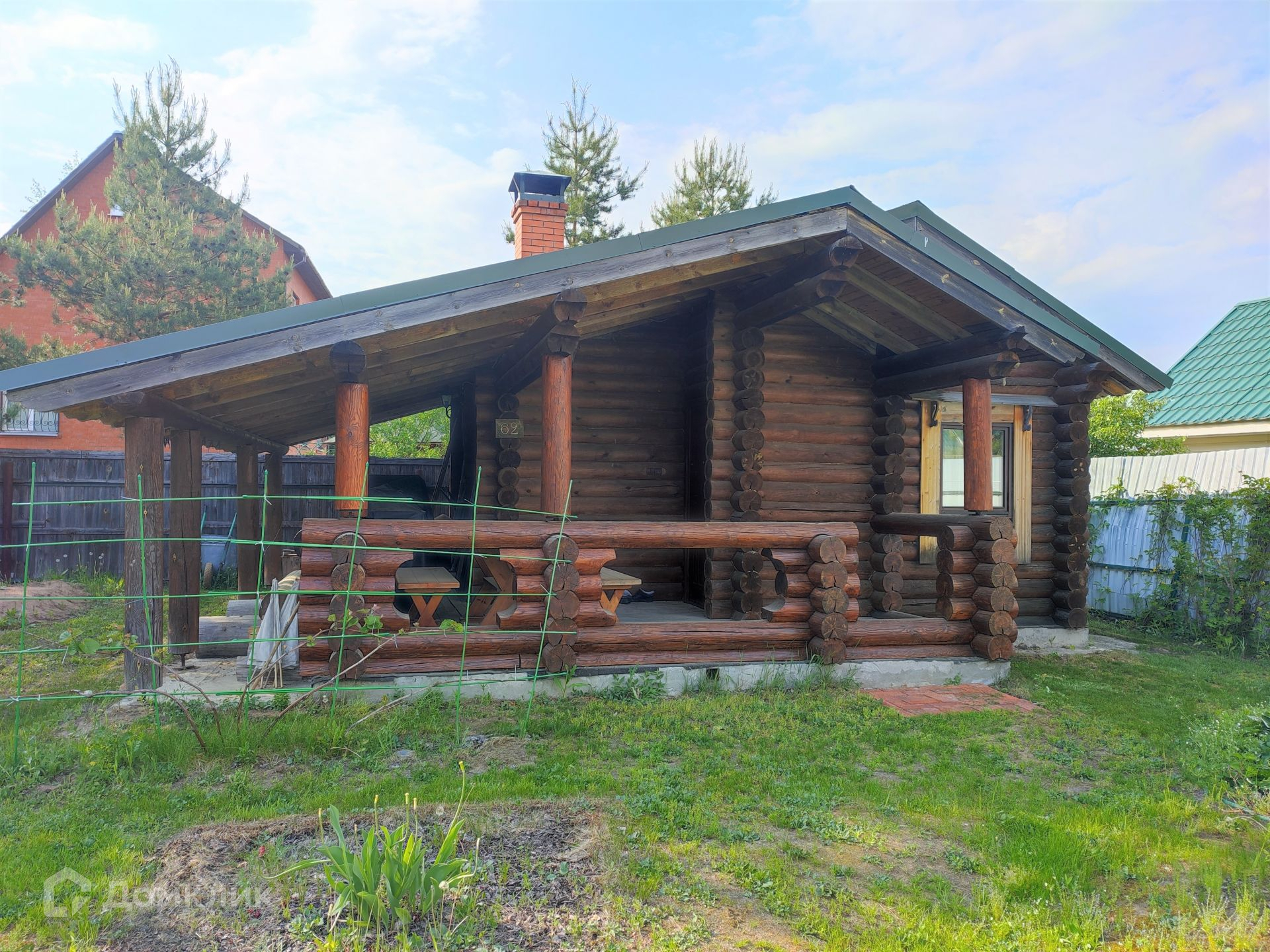 На участке стоит баня из бревна с верандой. В ней расположена комната отдыха, душевая и парная зона.