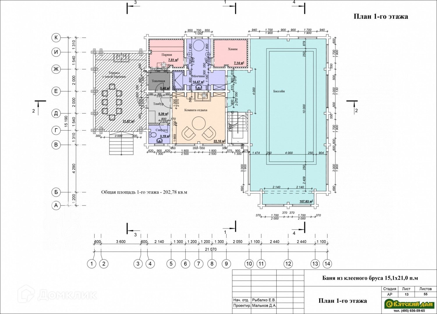 План первого этажа - прихожая, русская баня, хамам, помывочная, комната отдыха, с/у, бассейн, открытая терраса с зоной барбекю.