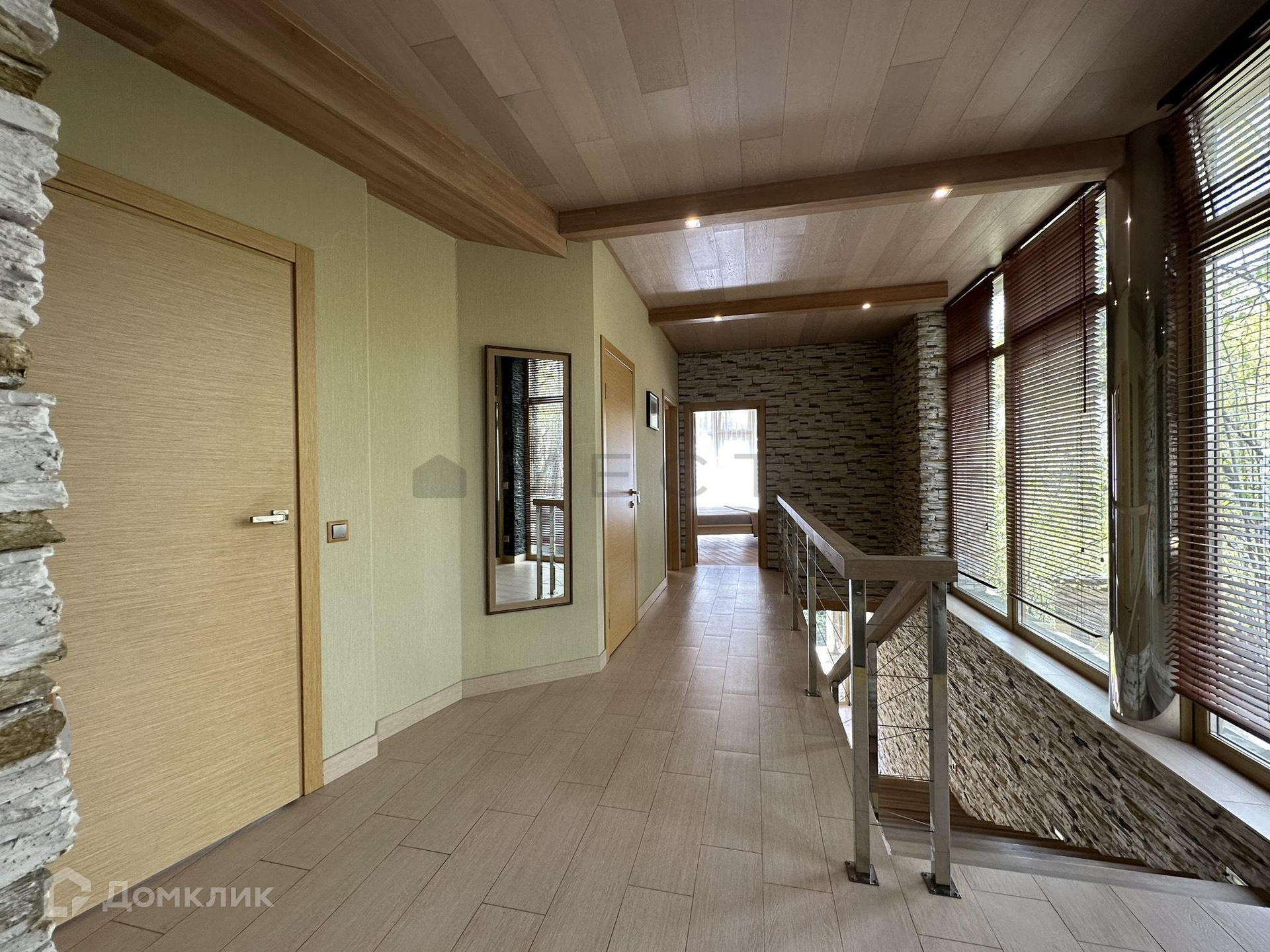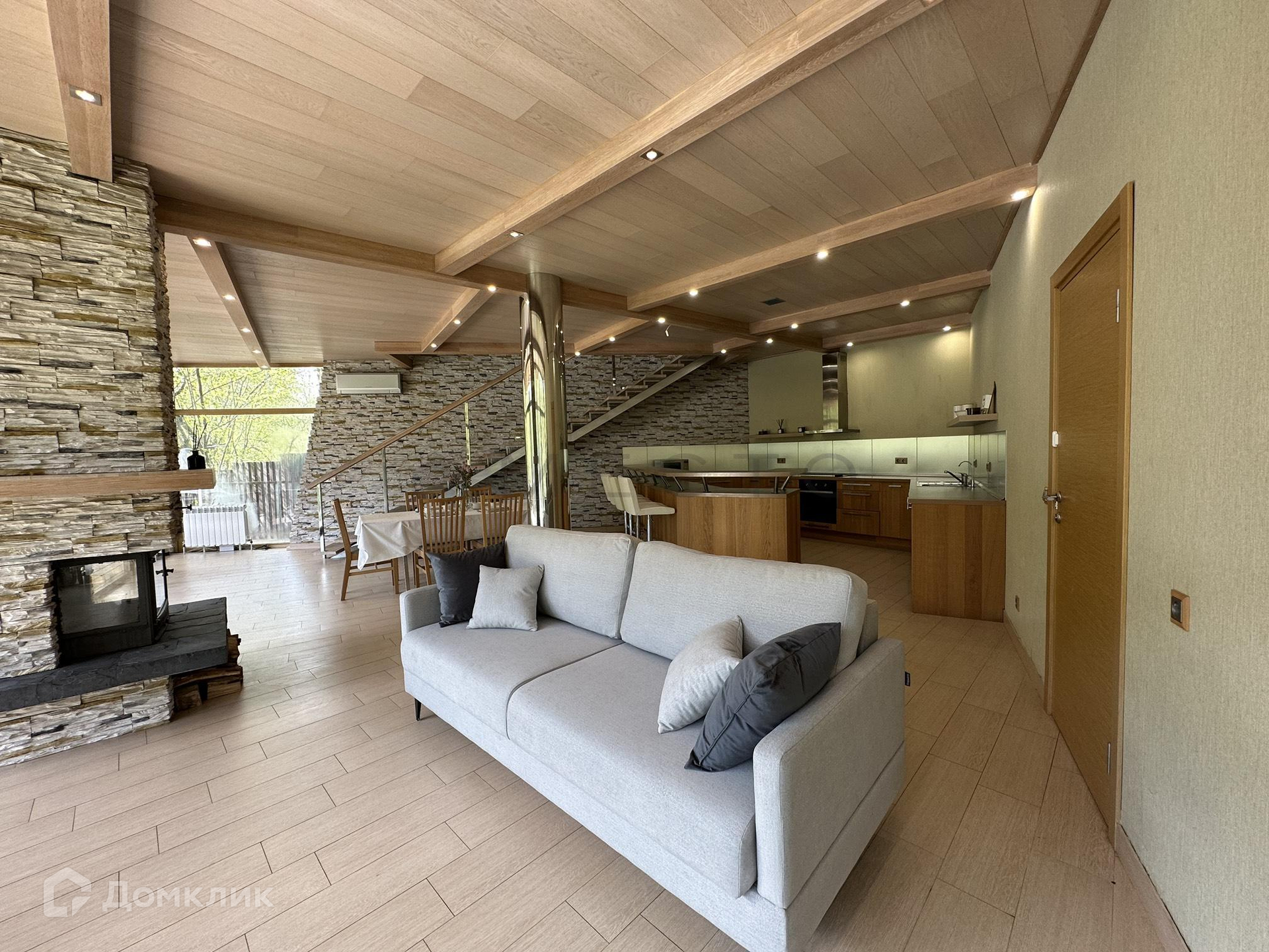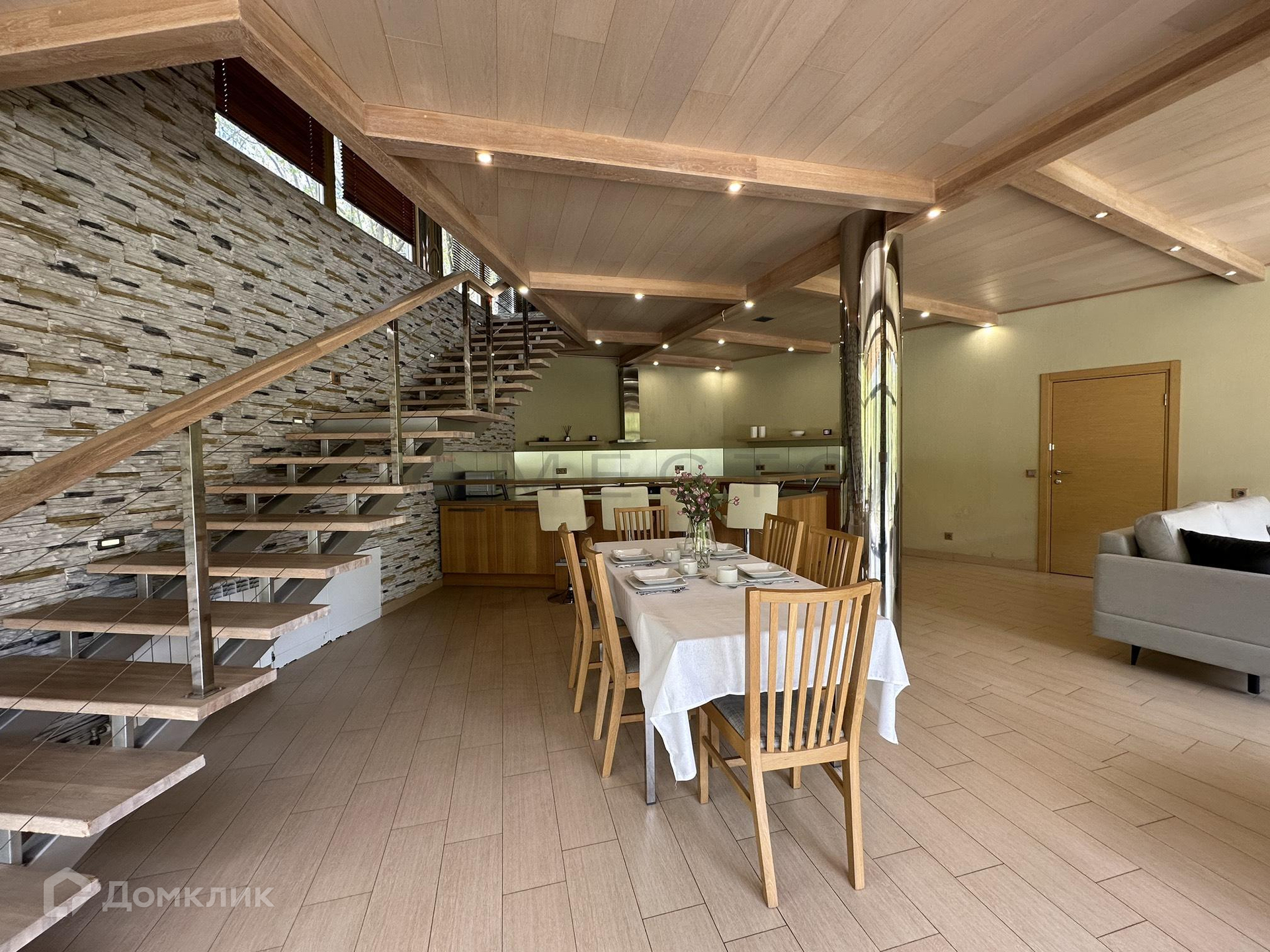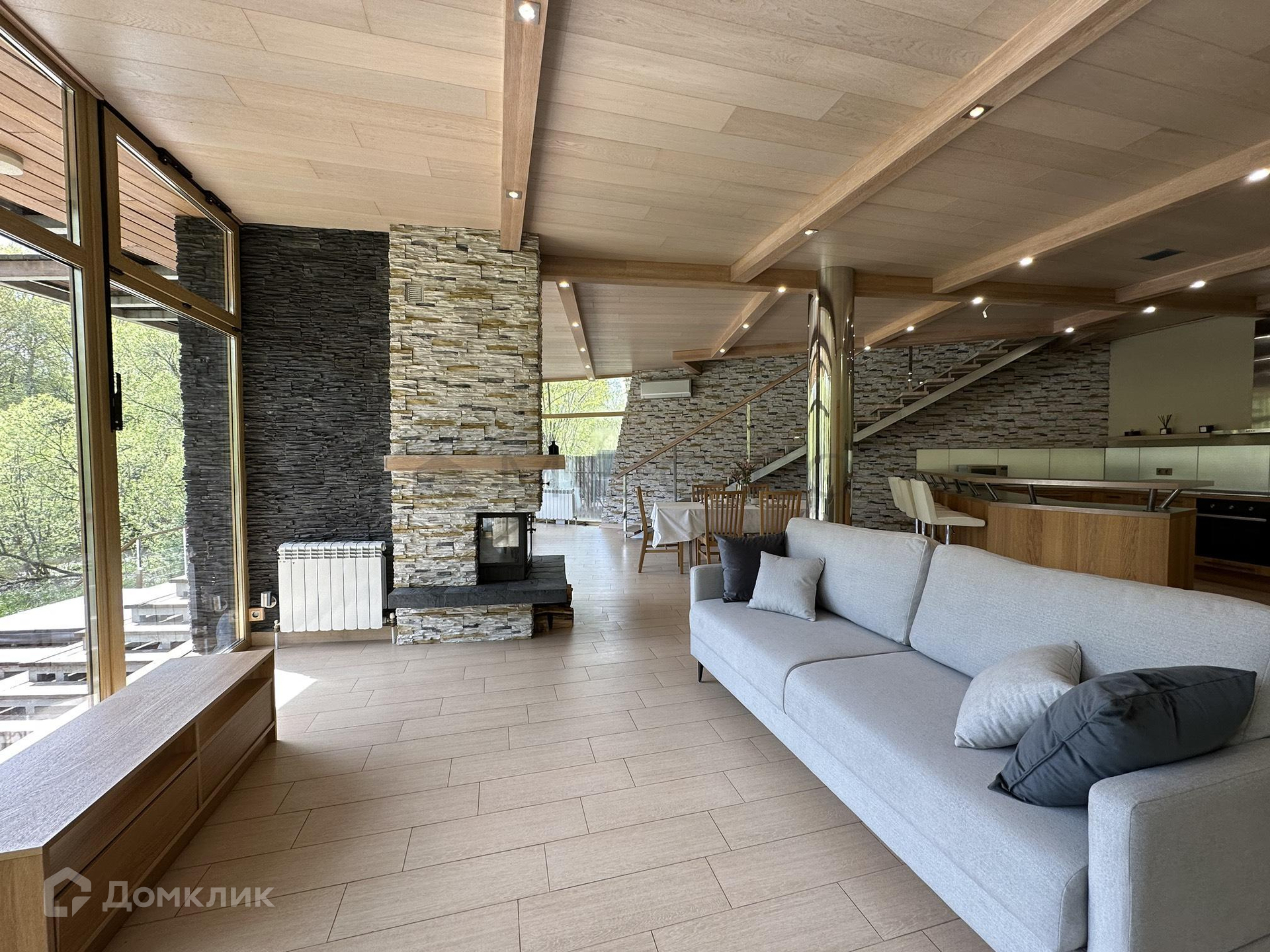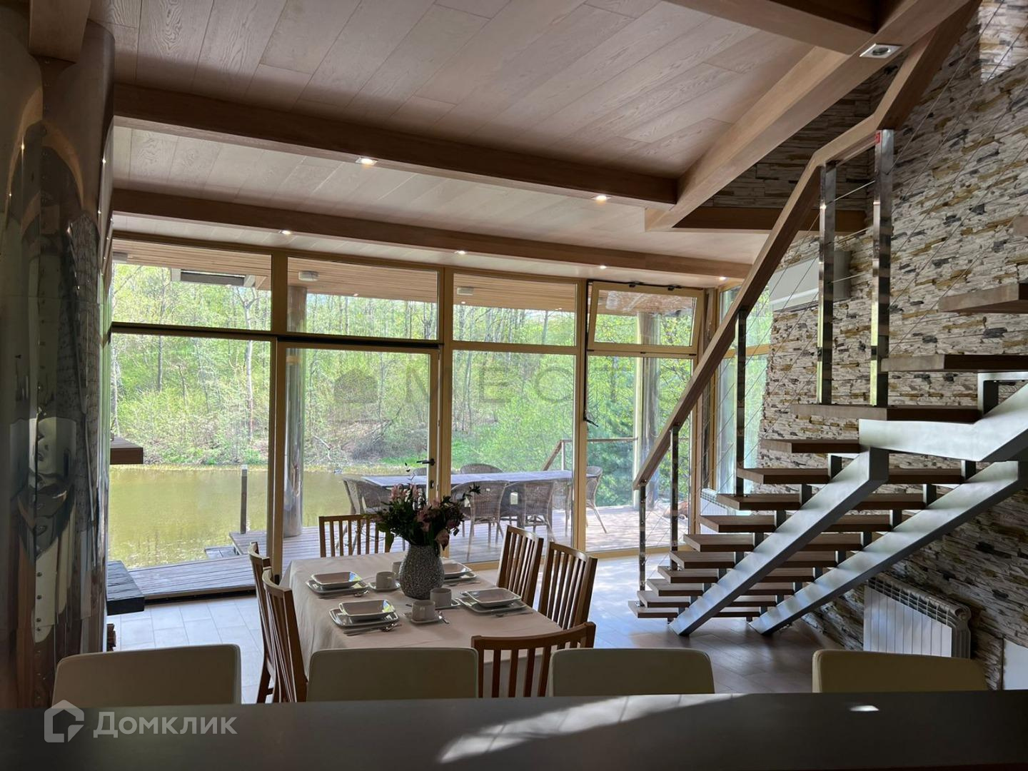 На 1-м этаже расположены кухня-столовая, гостиная и санузел с сауной. Панорамные окна с видом на воду и зеленые насаждения, выход на террасу и к спуску к воде.