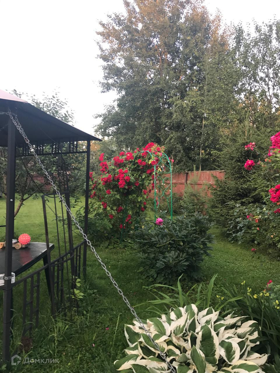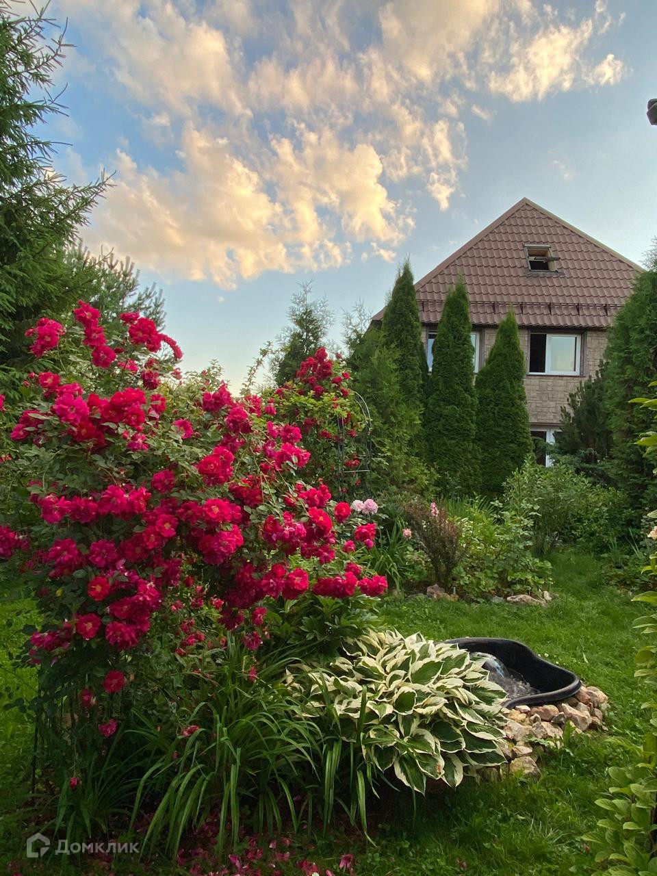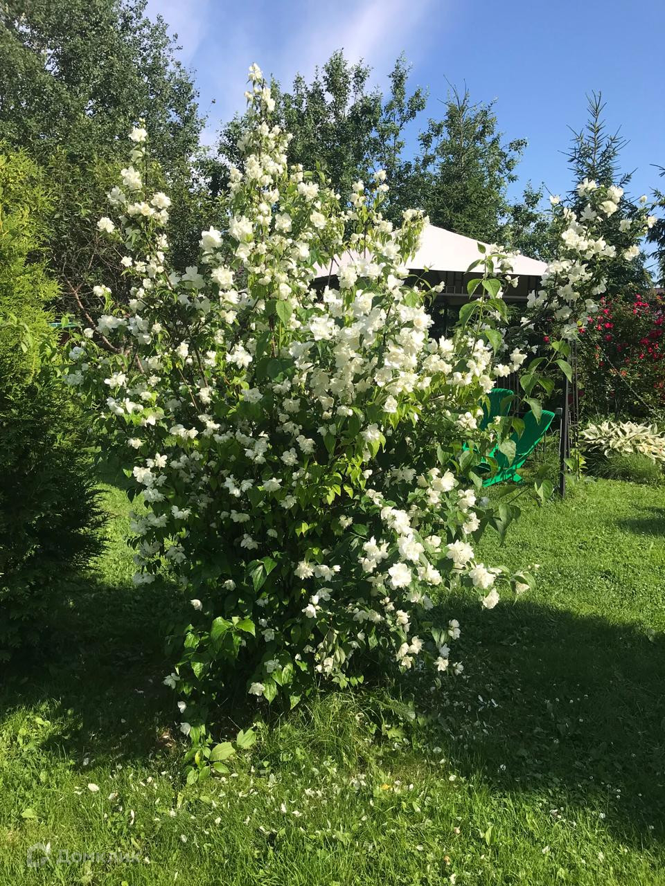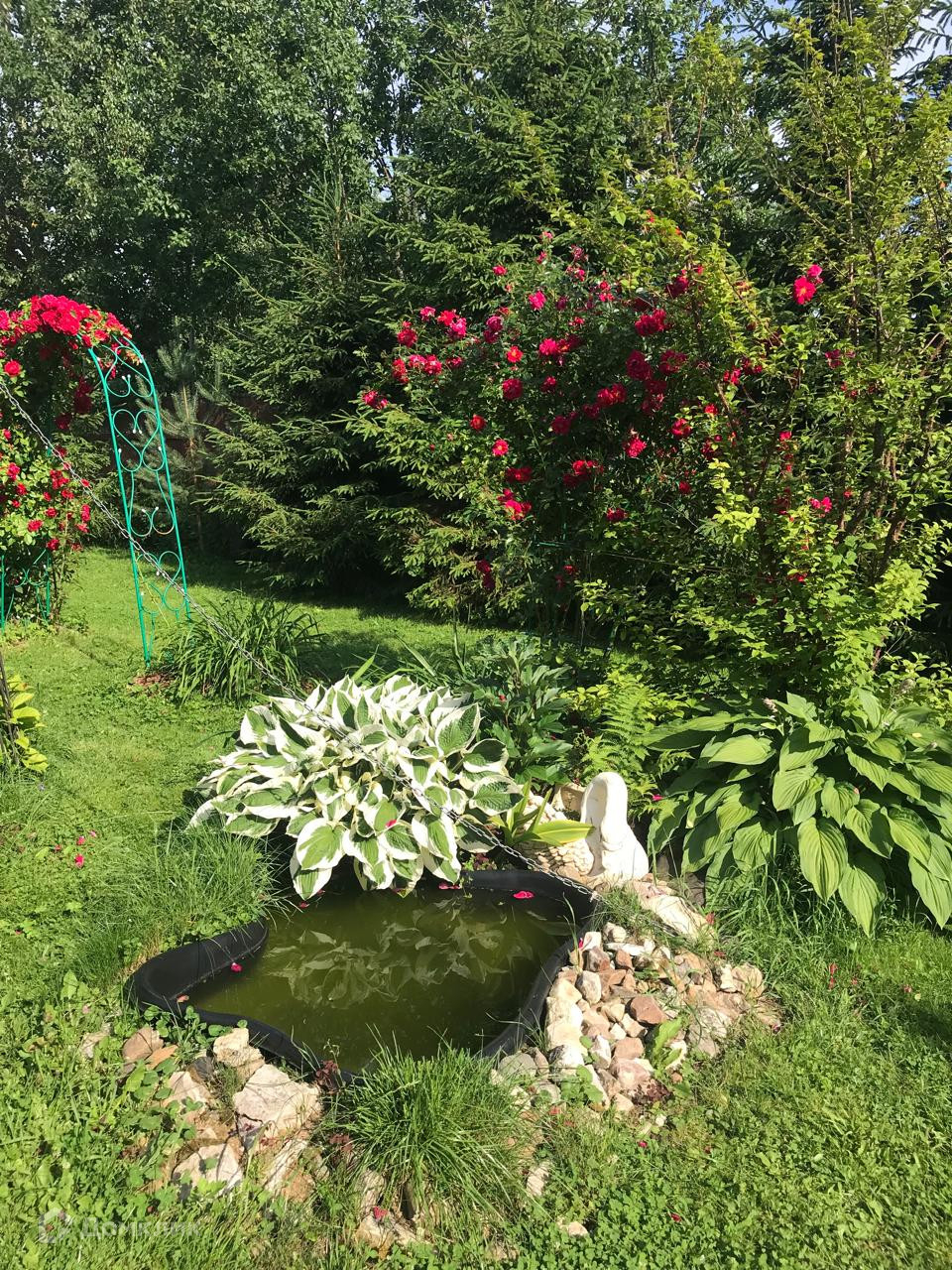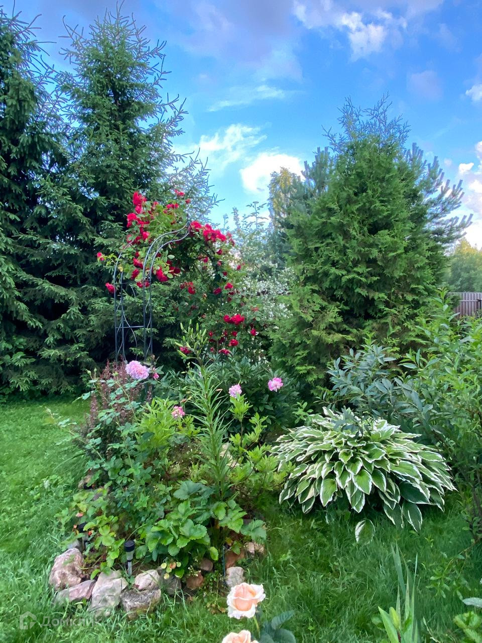 Яблони, Туи, Розы, Декоративные сосны, засеян газон.
