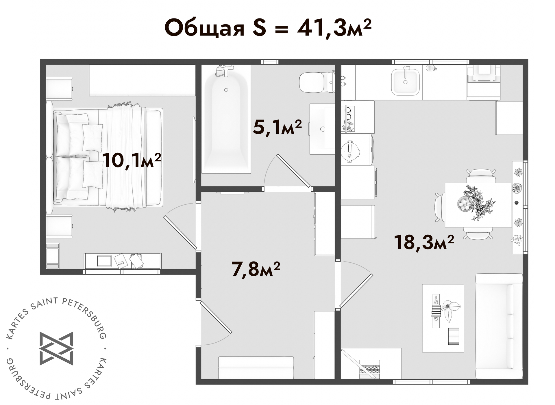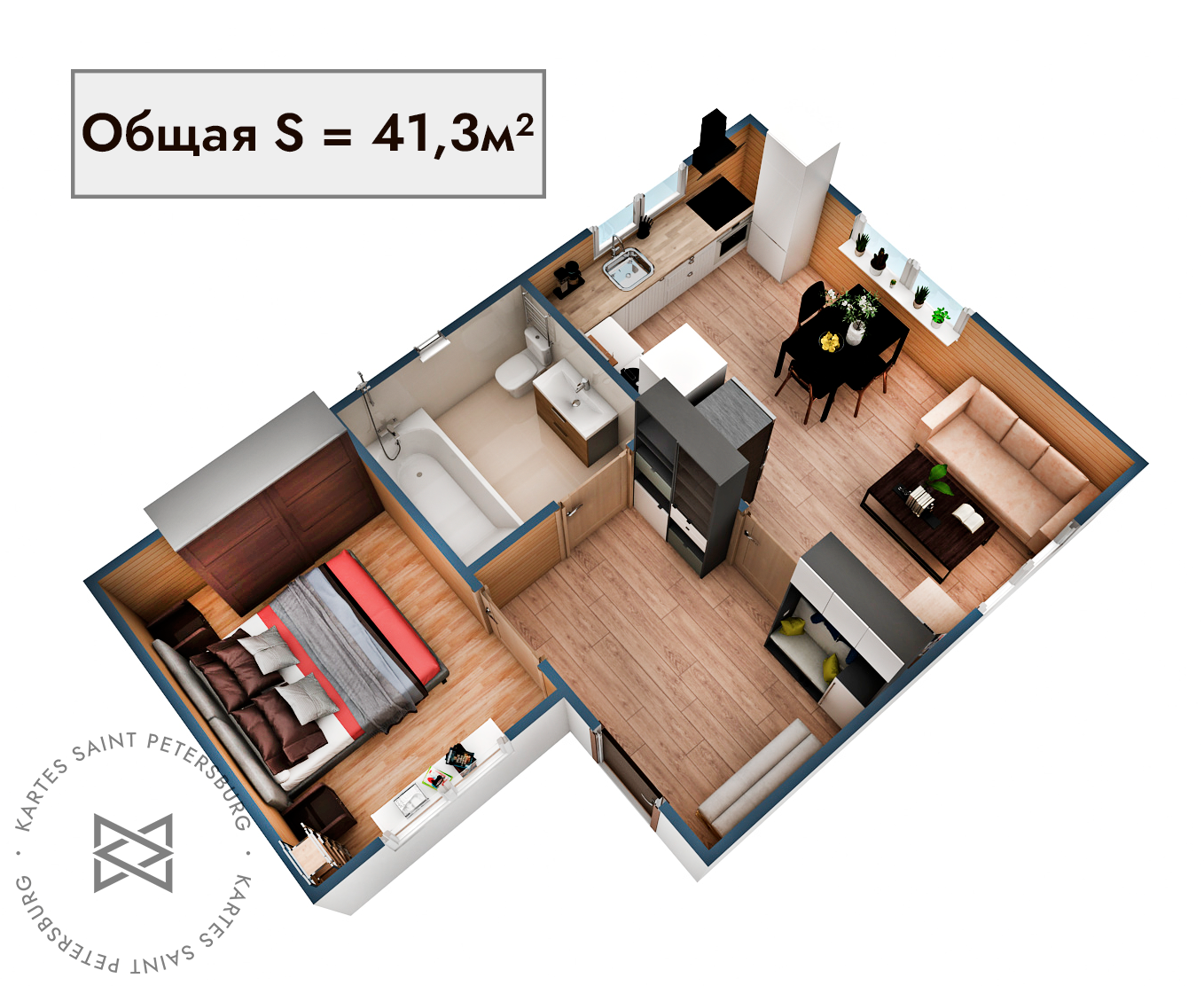 Общая площадь 41.3 м2