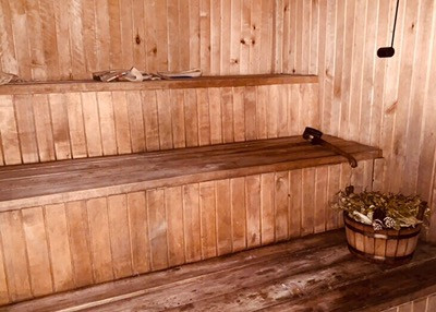 Первый этаж: Гостиная с камином, кухня с печкой, сауна с бассейном