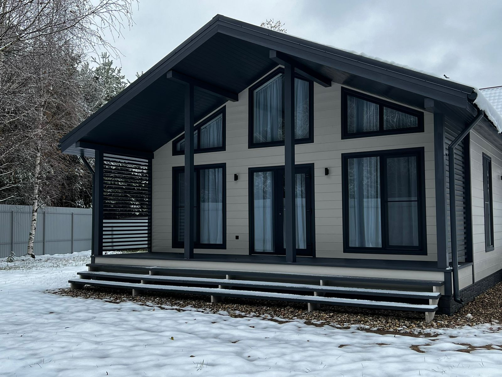 Удобное расположение дома, терраса-патио 16 кв. м. и основное остекление с видом на лесную зону, хватит места для установки навеса в передней части участка и дополнительных строений в задней части участка. На участке есть хвойные и лиственные деревья.