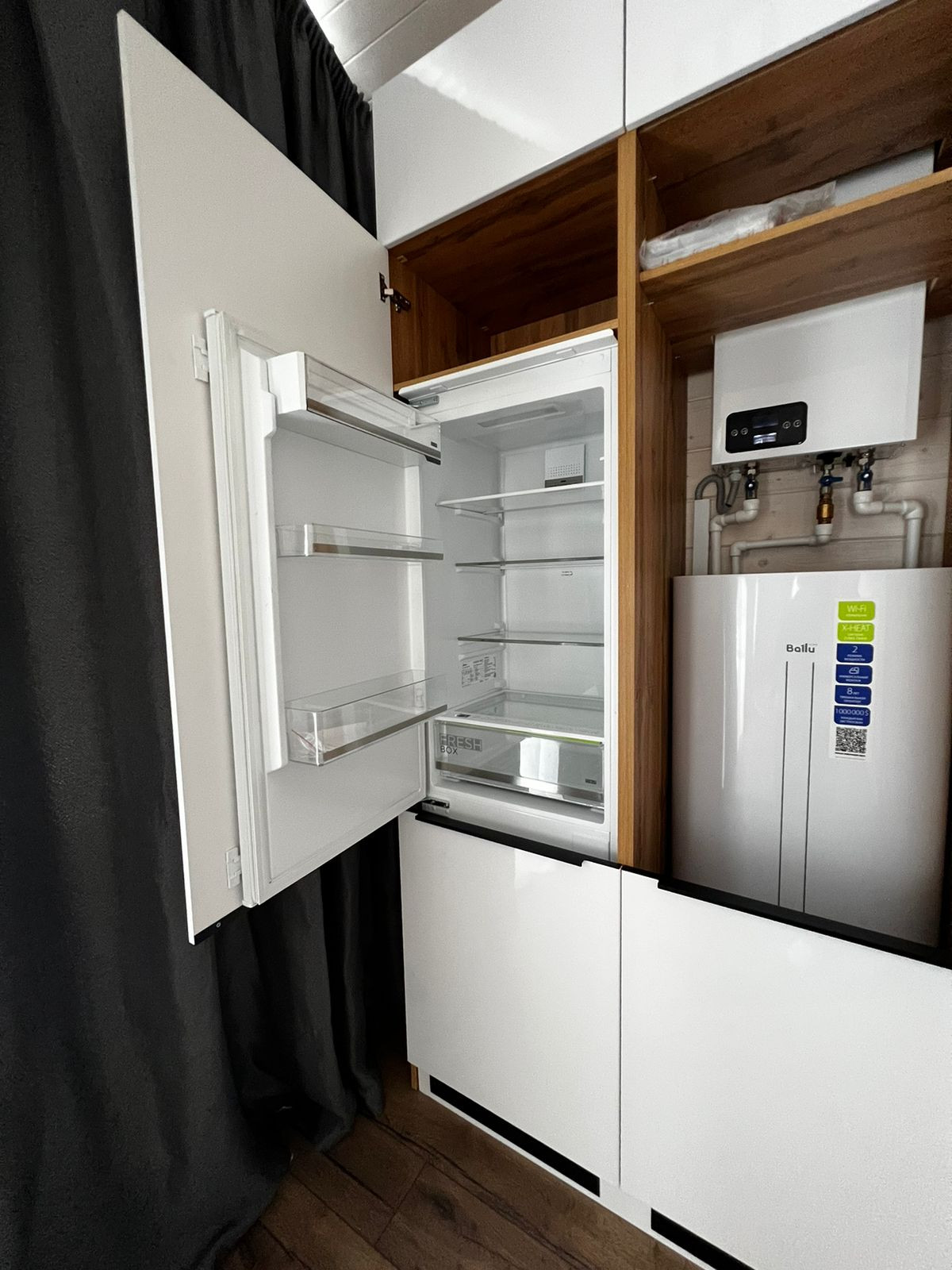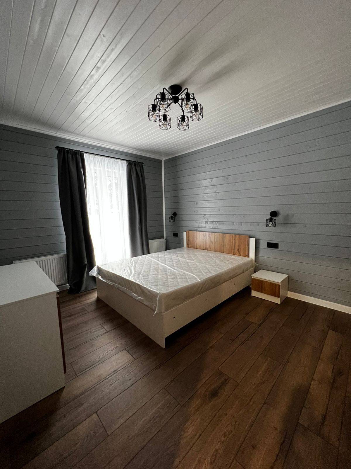 Скважина с кессоном (расположены фильтра, насос Grundfos), септик, внутренняя (скрытая) разводка электрики (автоматы Legrand), котел электро Arderia, водонагреватель на 100 л., 15 кВт 3 фазы, предусмотрен отдельный запитанный автомат на кондиционер, сантехника Roca, радиаторы Rommer, отмостка мягкая с декоративным щебнем. Отделка: краска Dufa (кухня-гостиная и коридор в светлой тональности, при желании можно перекрыть в любой цвет), ламинат по всей площади без порогов, керамогранит в с/у, портьеры блэкаут-лен. Укомплектован техникой Midea: стиральная машина, встроенный холодильник/вытяжка/духовой шкаф/микроволновая печь/варочная панель.