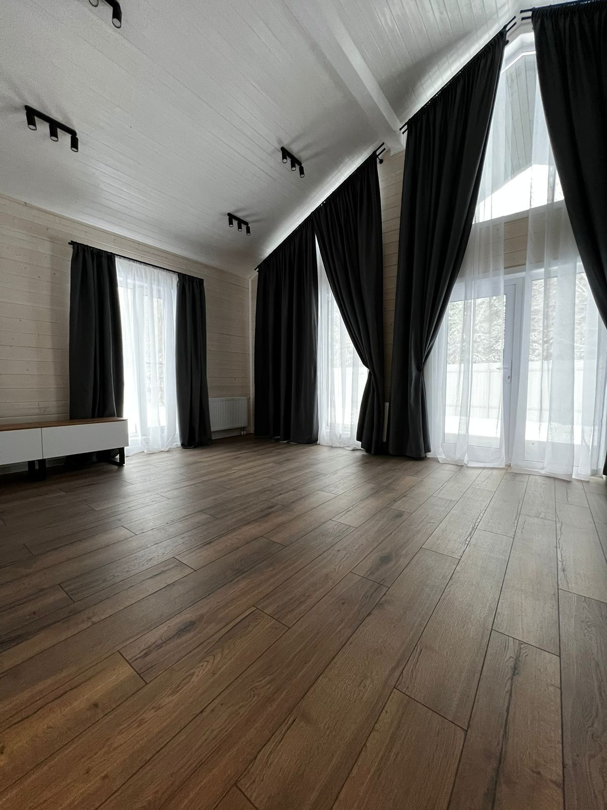 Высота в зоне второго света 4,3 м., по остальному периметру 2,7 м.. Есть возможность увеличить площадь дома за счет мансардной части над комнатами. Площади комнат: 14 и 12 кв. м., кухня-гостиная 32 кв. м., с/у 7 кв. м.. Предусмотрена уличная разводка для электрики и сантехники (не прийдется дополнительно прокладывать кабель).