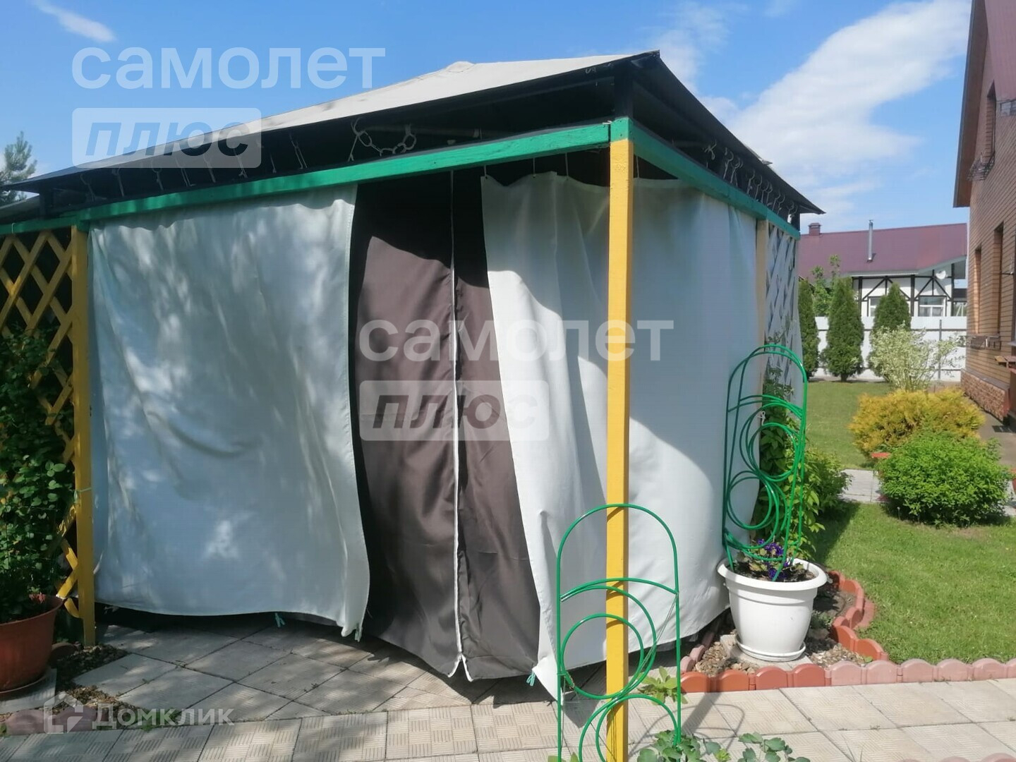 На участке отдельная зона барбекю с закрытой террасой и летняя беседка для отдыха.