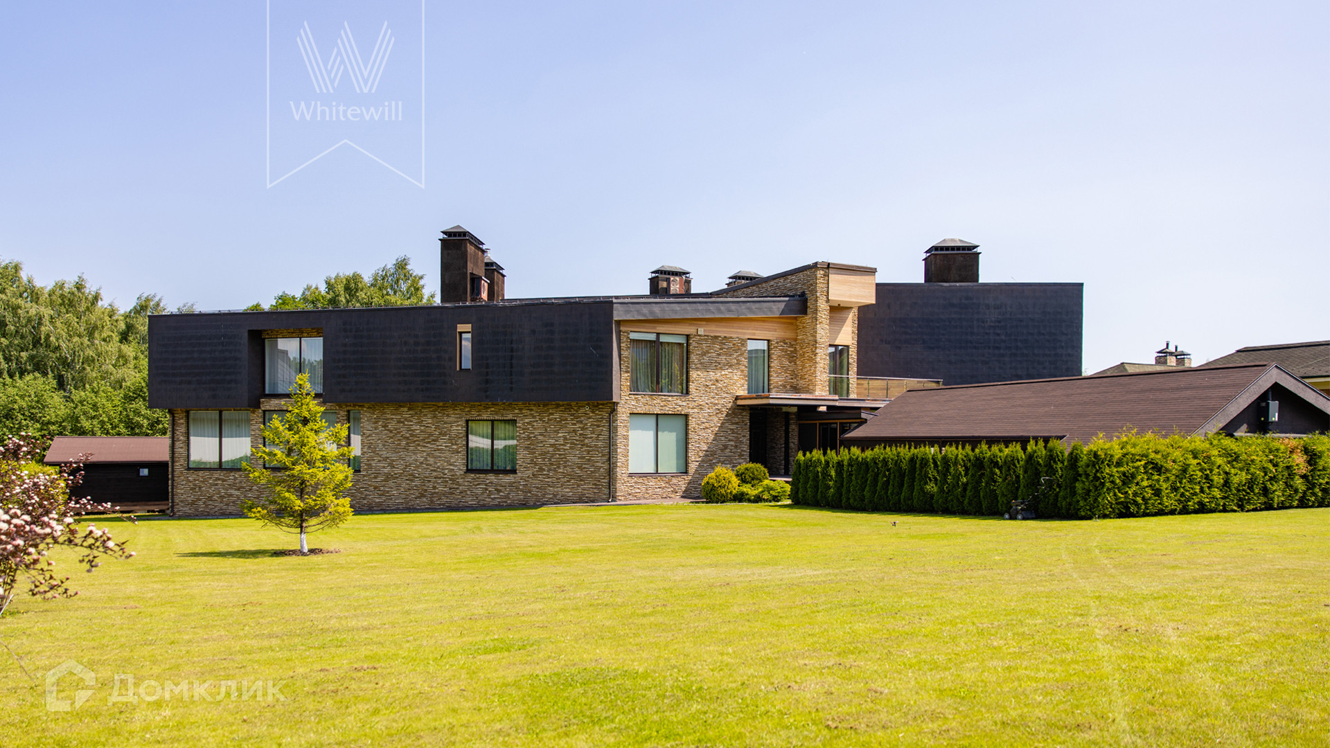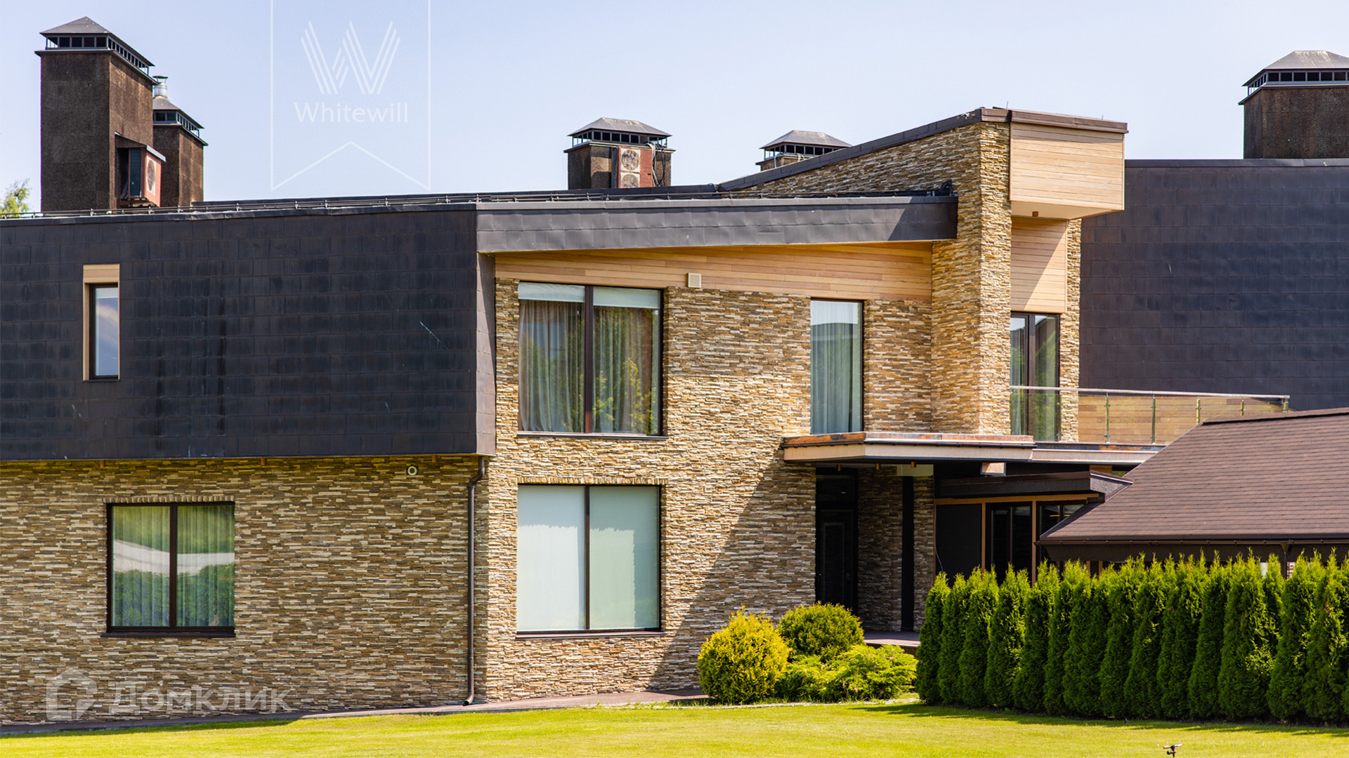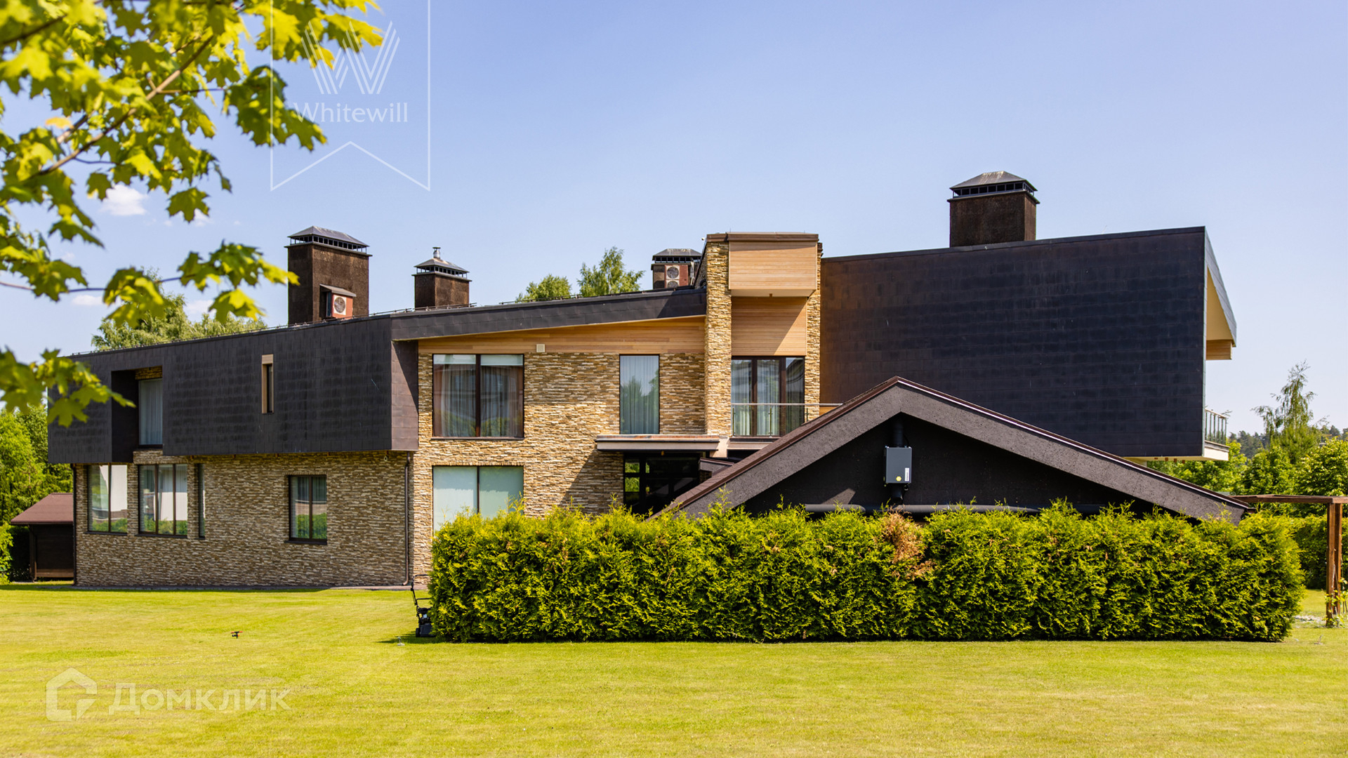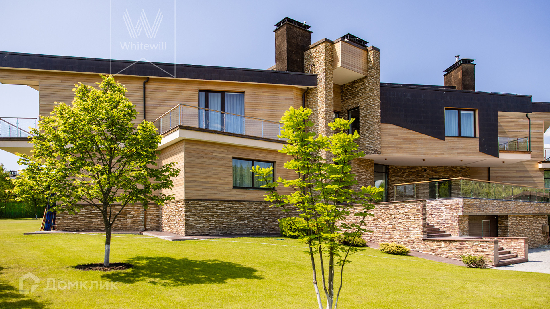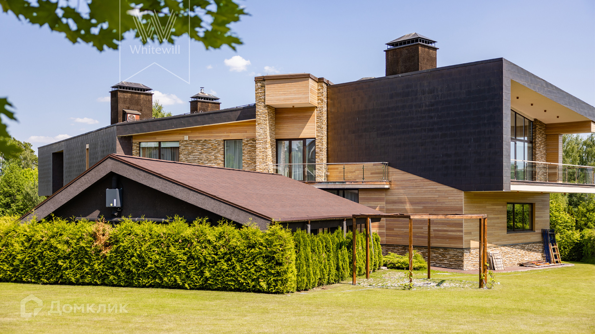 ID 8 585. Crystal Istra. Загородная резиденция в современном стиле площадью 1000 м² расположена на участке 39,4 соток с небольшим перепадом высот. Фасад дома облицован лиственницей, камнем, медью и натуральными панелями из португальского пробкового дуба. Со второго этажа с многочисленных балконов открывается вид на деревья и панораму поселка. В цокольный этаж встроен гараж на 3 машины. На первом этаже расположена просторная гостиная с большими окнами, оборудованная кухня и фитнес-зал. Планировкой резиденции предусмотрены 5-7 спален. На участке выполнены дренажные работы и установлена система автополива, площадка для подъезда машин вымощена брусчаткой, посажен газон и живая изгородь. В доме оборудован бассейн.