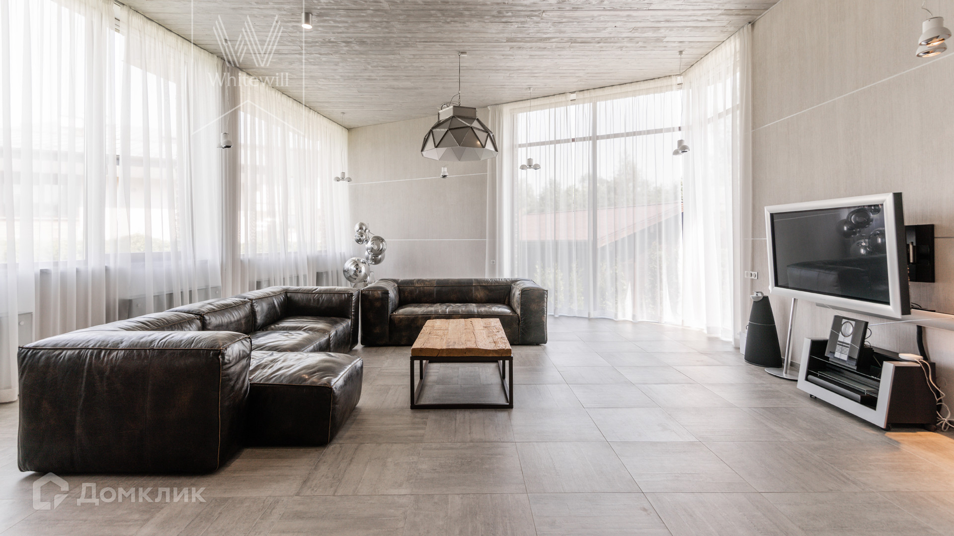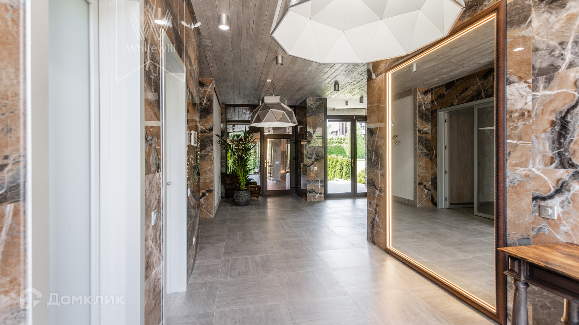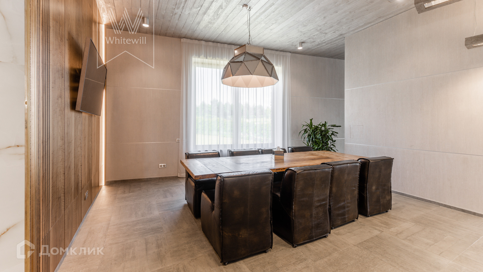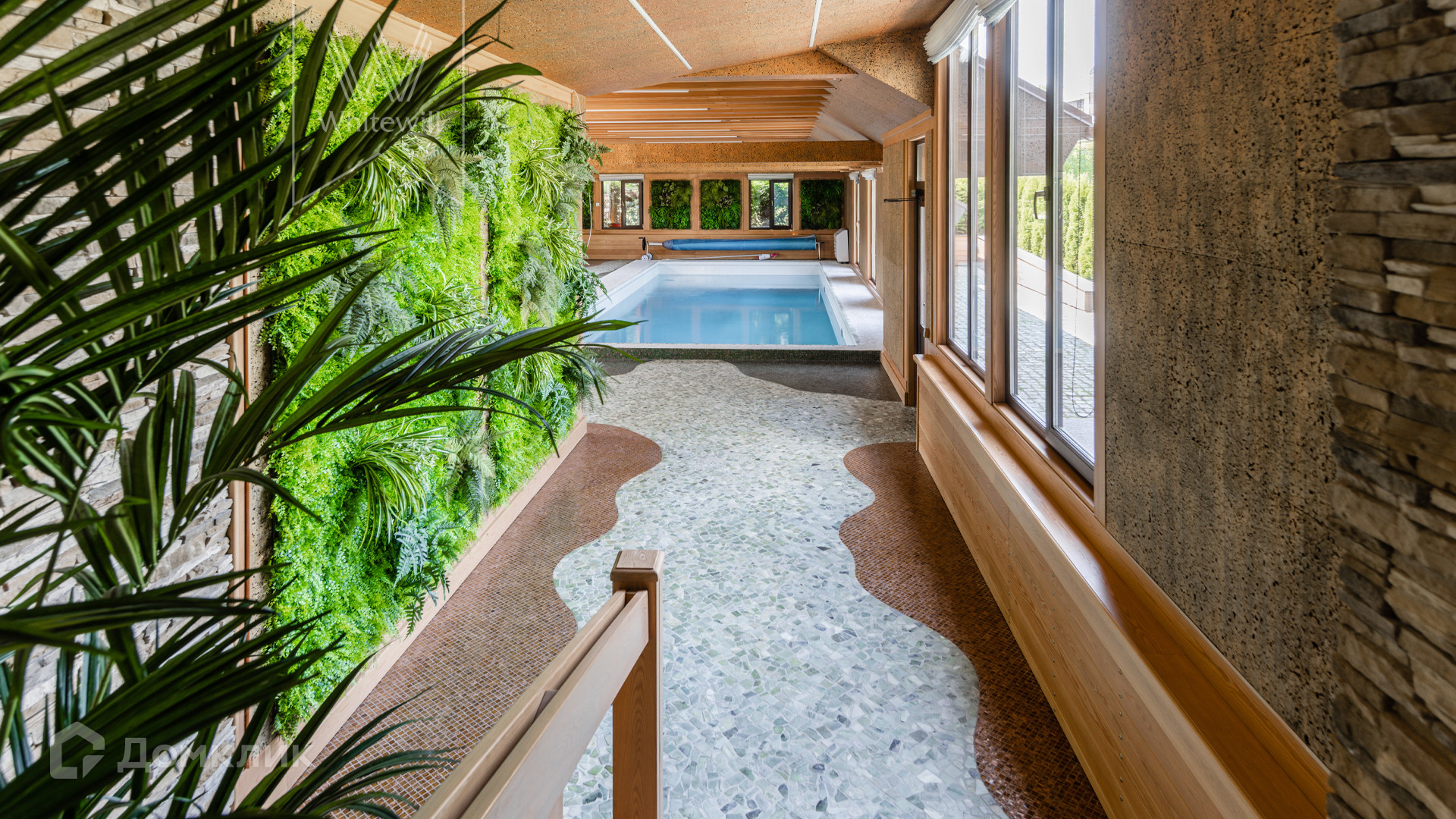 ID 8 585. Crystal Istra. Загородная резиденция в современном стиле площадью 1000 м² расположена на участке 39,4 соток с небольшим перепадом высот. Фасад дома облицован лиственницей, камнем, медью и натуральными панелями из португальского пробкового дуба. Со второго этажа с многочисленных балконов открывается вид на деревья и панораму поселка. В цокольный этаж встроен гараж на 3 машины. На первом этаже расположена просторная гостиная с большими окнами, оборудованная кухня и фитнес-зал. Планировкой резиденции предусмотрены 5-7 спален. На участке выполнены дренажные работы и установлена система автополива, площадка для подъезда машин вымощена брусчаткой, посажен газон и живая изгородь. В доме оборудован бассейн.