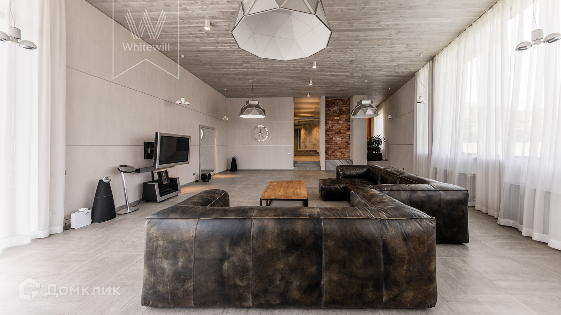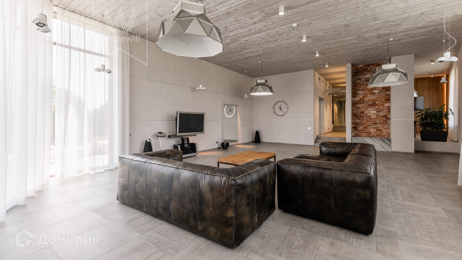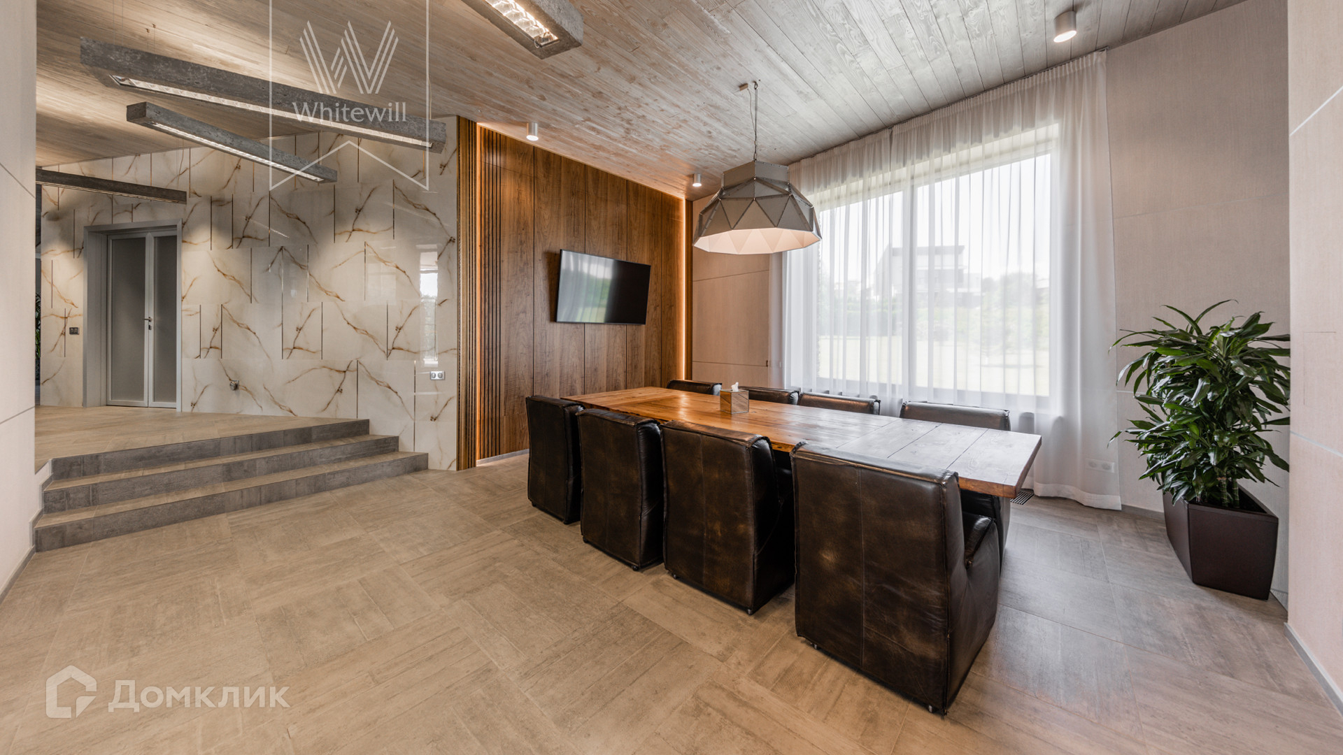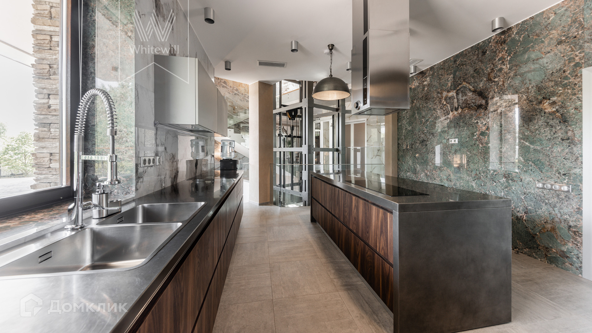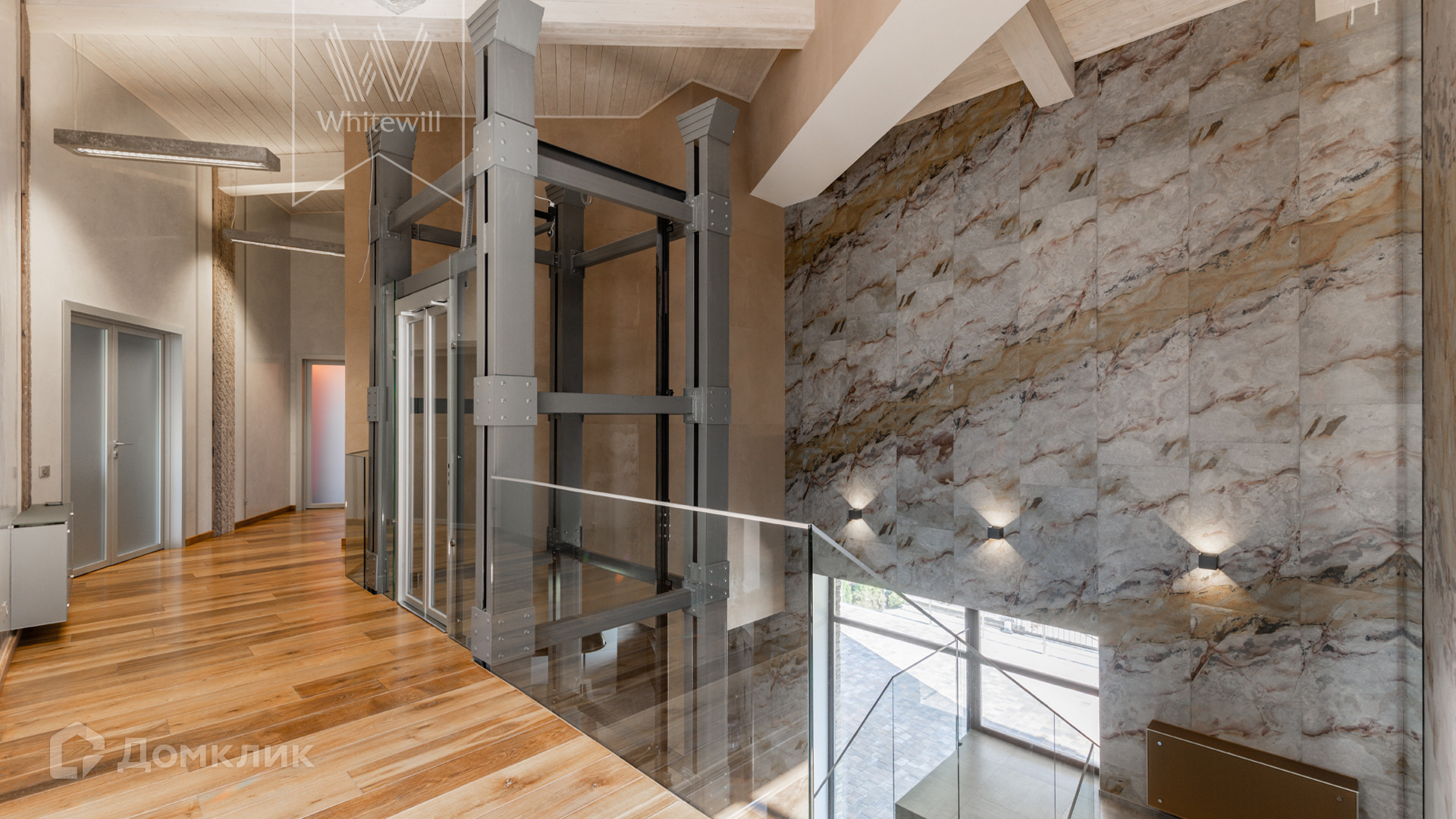 ID 8 585. Crystal Istra. Загородная резиденция в современном стиле площадью 1000 м² расположена на участке 39,4 соток с небольшим перепадом высот. Фасад дома облицован лиственницей, камнем, медью и натуральными панелями из португальского пробкового дуба. Со второго этажа с многочисленных балконов открывается вид на деревья и панораму поселка. В цокольный этаж встроен гараж на 3 машины. На первом этаже расположена просторная гостиная с большими окнами, оборудованная кухня и фитнес-зал. Планировкой резиденции предусмотрены 5-7 спален. На участке выполнены дренажные работы и установлена система автополива, площадка для подъезда машин вымощена брусчаткой, посажен газон и живая изгородь. В доме оборудован бассейн.