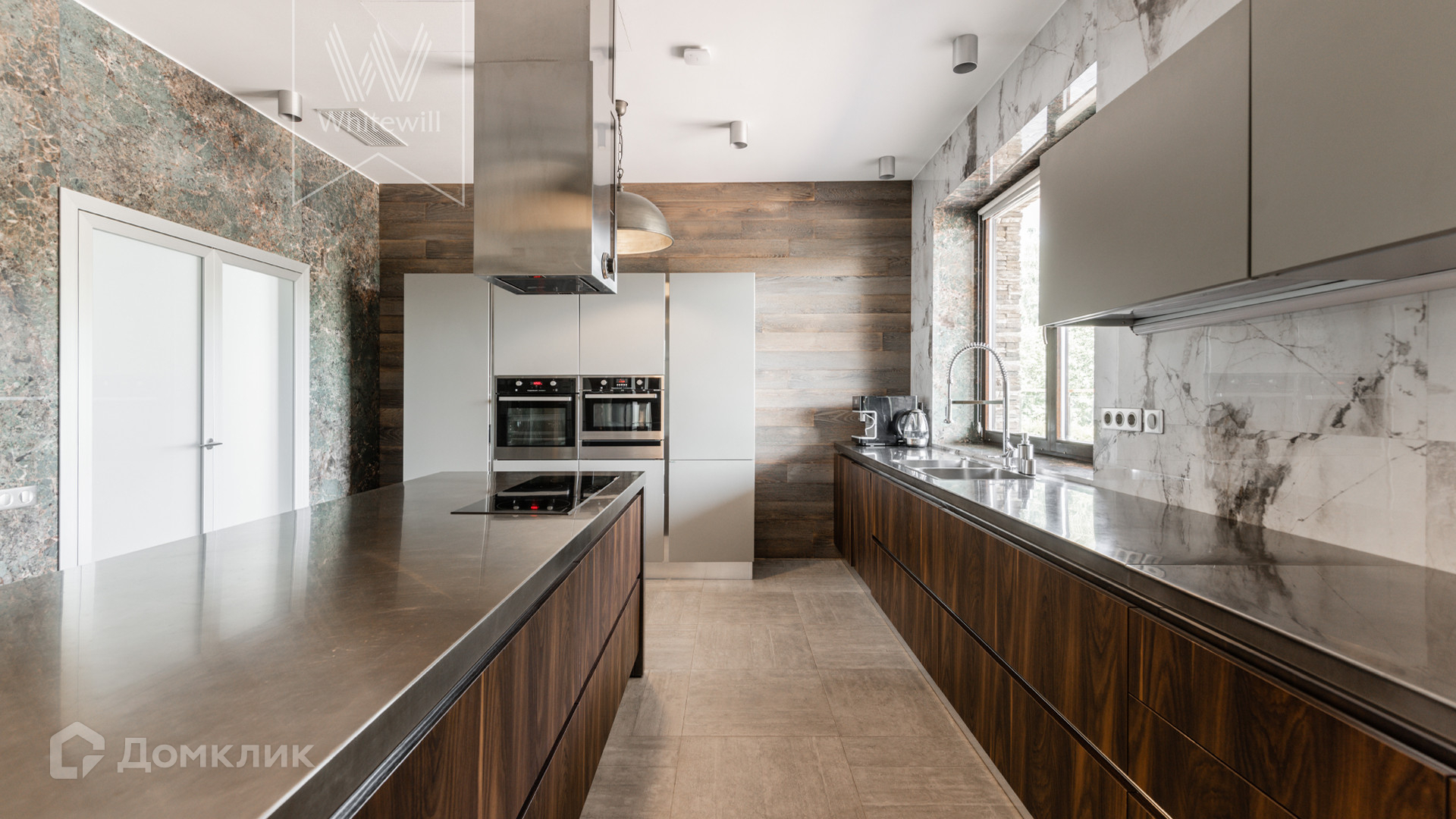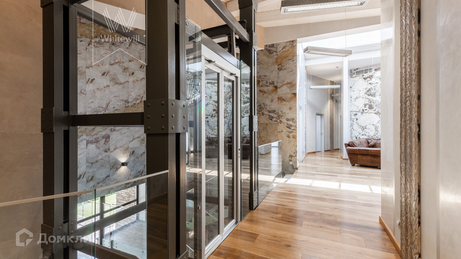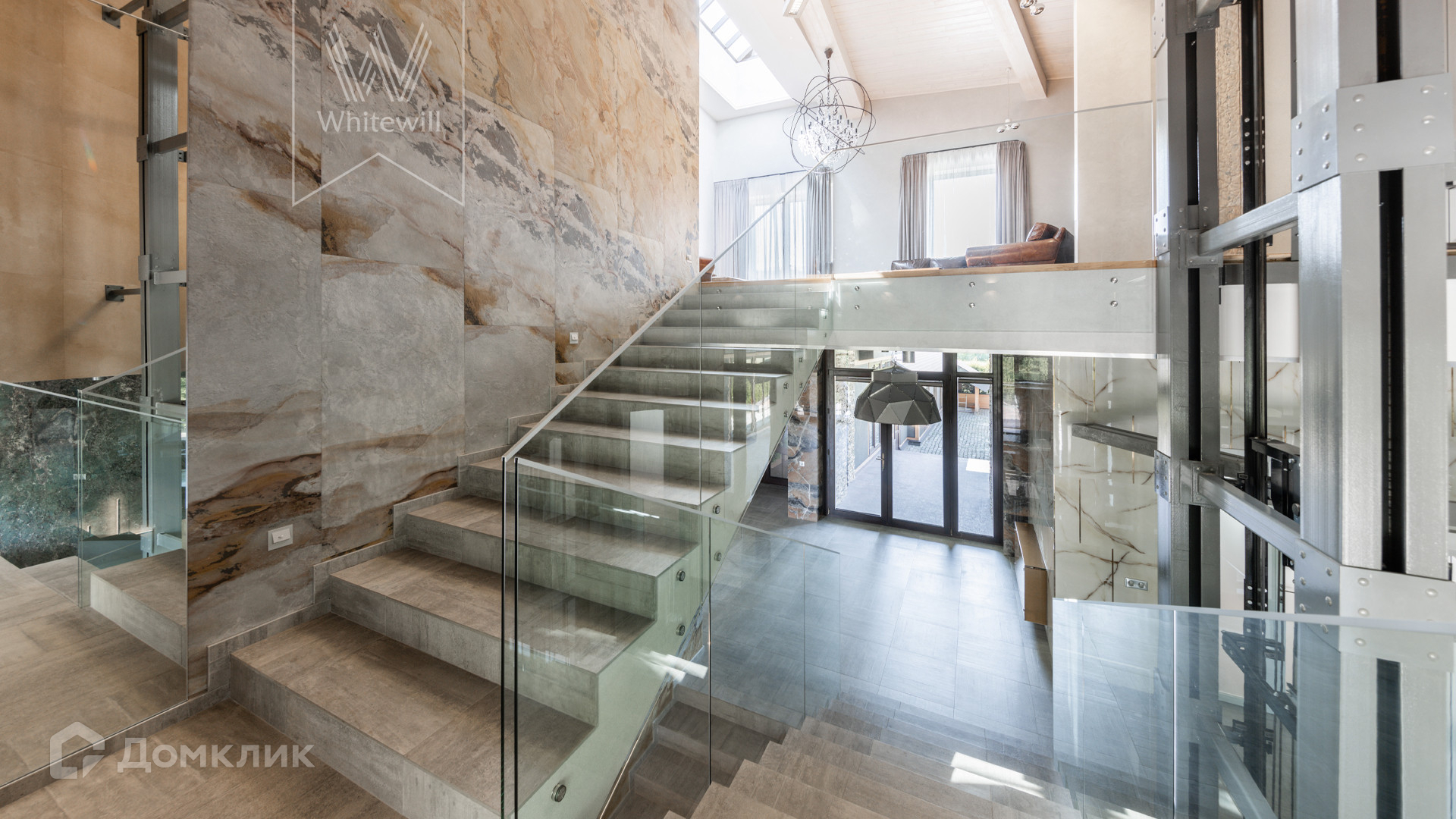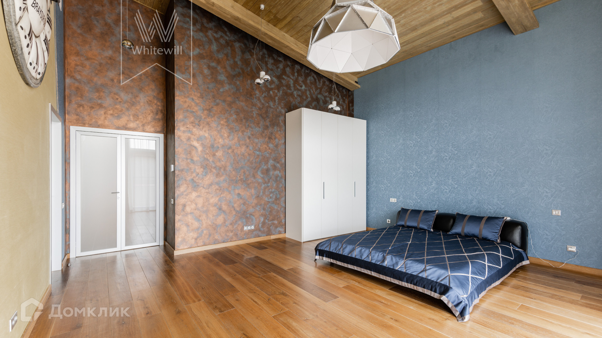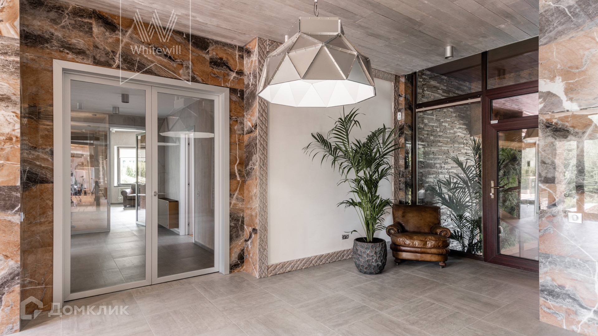 ID 8 585. Crystal Istra. Загородная резиденция в современном стиле площадью 1000 м² расположена на участке 39,4 соток с небольшим перепадом высот. Фасад дома облицован лиственницей, камнем, медью и натуральными панелями из португальского пробкового дуба. Со второго этажа с многочисленных балконов открывается вид на деревья и панораму поселка. В цокольный этаж встроен гараж на 3 машины. На первом этаже расположена просторная гостиная с большими окнами, оборудованная кухня и фитнес-зал. Планировкой резиденции предусмотрены 5-7 спален. На участке выполнены дренажные работы и установлена система автополива, площадка для подъезда машин вымощена брусчаткой, посажен газон и живая изгородь. В доме оборудован бассейн.