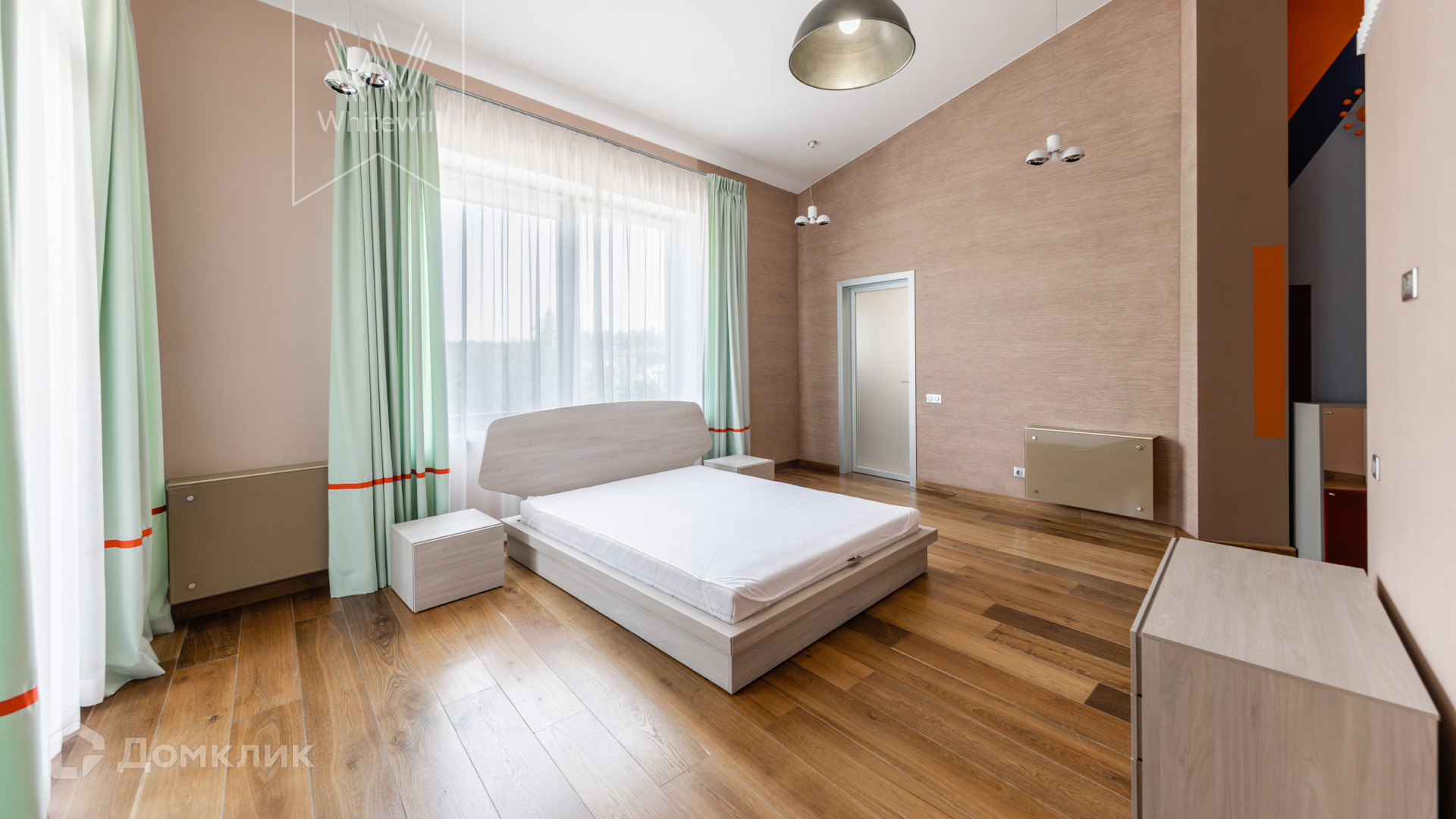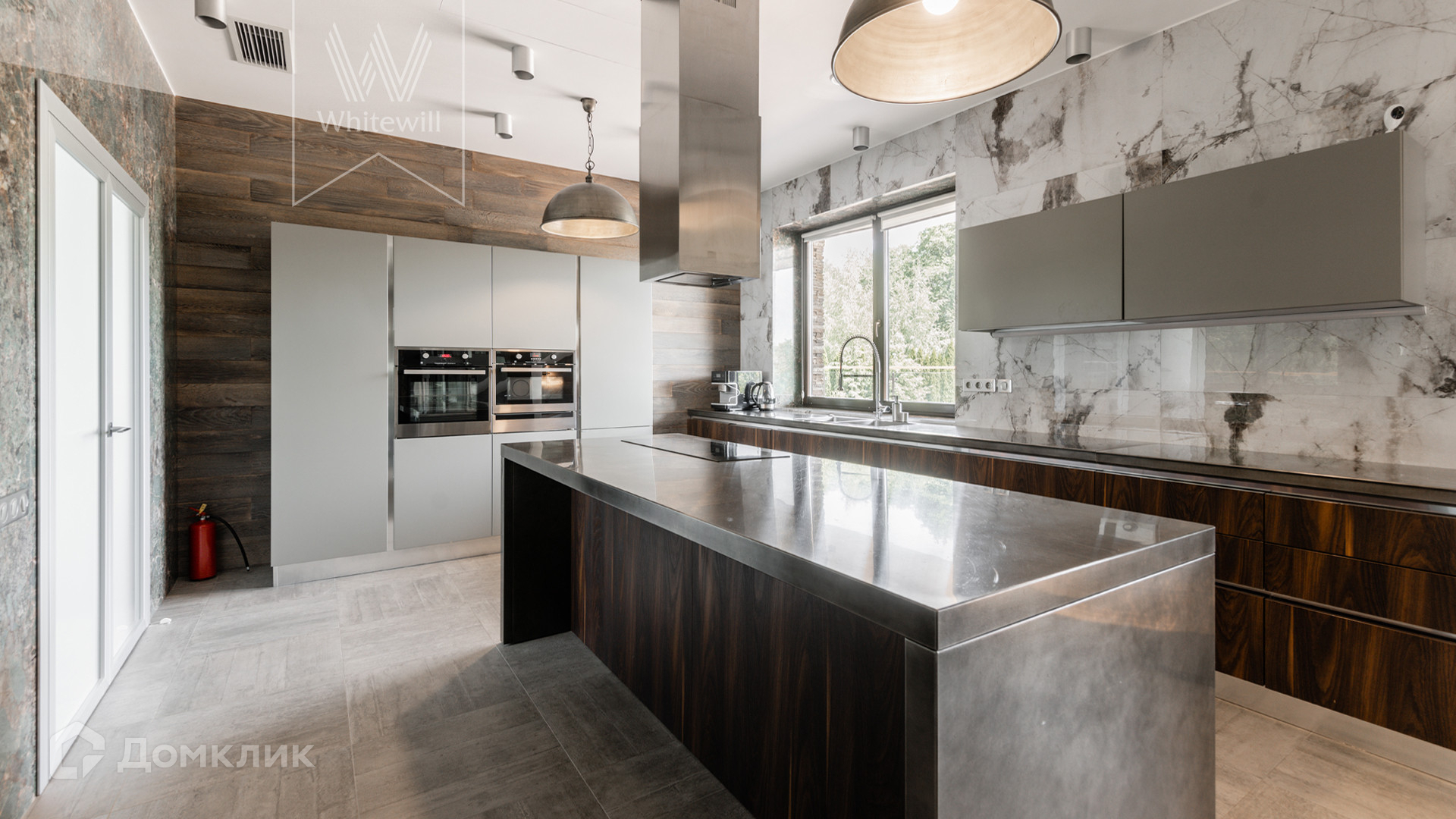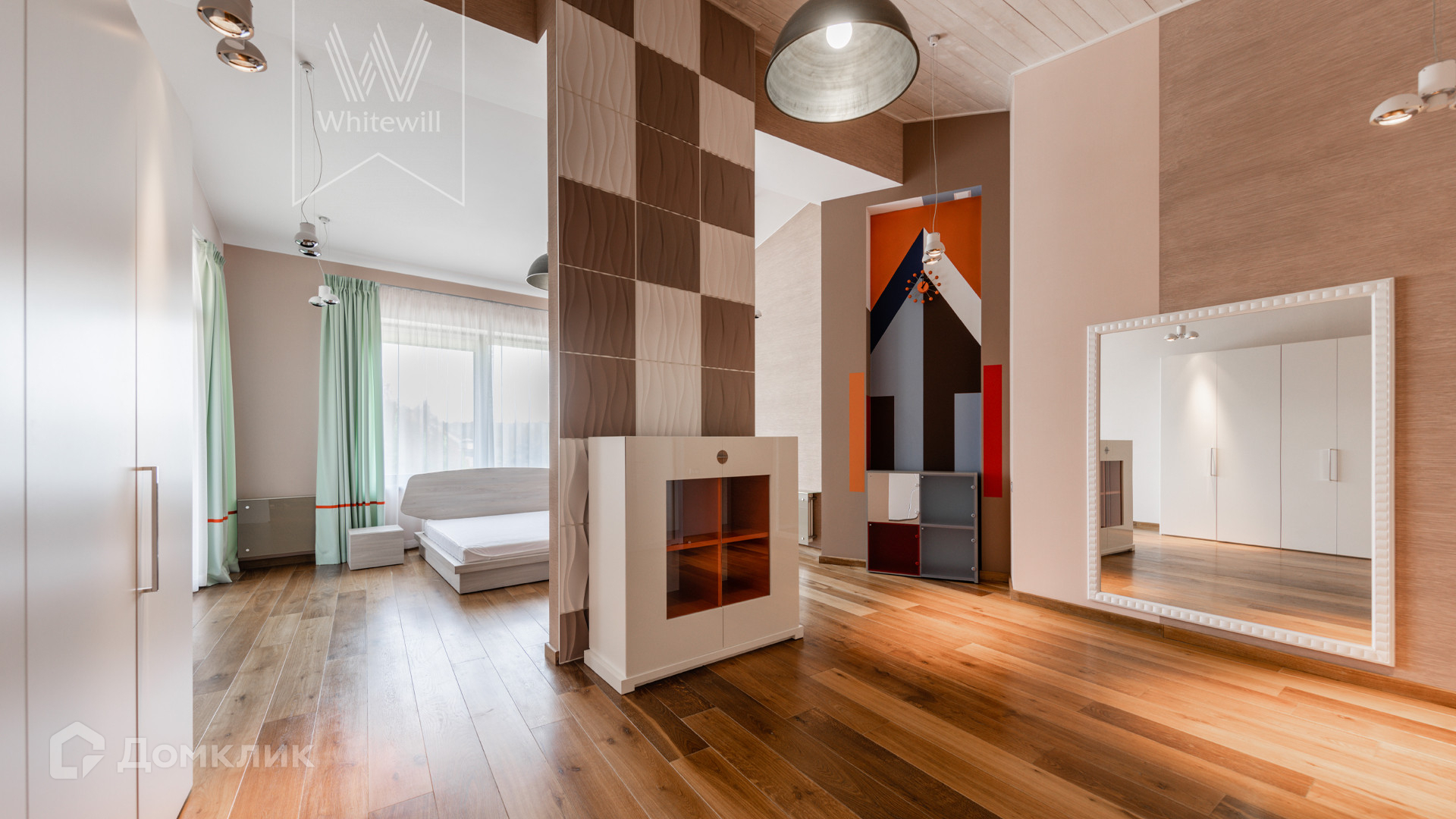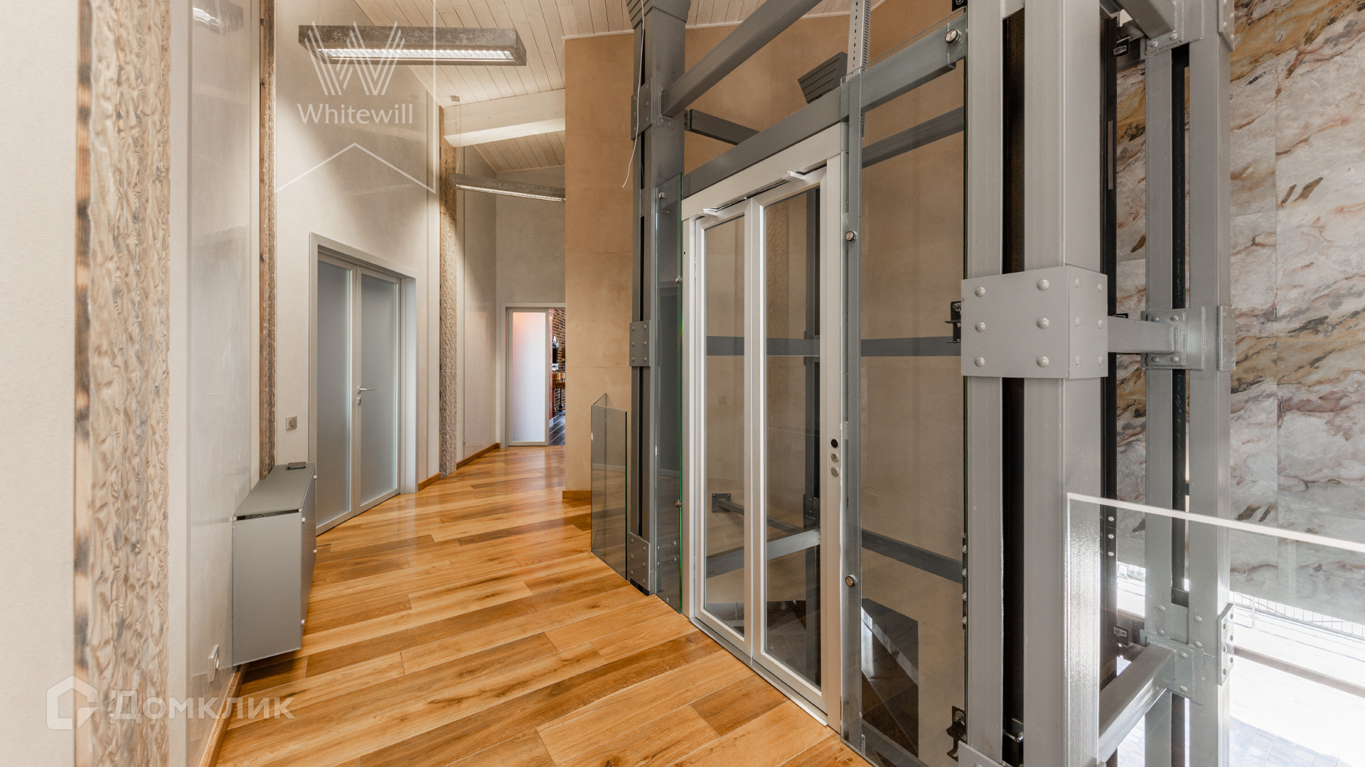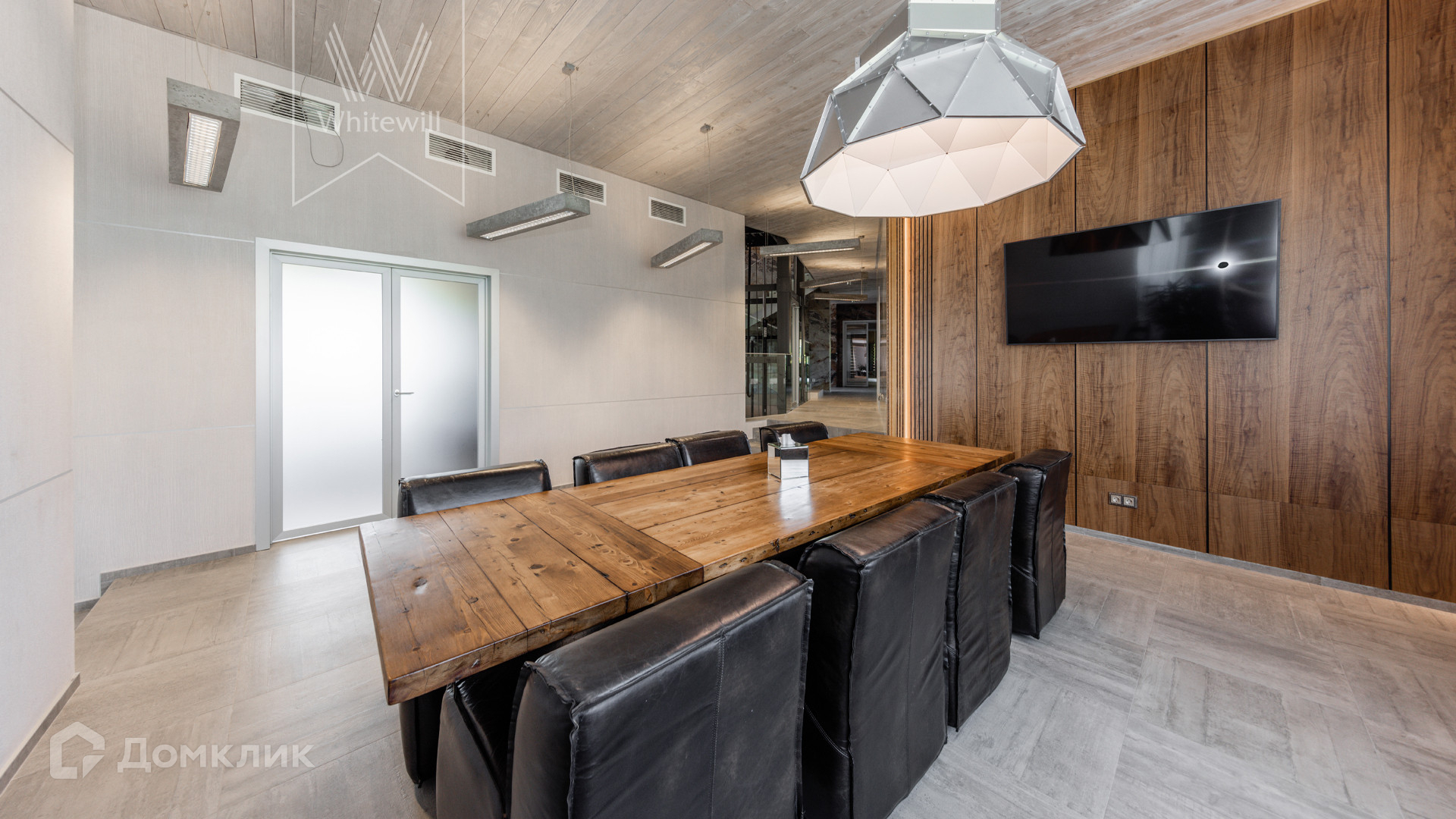 ID 8 585. Crystal Istra. Загородная резиденция в современном стиле площадью 1000 м² расположена на участке 39,4 соток с небольшим перепадом высот. Фасад дома облицован лиственницей, камнем, медью и натуральными панелями из португальского пробкового дуба. Со второго этажа с многочисленных балконов открывается вид на деревья и панораму поселка. В цокольный этаж встроен гараж на 3 машины. На первом этаже расположена просторная гостиная с большими окнами, оборудованная кухня и фитнес-зал. Планировкой резиденции предусмотрены 5-7 спален. На участке выполнены дренажные работы и установлена система автополива, площадка для подъезда машин вымощена брусчаткой, посажен газон и живая изгородь. В доме оборудован бассейн.