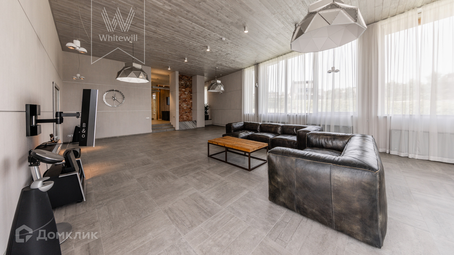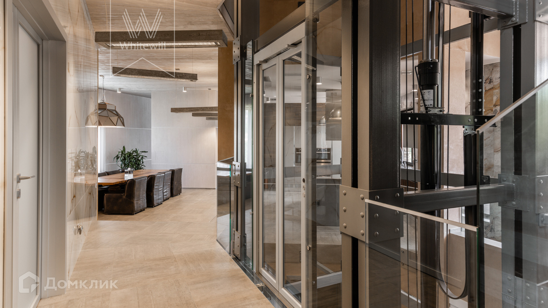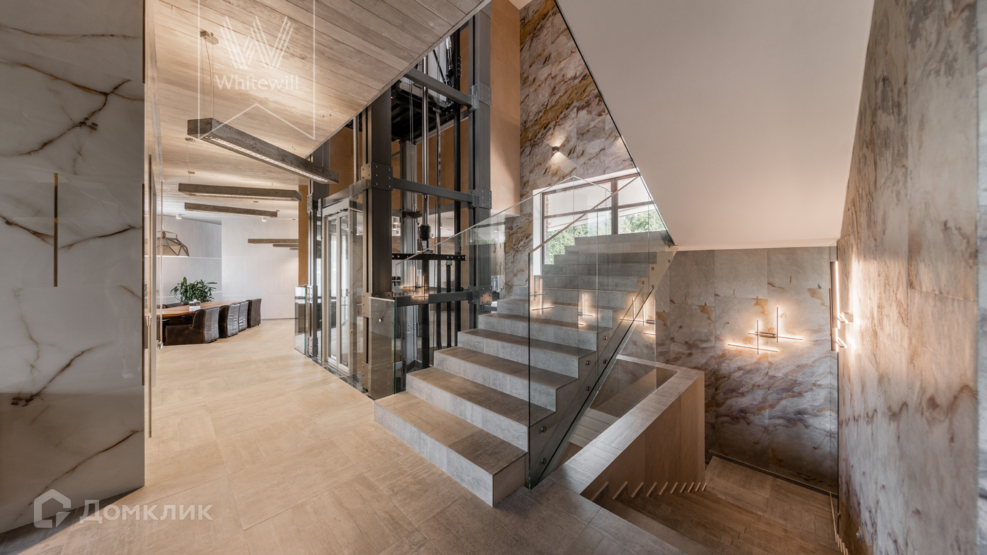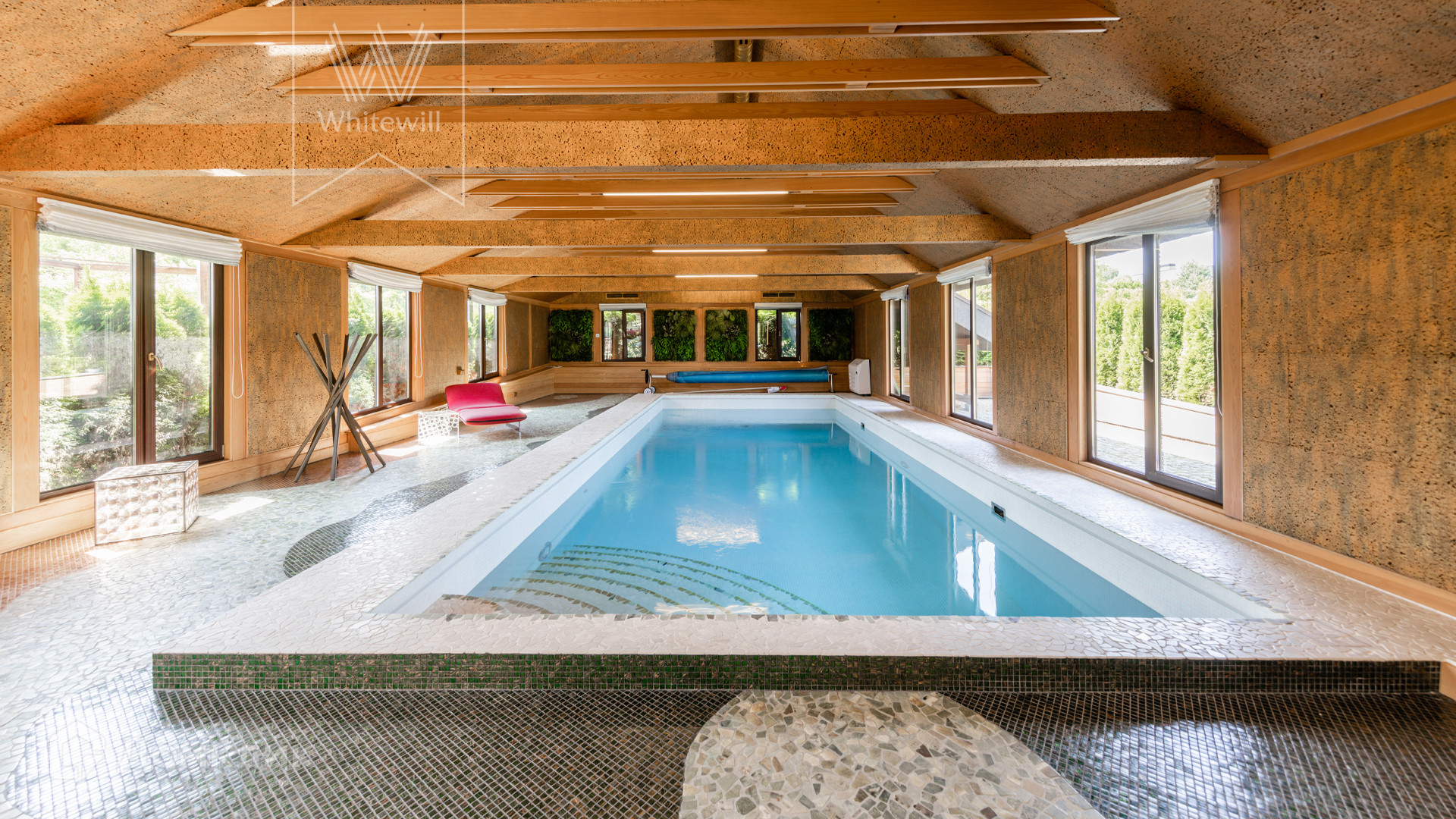 ID 8 585. Crystal Istra. Загородная резиденция в современном стиле площадью 1000 м² расположена на участке 39,4 соток с небольшим перепадом высот. Фасад дома облицован лиственницей, камнем, медью и натуральными панелями из португальского пробкового дуба. Со второго этажа с многочисленных балконов открывается вид на деревья и панораму поселка. В цокольный этаж встроен гараж на 3 машины. На первом этаже расположена просторная гостиная с большими окнами, оборудованная кухня и фитнес-зал. Планировкой резиденции предусмотрены 5-7 спален. На участке выполнены дренажные работы и установлена система автополива, площадка для подъезда машин вымощена брусчаткой, посажен газон и живая изгородь. В доме оборудован бассейн.