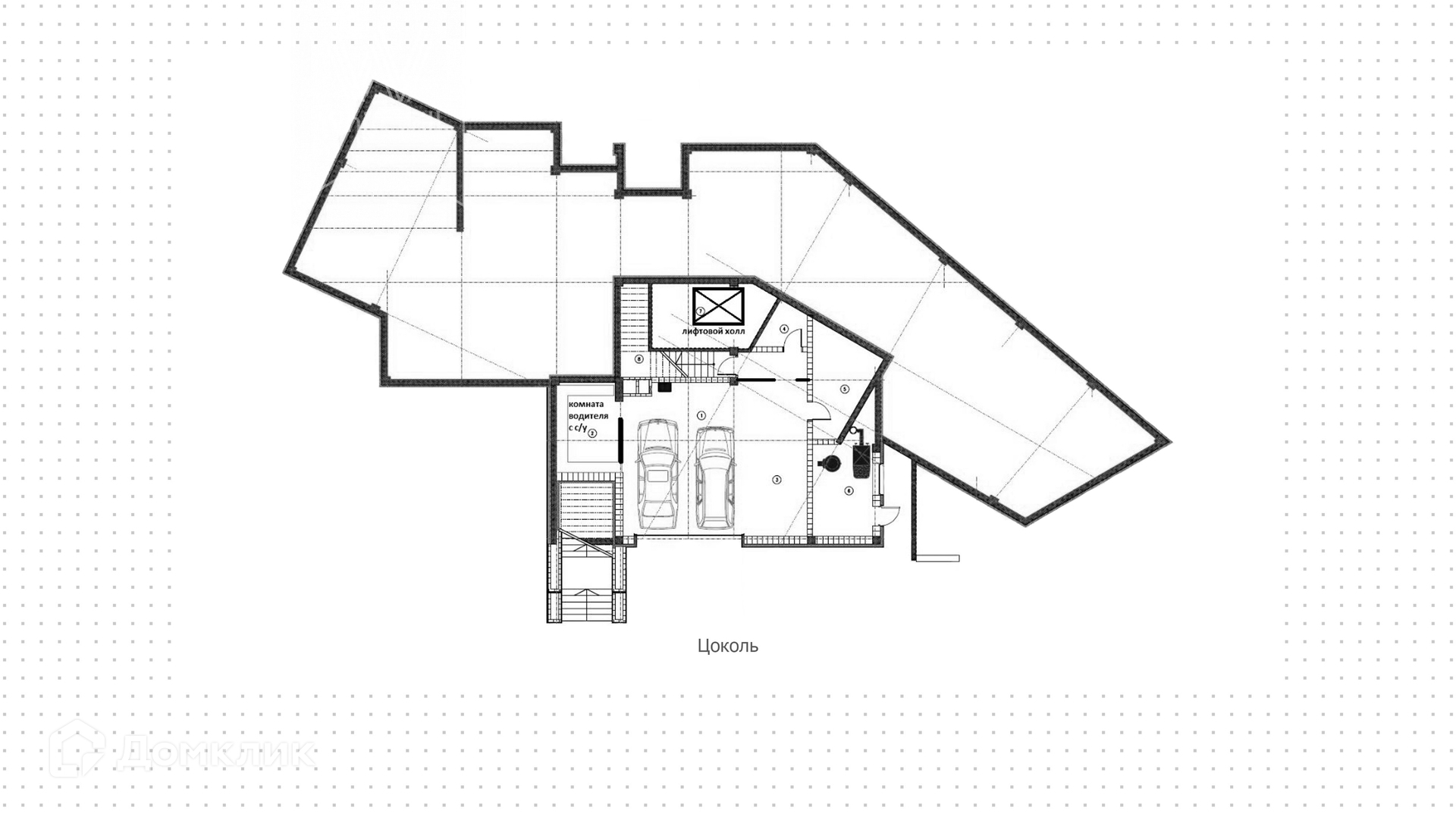 Цоколь: гараж, комната водителя с санузлом и душевой, постирочная, кладовая, гардеробная.