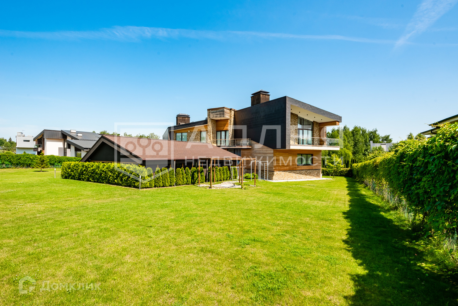 Дом: Новый  современный дом с бассейном, полностью готовый под ключ. Любая форма оплаты. В доме никто не жил. Сделана удобная планировка: есть спальня на первом этаже, кабинет и библиотека, спортзал и сауна, в гостиной сделано панорамное остекление и камин. Установлен итальянский лифт. У каждой спальни отдельный санузел. Из окон открывается красивый вид на парк и участок. Использованы дорогие отделочные материалы: индийский мрамор Палисандро, массив дуба, шпон норвежского сланца. Установлена итальянская сантехника и кухня, канальное кондиционирование. Бассейн просторный 4х10 м2 с выходом на участок для отдыха. В доме большая терраса с красивым видом и много балконов. Здесь есть все для комфортного проживания.