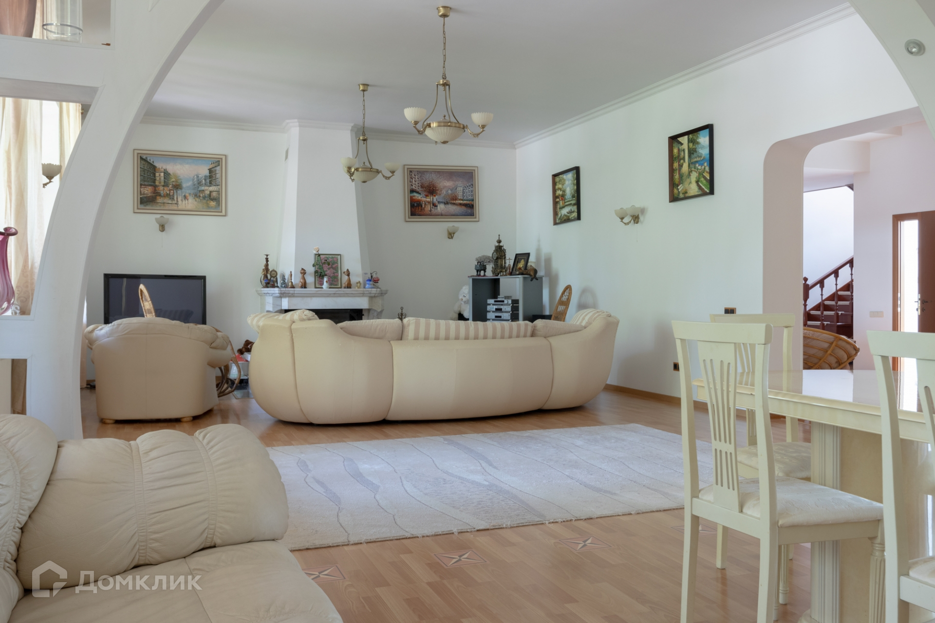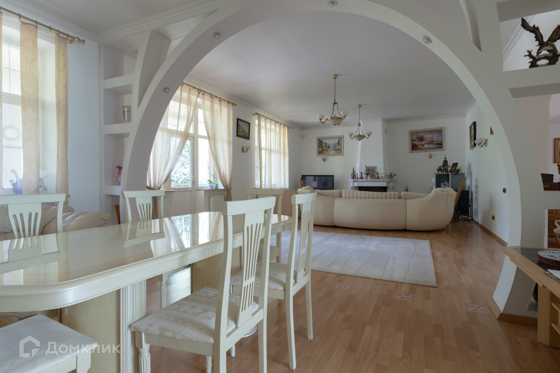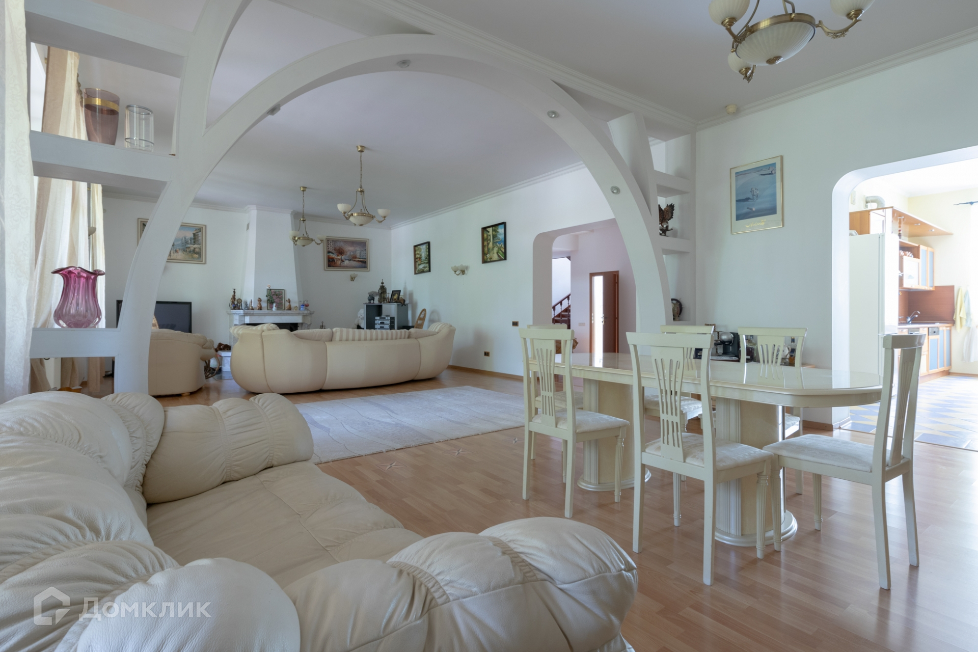 1 этаж: просторная кухня 20 кв.м., гостиная с обеденной зоной и с дровяным камином 67 кв.м., с выходом на большую летнюю веранду, большой холл, санузел, бойлерная, крытый гараж 35 кв.м.