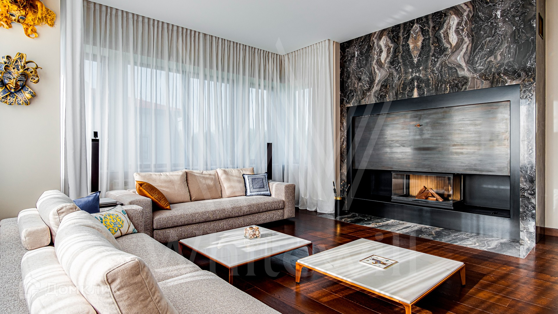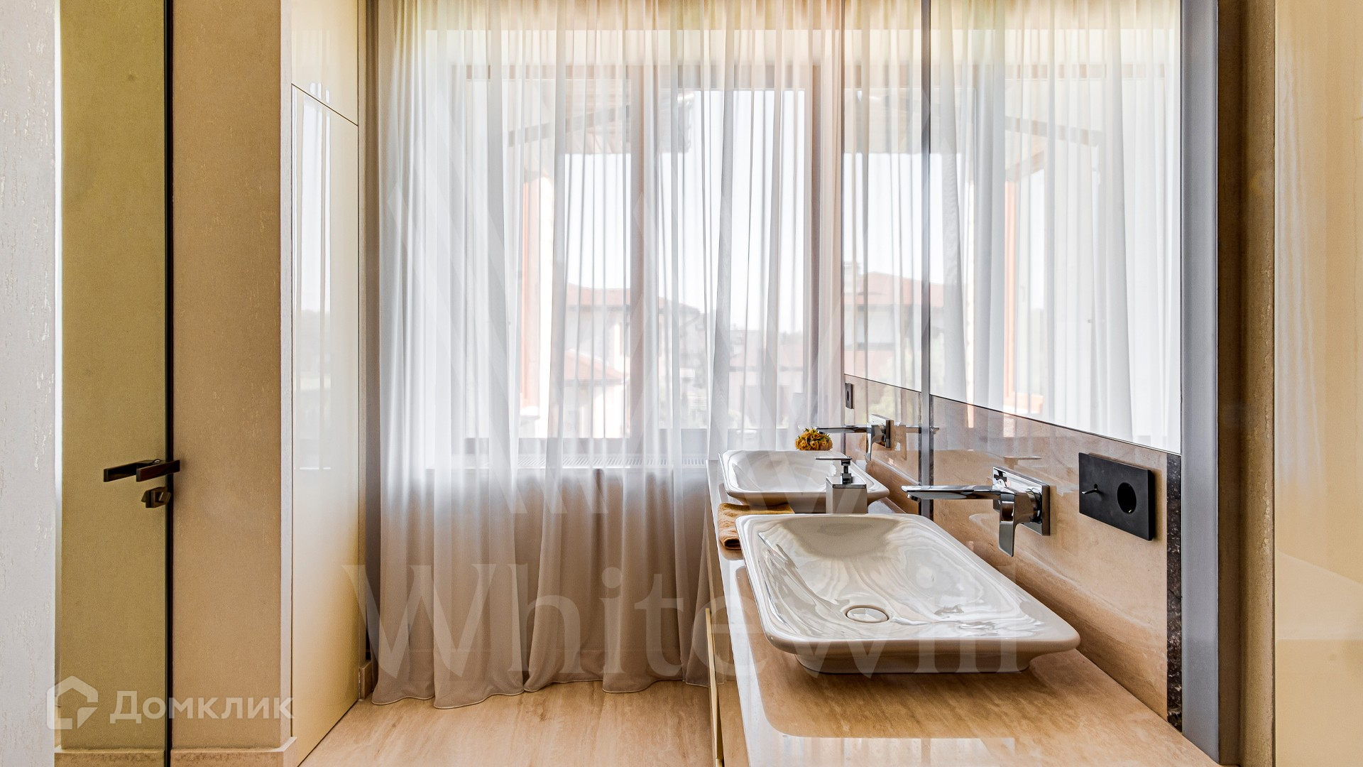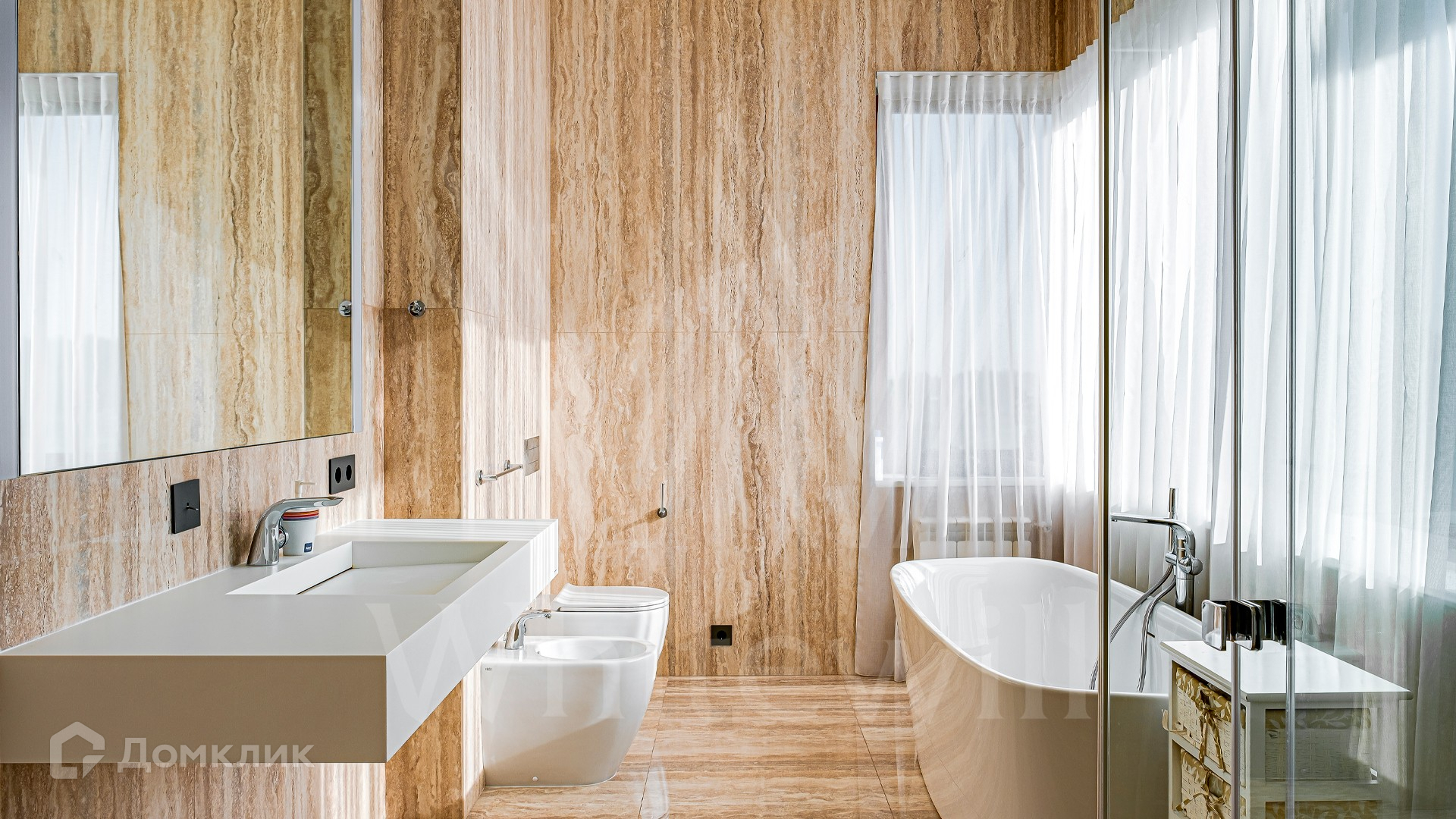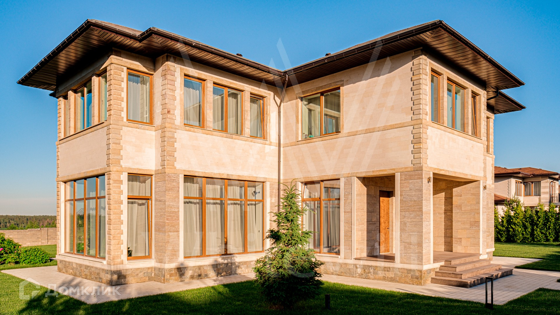 ID 10 399. Шато Соверен. Загородный дом площадью 440 м² построен на полевом участке 23 сотки. Фасад в современном стиле отделан натуральным камнем бежевого цвета. Интерьер оформлен в светлых теплых оттенках. Полы в резиденции выполнены мрамора, травертина и паркета из Италии. В оформлении использованы итальянские керамогранит Fiandre, раздвижные двери и стеновые панели LONGHI. Установлена сантехника HIPPE, Cielo, Gessi, Bisazza, Antonio Lupi, Duravit, Ideal Standard и кухня фабрики Mittel. Центр притяжения дома — уюутная гостиная с камином, где можно собраться всей семьей. В коттедже спланировали 3 спальни, столовую с выходом на террасу. На участке выполнен ландшафтный дизайн, вымощены дорожки, по периметру высажены туи.