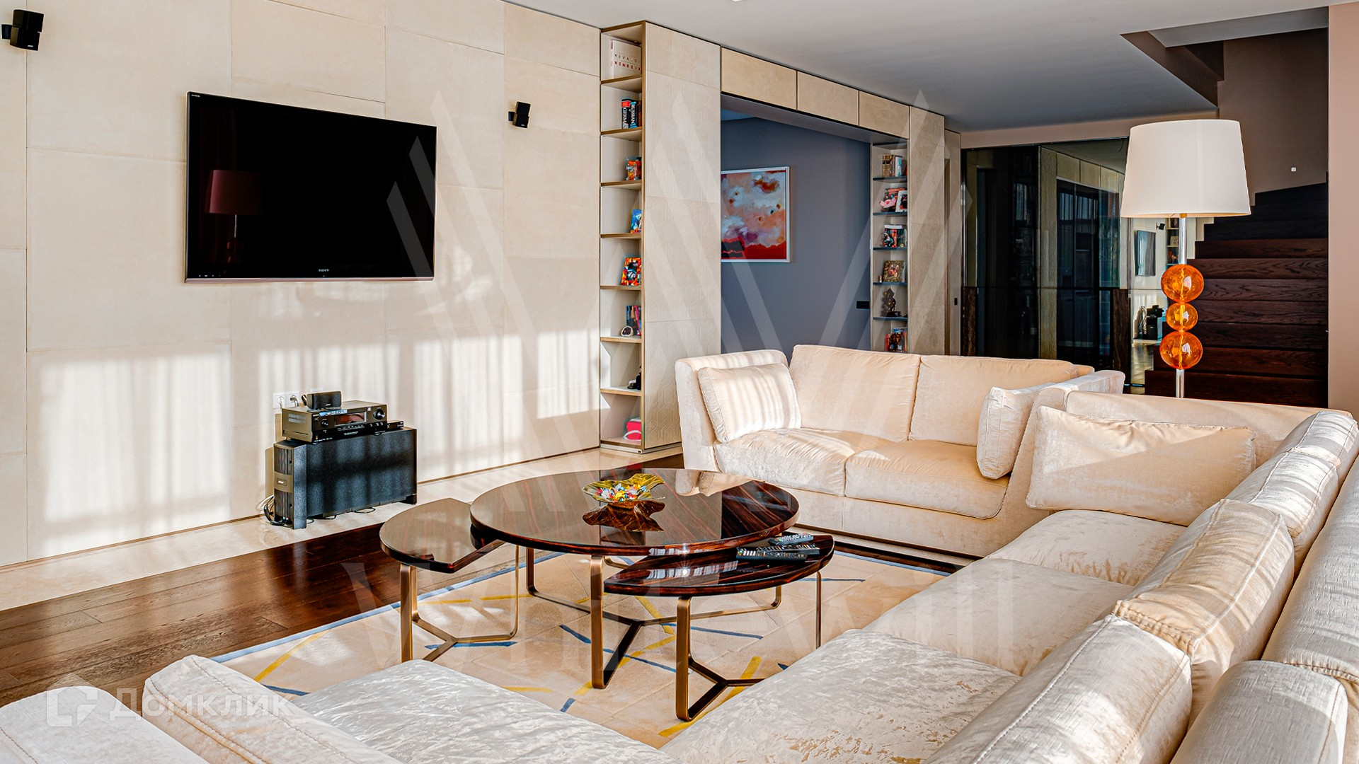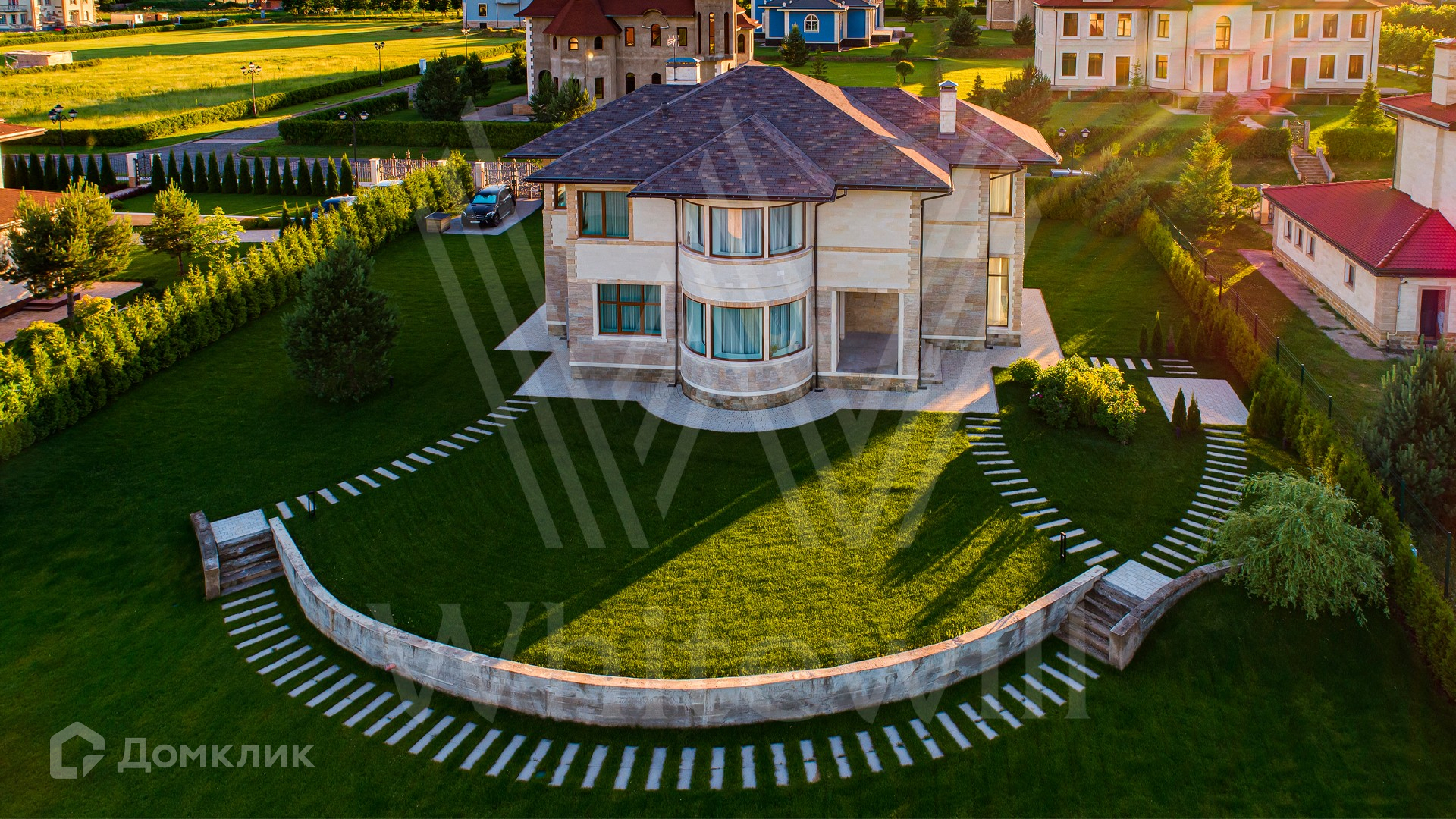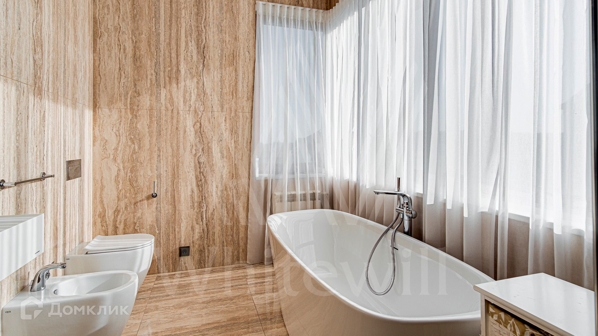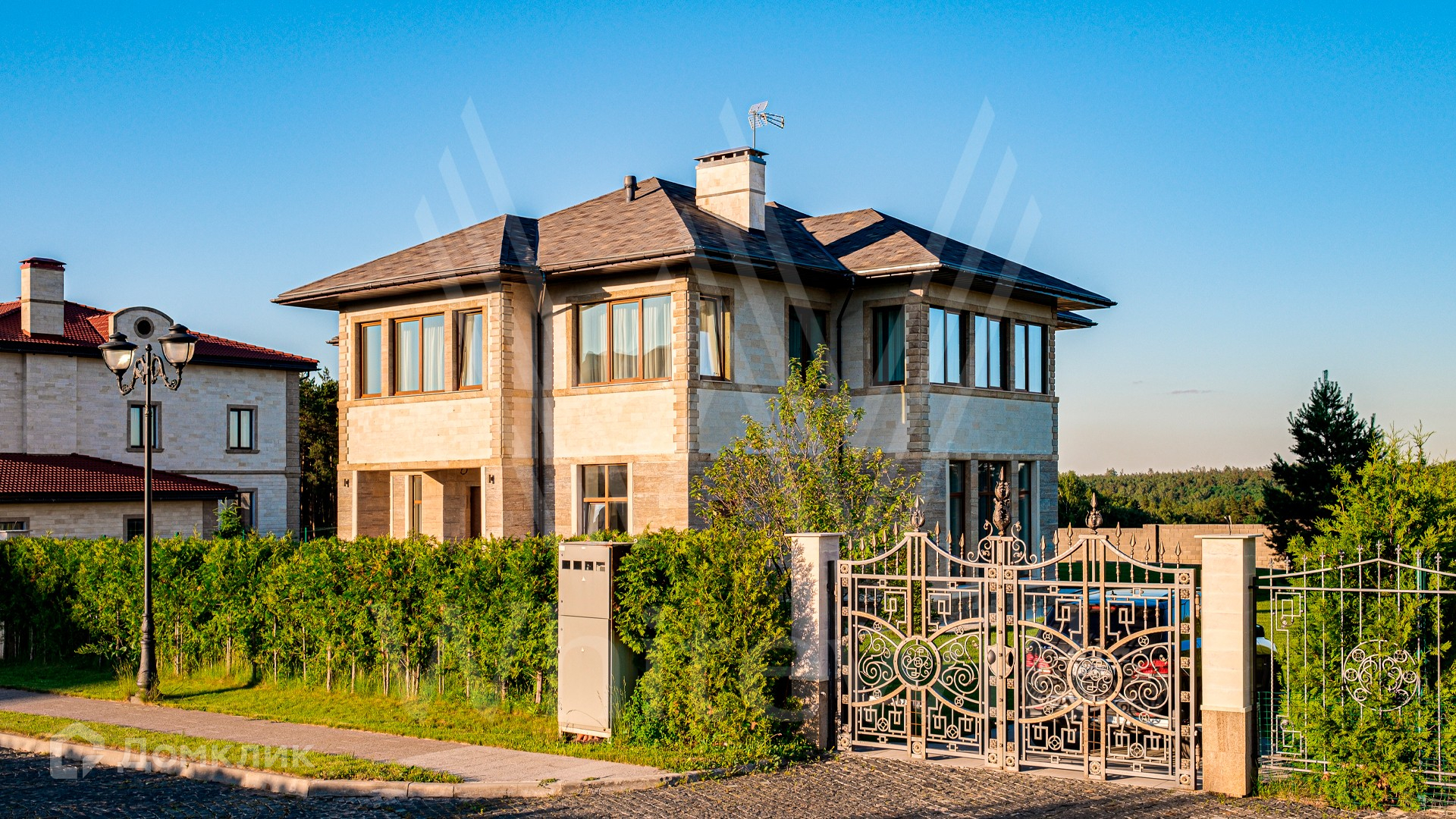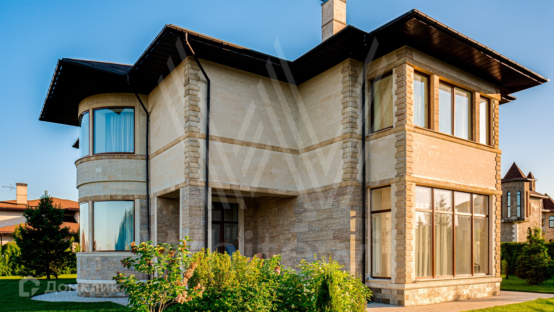 ID 10 399. Шато Соверен. Загородный дом площадью 440 м² построен на полевом участке 23 сотки. Фасад в современном стиле отделан натуральным камнем бежевого цвета. Интерьер оформлен в светлых теплых оттенках. Полы в резиденции выполнены мрамора, травертина и паркета из Италии. В оформлении использованы итальянские керамогранит Fiandre, раздвижные двери и стеновые панели LONGHI. Установлена сантехника HIPPE, Cielo, Gessi, Bisazza, Antonio Lupi, Duravit, Ideal Standard и кухня фабрики Mittel. Центр притяжения дома — уюутная гостиная с камином, где можно собраться всей семьей. В коттедже спланировали 3 спальни, столовую с выходом на террасу. На участке выполнен ландшафтный дизайн, вымощены дорожки, по периметру высажены туи.