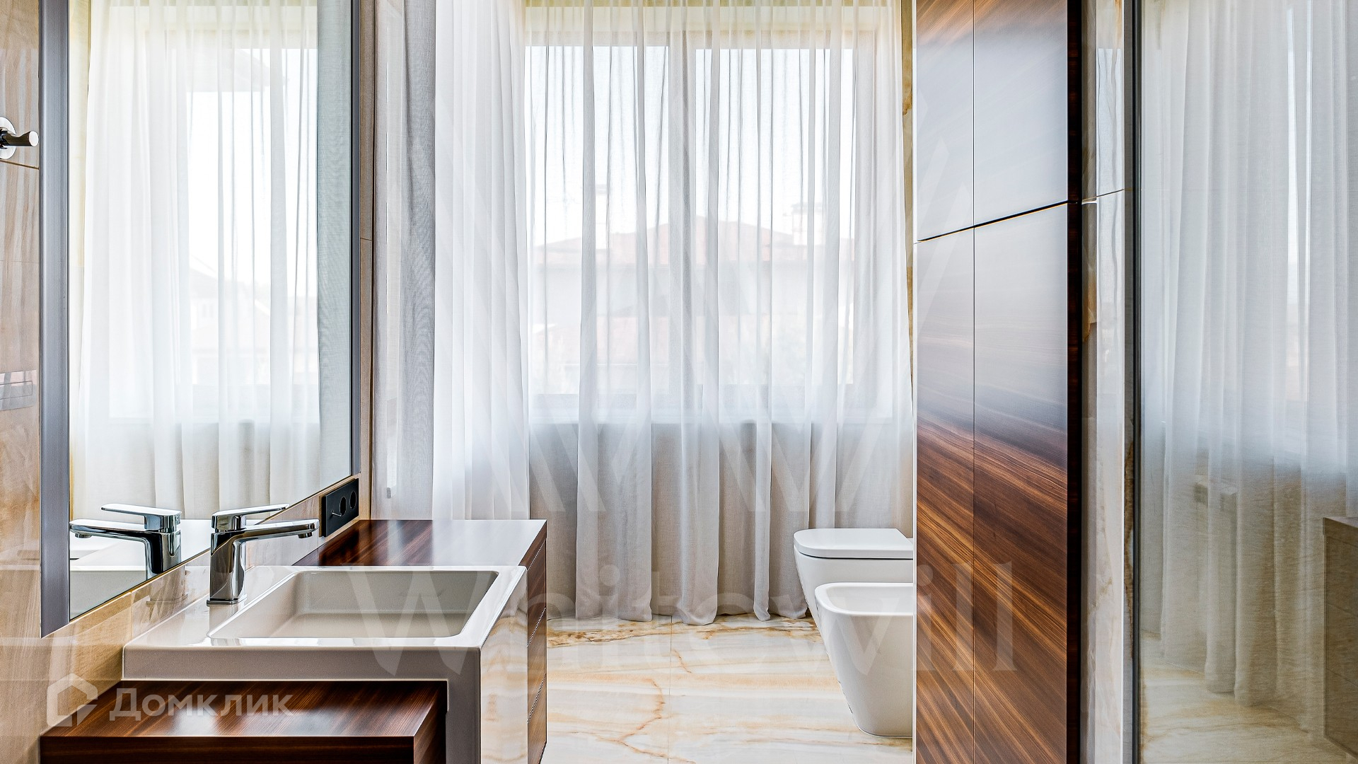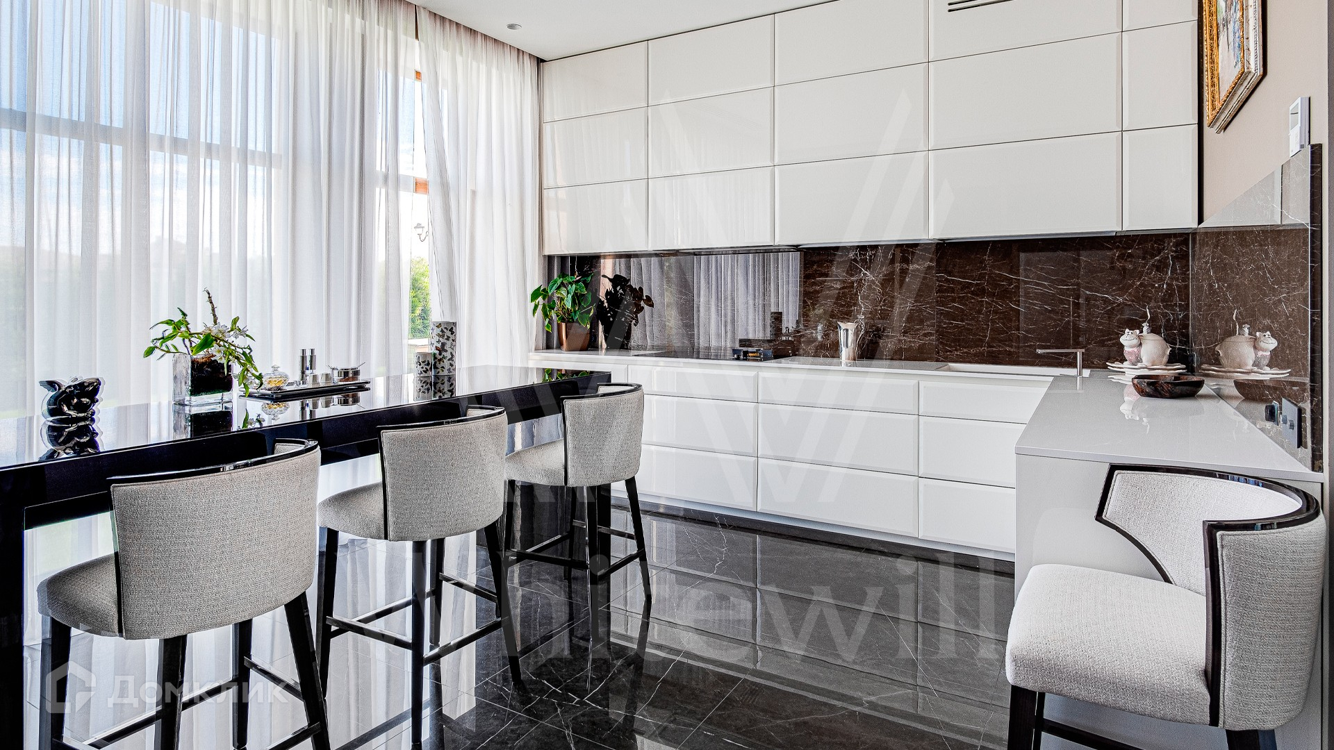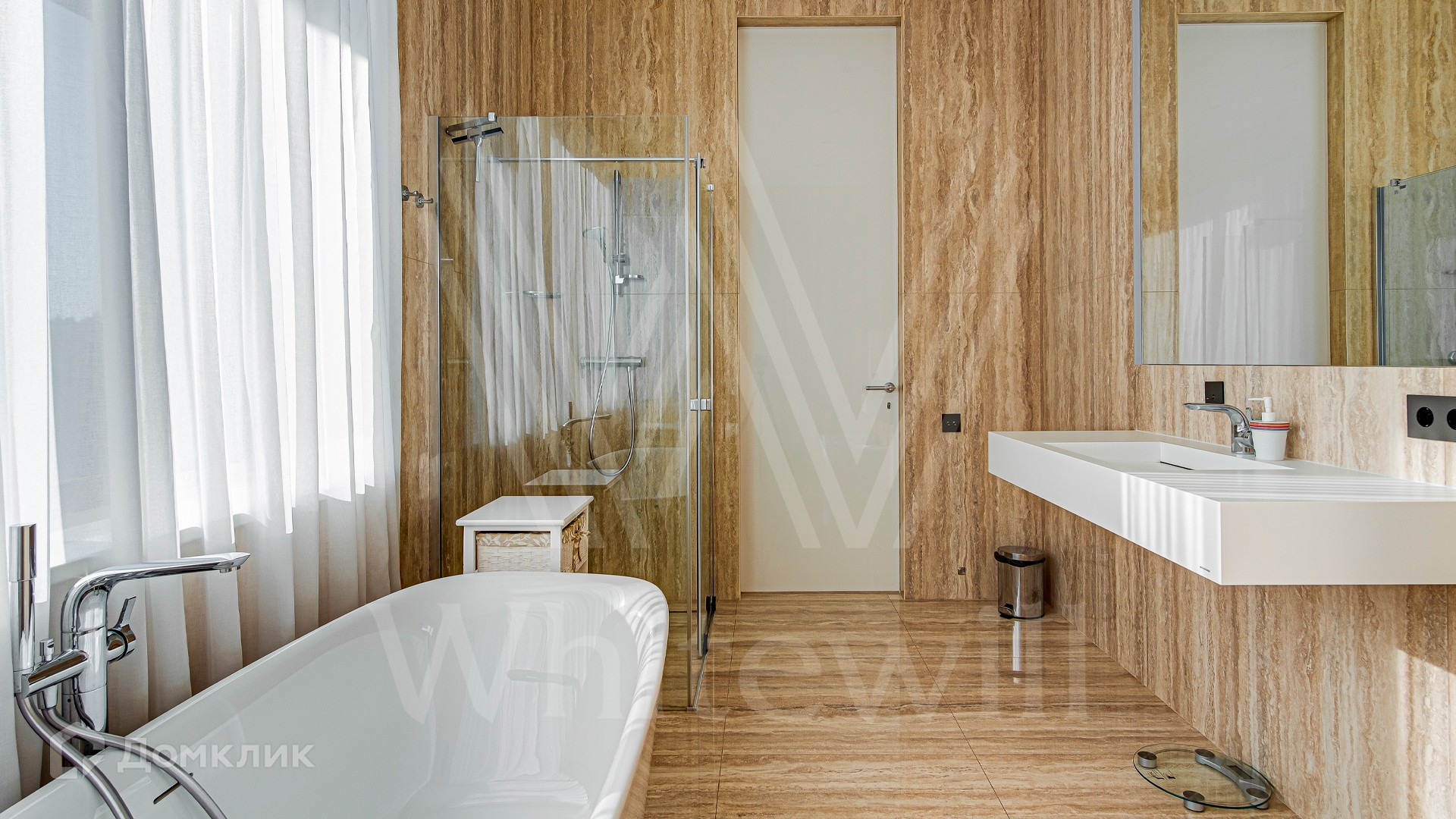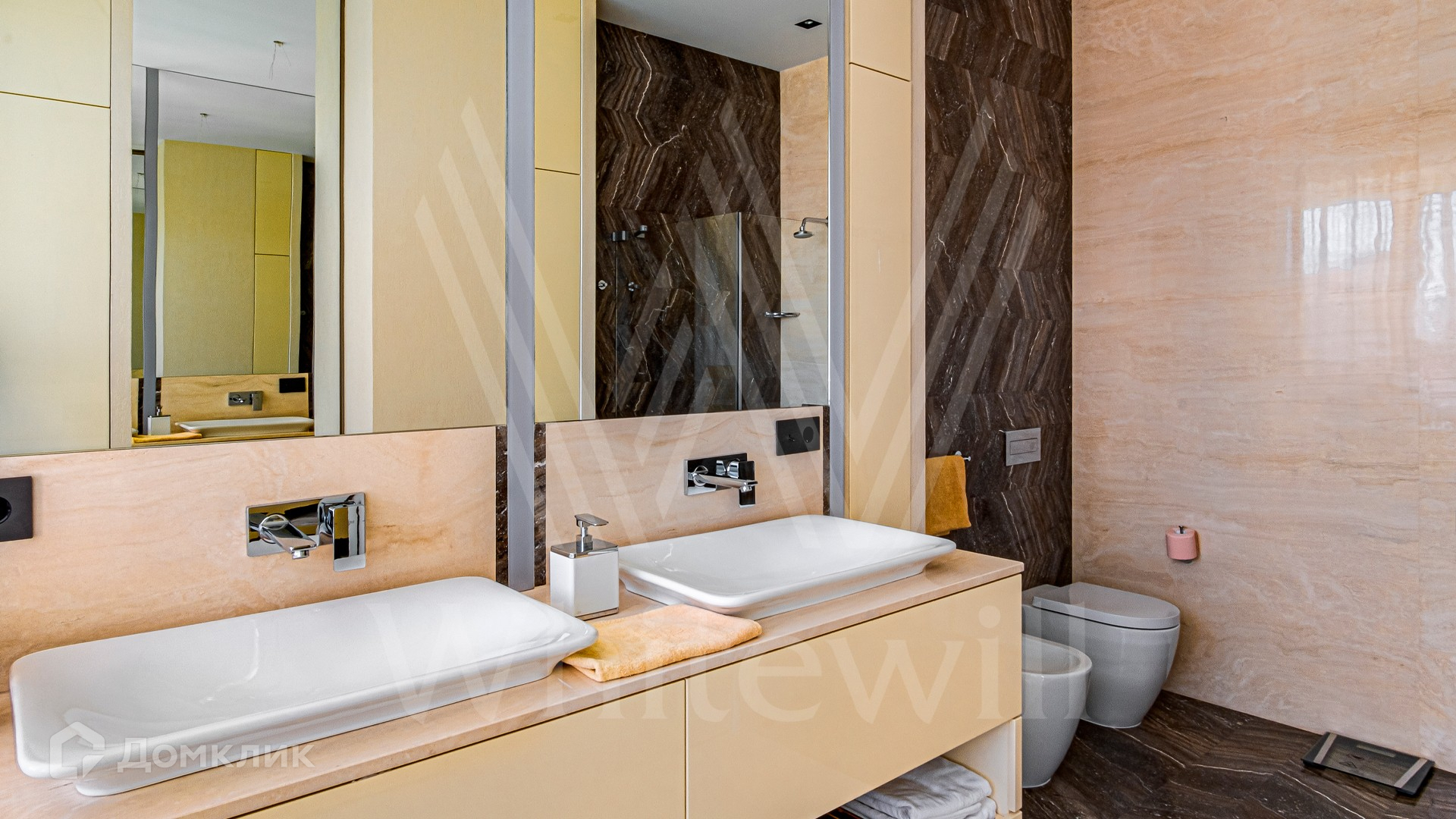 ID 10 399. Шато Соверен. Загородный дом площадью 440 м² построен на полевом участке 23 сотки. Фасад в современном стиле отделан натуральным камнем бежевого цвета. Интерьер оформлен в светлых теплых оттенках. Полы в резиденции выполнены мрамора, травертина и паркета из Италии. В оформлении использованы итальянские керамогранит Fiandre, раздвижные двери и стеновые панели LONGHI. Установлена сантехника HIPPE, Cielo, Gessi, Bisazza, Antonio Lupi, Duravit, Ideal Standard и кухня фабрики Mittel. Центр притяжения дома — уюутная гостиная с камином, где можно собраться всей семьей. В коттедже спланировали 3 спальни, столовую с выходом на террасу. На участке выполнен ландшафтный дизайн, вымощены дорожки, по периметру высажены туи.