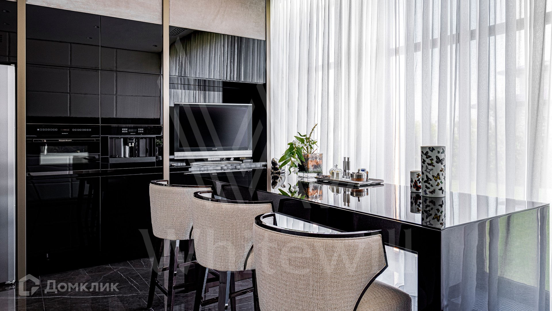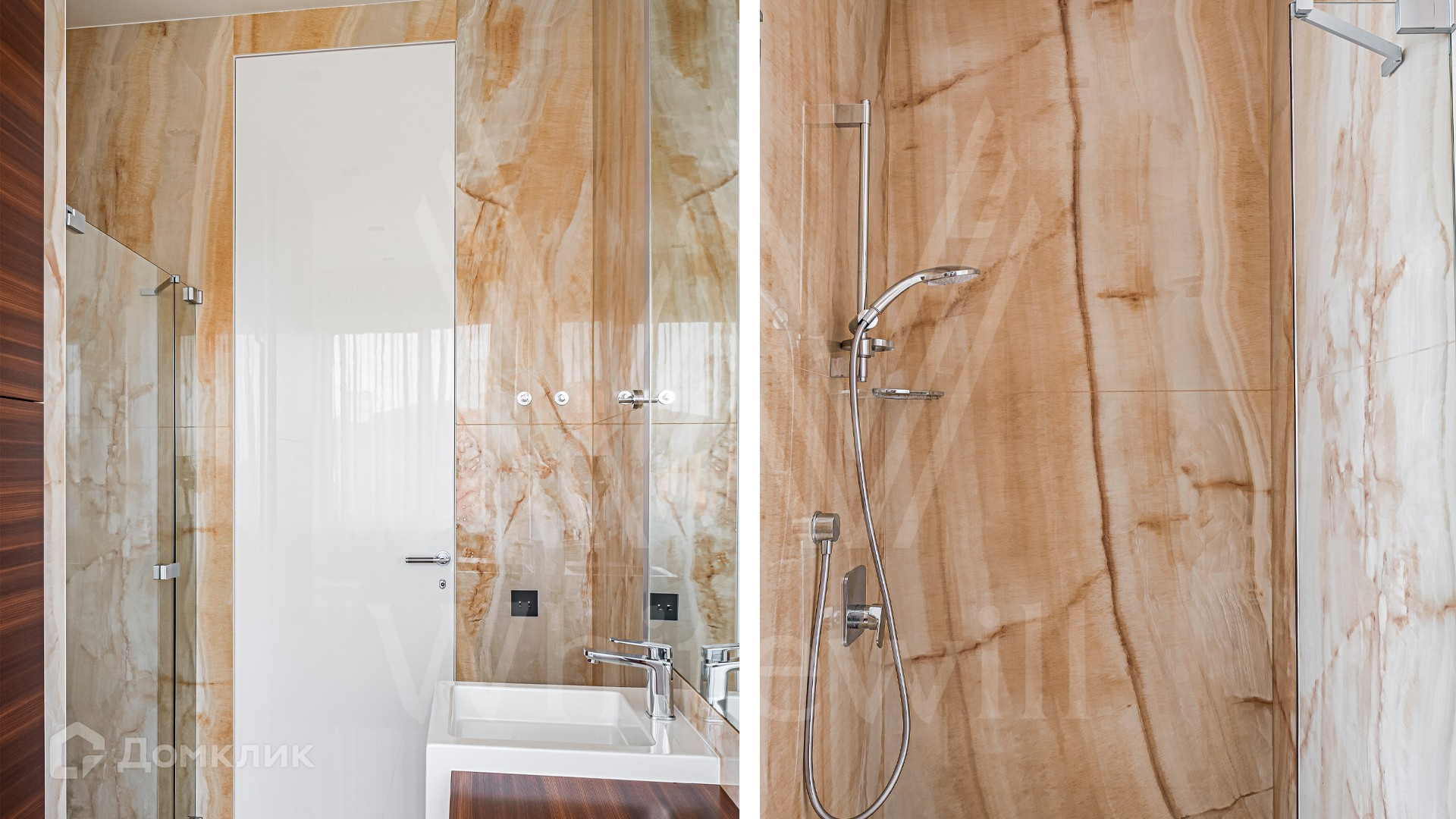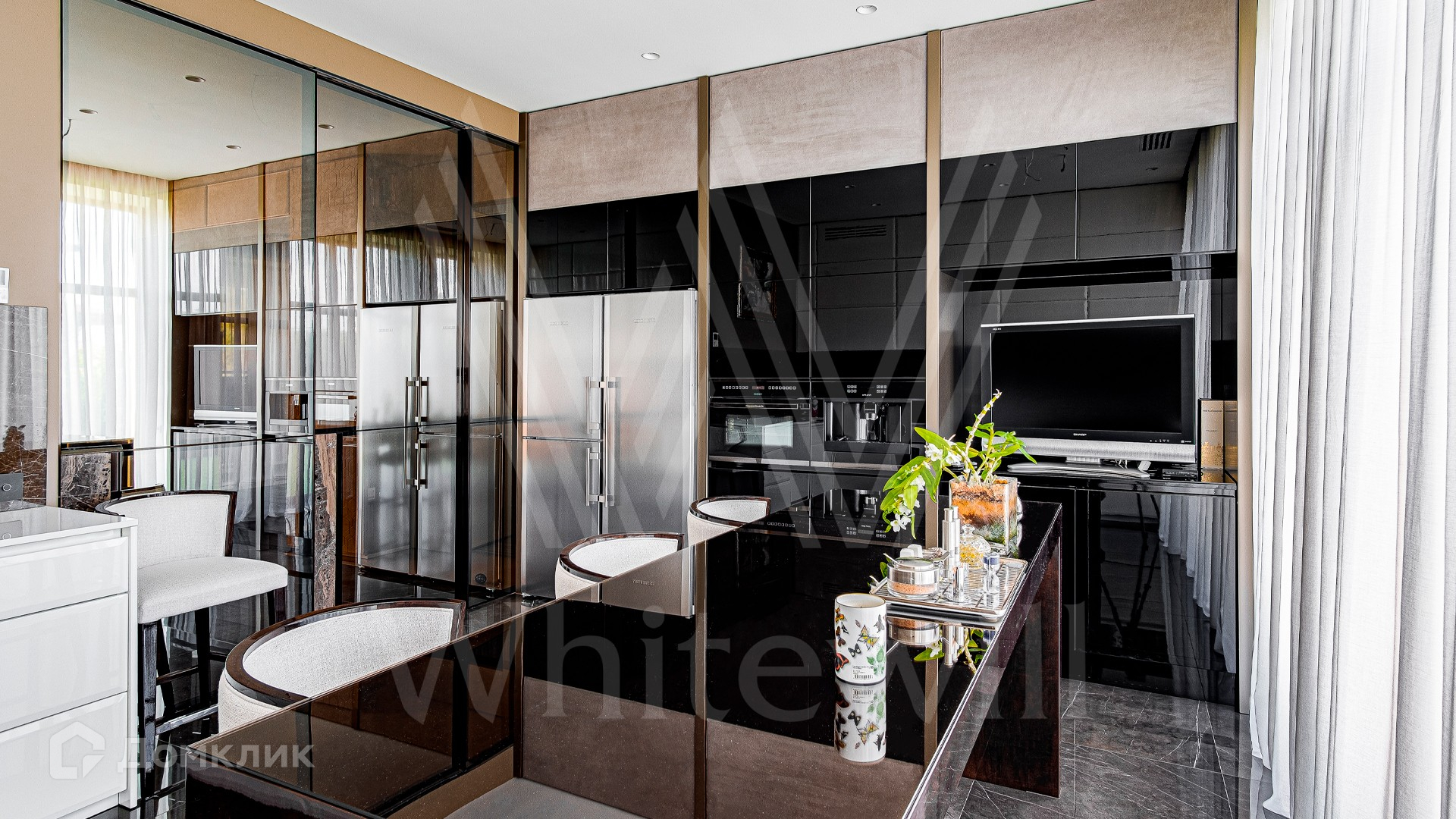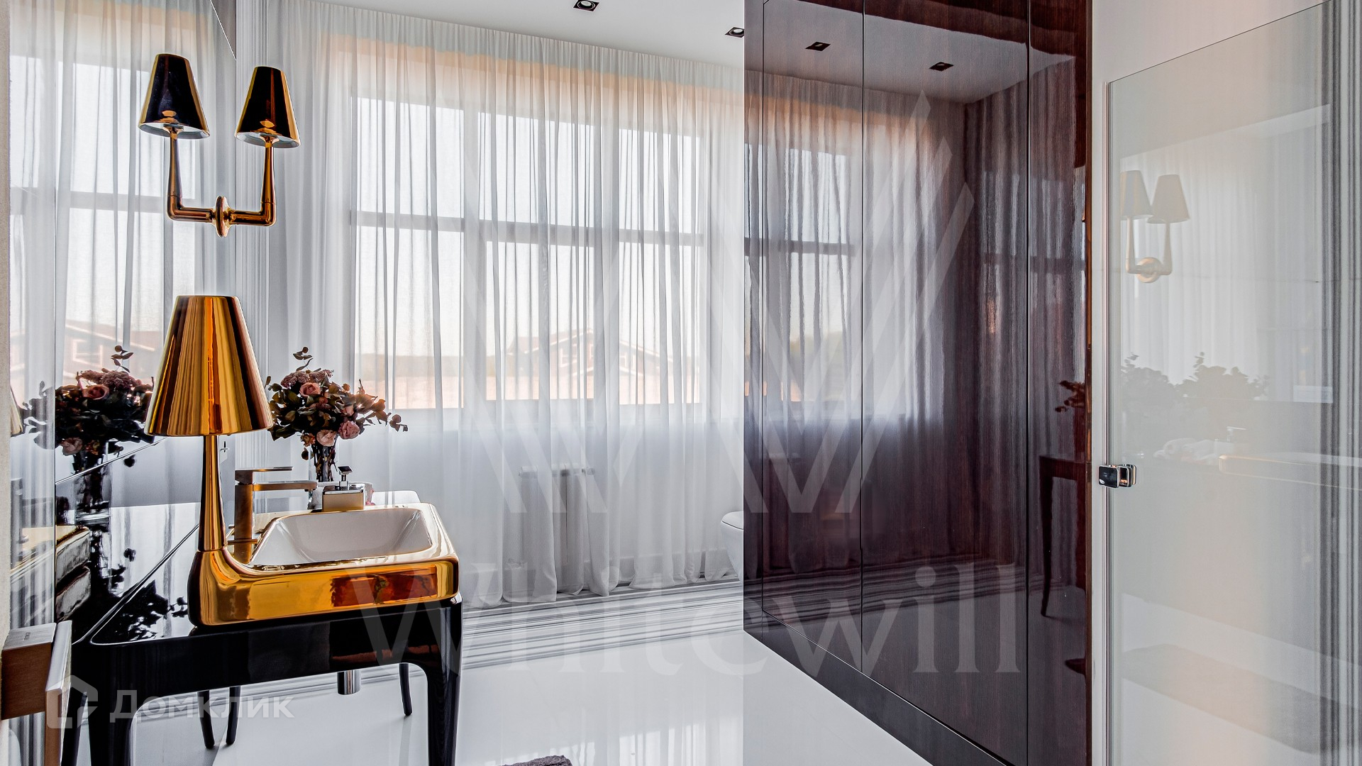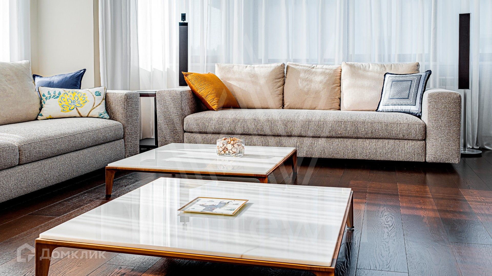 ID 10 399. Шато Соверен. Загородный дом площадью 440 м² построен на полевом участке 23 сотки. Фасад в современном стиле отделан натуральным камнем бежевого цвета. Интерьер оформлен в светлых теплых оттенках. Полы в резиденции выполнены мрамора, травертина и паркета из Италии. В оформлении использованы итальянские керамогранит Fiandre, раздвижные двери и стеновые панели LONGHI. Установлена сантехника HIPPE, Cielo, Gessi, Bisazza, Antonio Lupi, Duravit, Ideal Standard и кухня фабрики Mittel. Центр притяжения дома — уюутная гостиная с камином, где можно собраться всей семьей. В коттедже спланировали 3 спальни, столовую с выходом на террасу. На участке выполнен ландшафтный дизайн, вымощены дорожки, по периметру высажены туи.