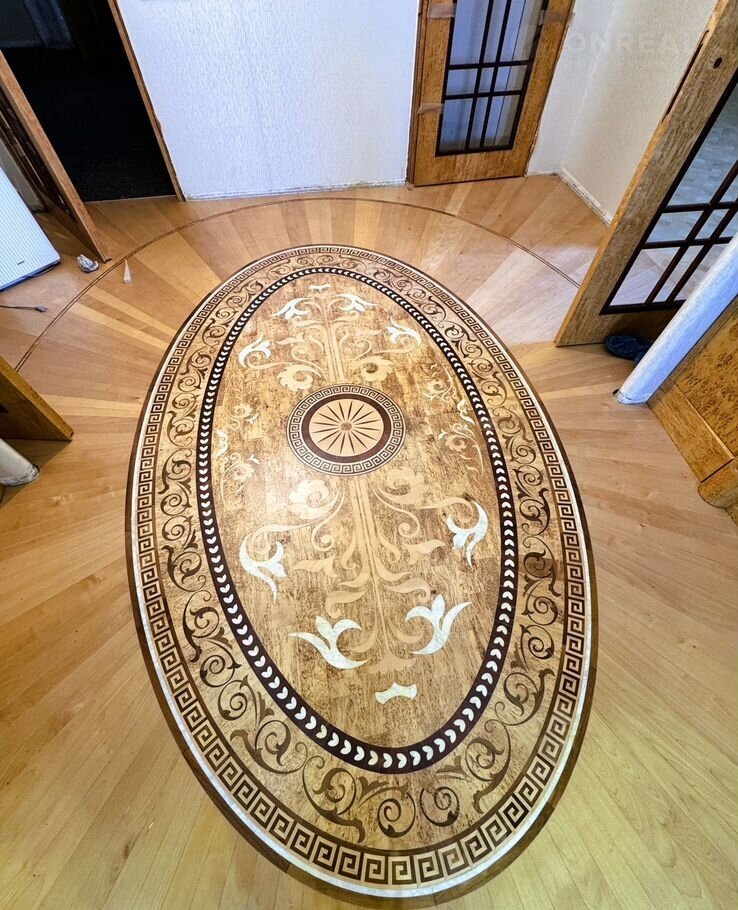 Натуральный наборный дубовый паркет с орнаментами и перламутровыми вкраплениями-пол;