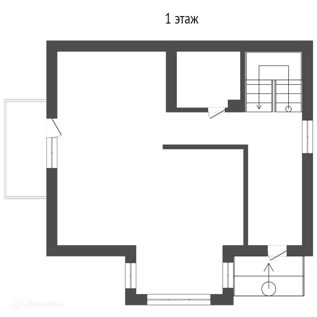 На первом этаже кухня-гостиная 44 м2 с выходом на  террасу, санузел.