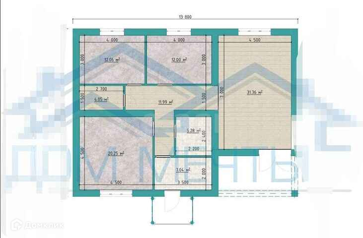 Тамбур - 4 м.кв., Холл - 6 м кв., санузел - 5 м.кв., две спальны -12 м.кв., Кухня-гостиная -28 м.кв.