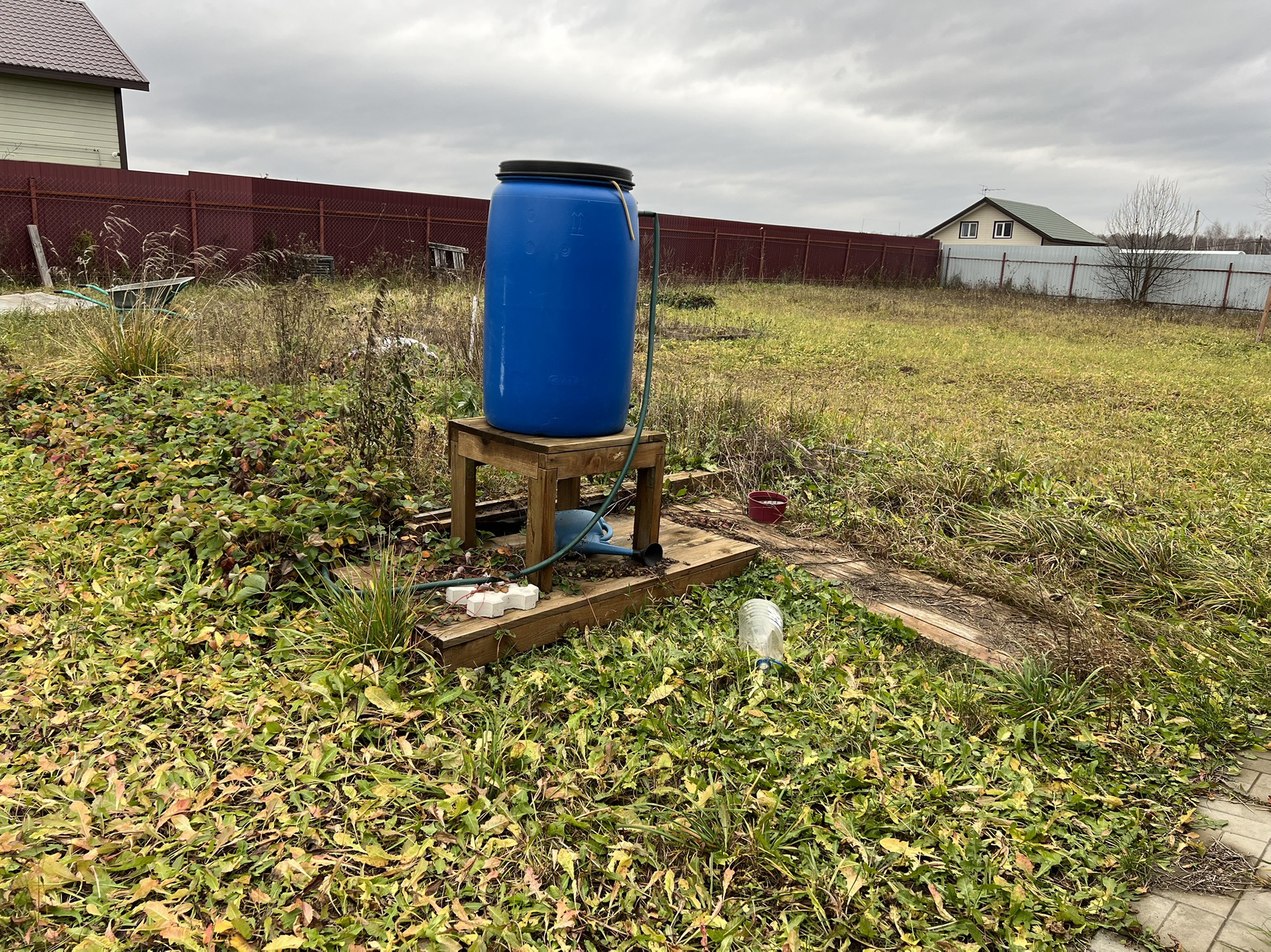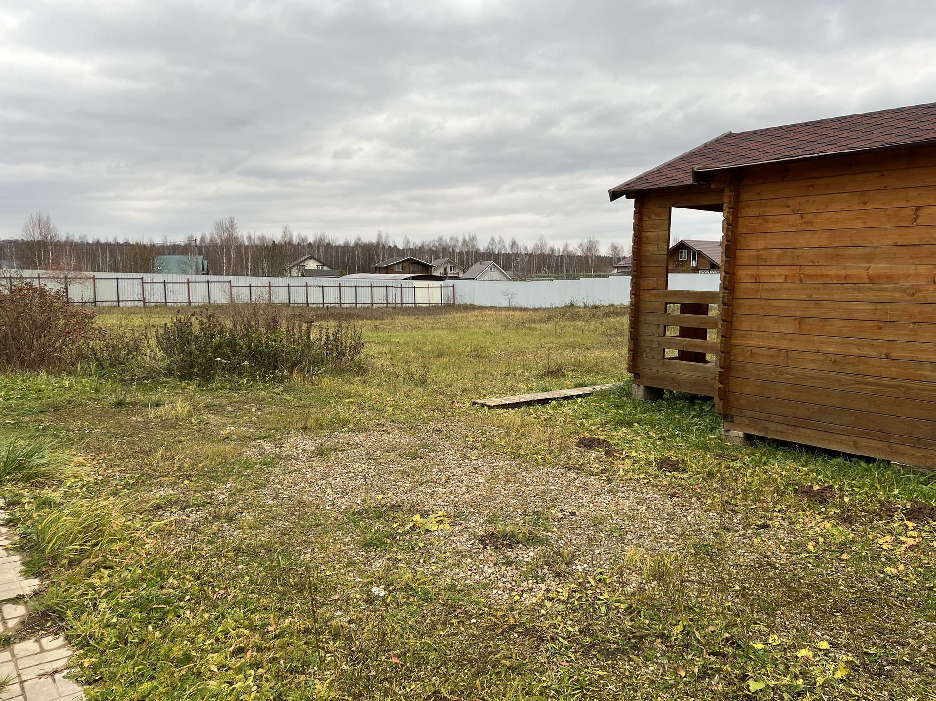 Участок обнесен забором, на участке есть цветы, декоративные растения, заросли клубники, место под парник.  Соседи живут круглогодично, поселок охраняется, въезд по шлагбауму.