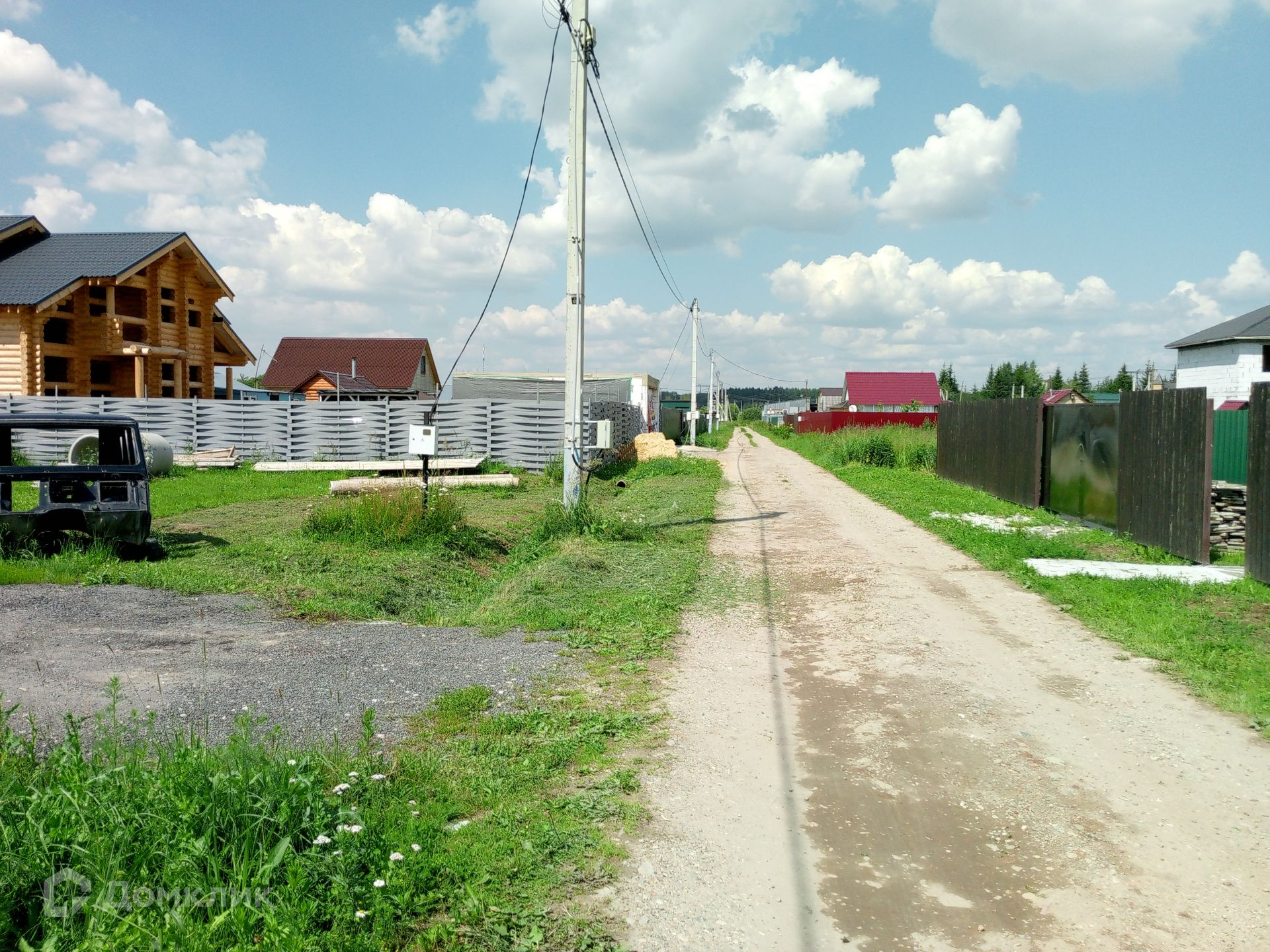 Участок ровный, сухой, прямоугольной формы. Соседи активно строятся. К участку подведено электричество 15 кВт. Заезд на участок по дороге отсыпанной гравием.