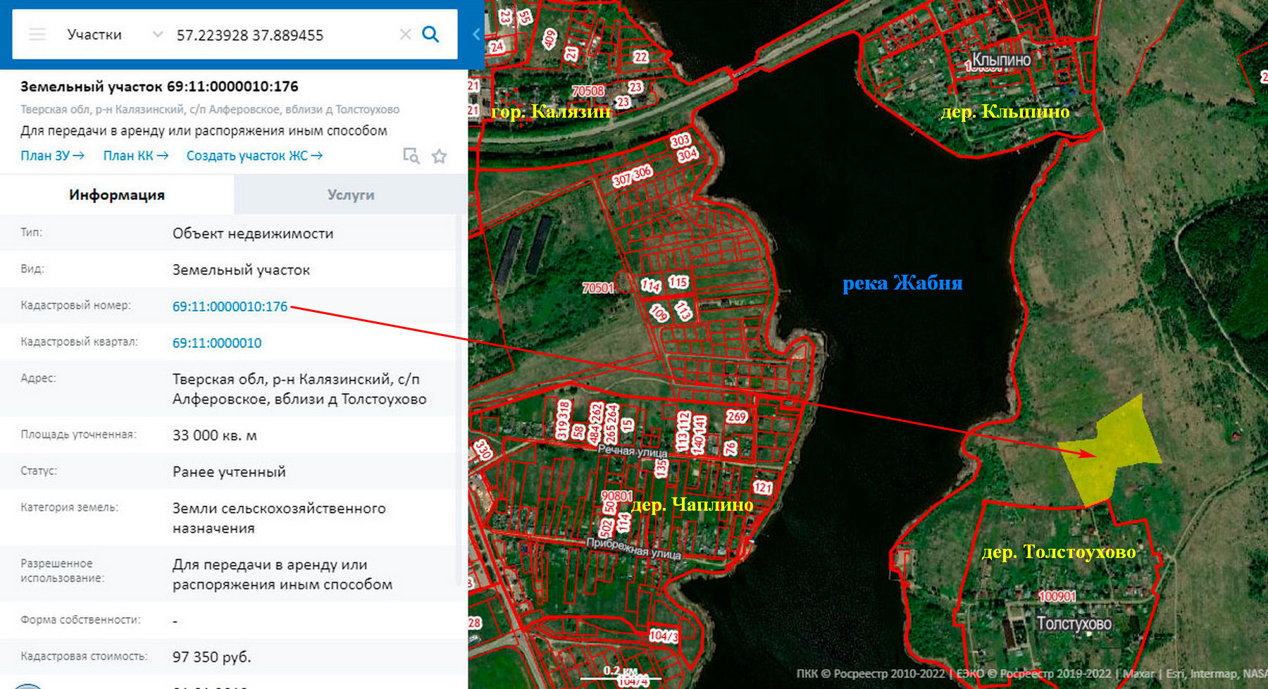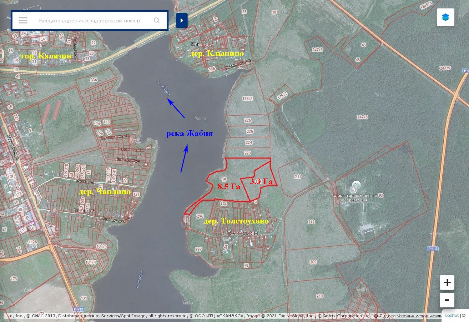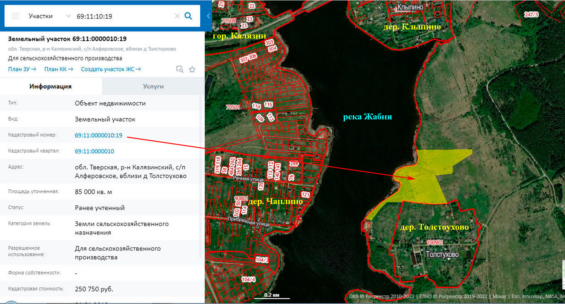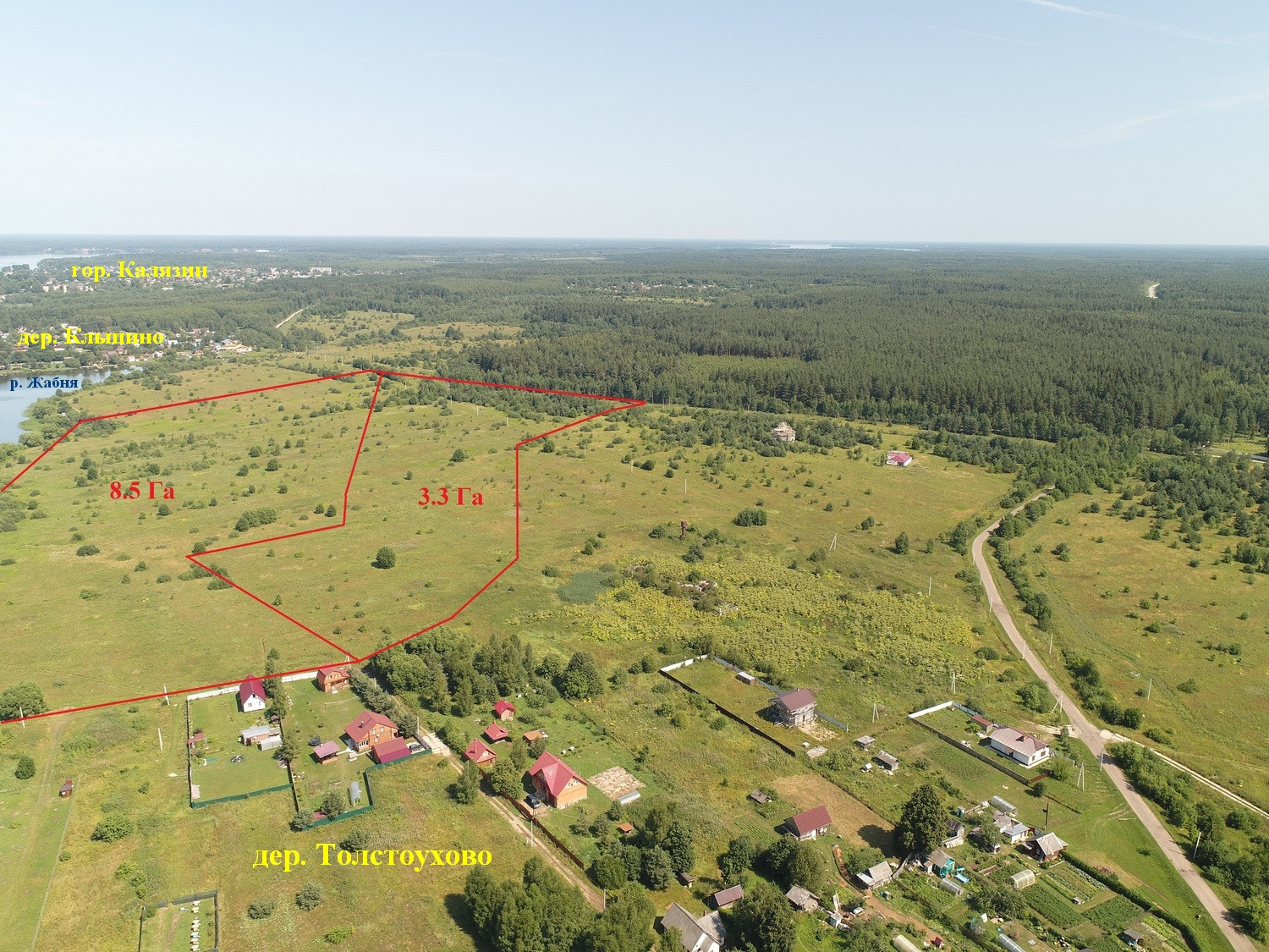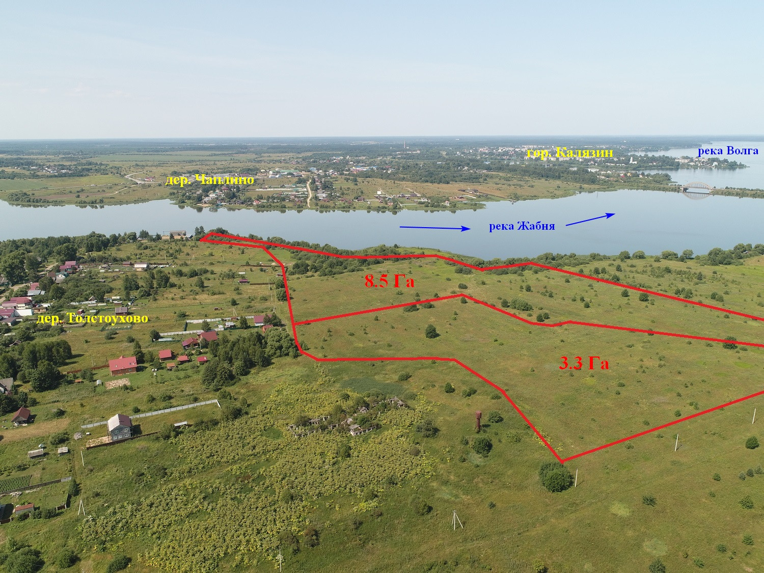 Предлагаются к продаже 2-а земельных участка вблизи деревни Толстоухово Алферовского сельского поселения Калязинского района Тверской области общей площадью 11,8 га (8,5 Га, 3,3 Га). К № 69:11:0000010:19, К № 69:11:0000010:176. Категория земель – земли сельскохозяйственного назначения. Вид разрешенного использования – для сельскохозяйственного производства, передачу в аренду или распоряжения иным способом (возможно изменение разрешенного использования). Цена - 23 600 000 рублей (разумный торг). Продается как единый массив. Очень красивые места. Река Жабня. Собственная береговая линия длиной 600 м. Пологий берег. Дно песчаное. Ширина реки от 300 до 500 м. Большая деревня. Есть дом отдыха, магазин, медпункт. Электричество проходит по границе участка. Возможность подключения есть. Река, леса, поля. Рыбалка, охота. До реки Волга (Угличское водохранилище) – 2 км. 300 метров  по реке Жабня. До гор. Калязина 6,5 км., до МКАД 180 км. Приятное место для коттеджного поселка, базы отдыха (аренда домов), фермерского хозяйства и т.д.