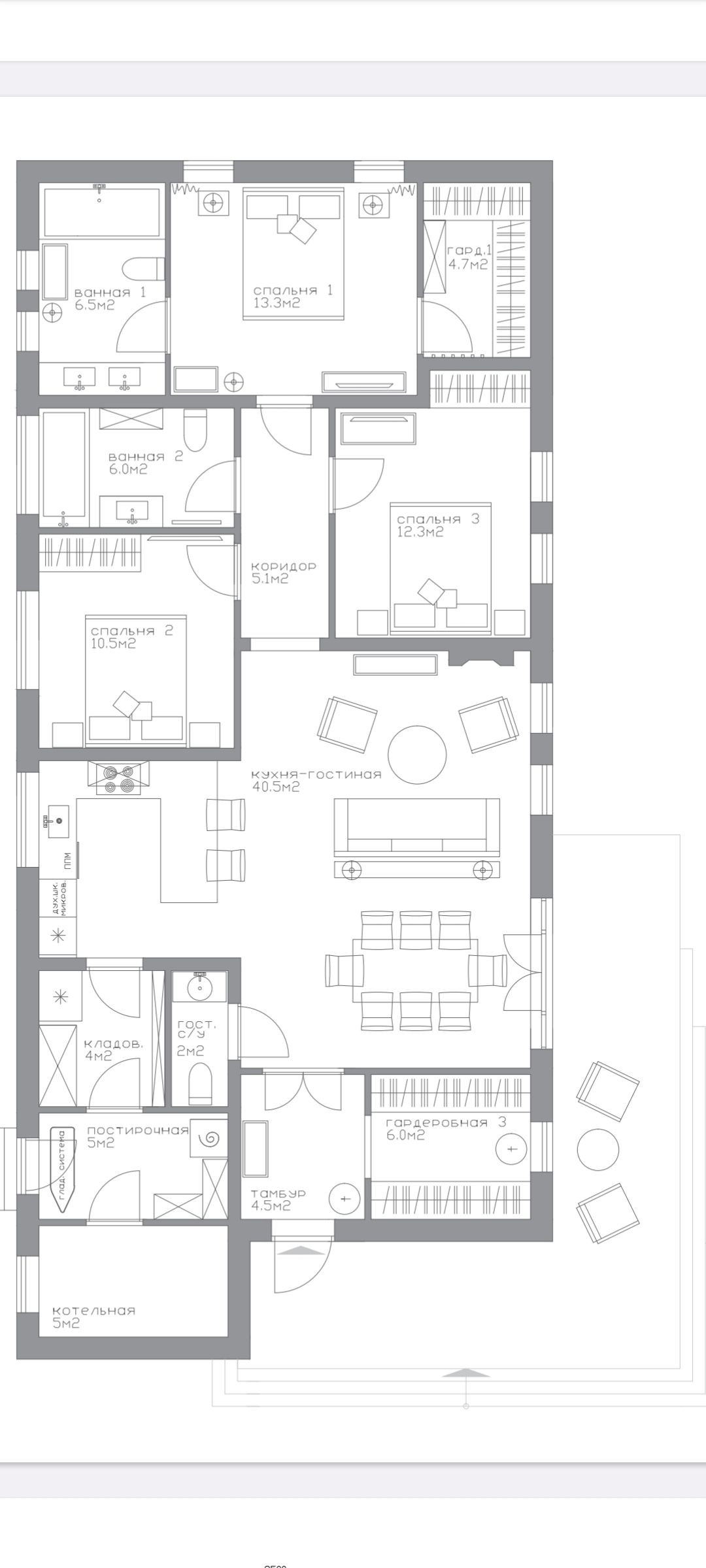 -три спальни из которых одна хозяйская со своей гардеробной комнатой и отдельным санузлом,