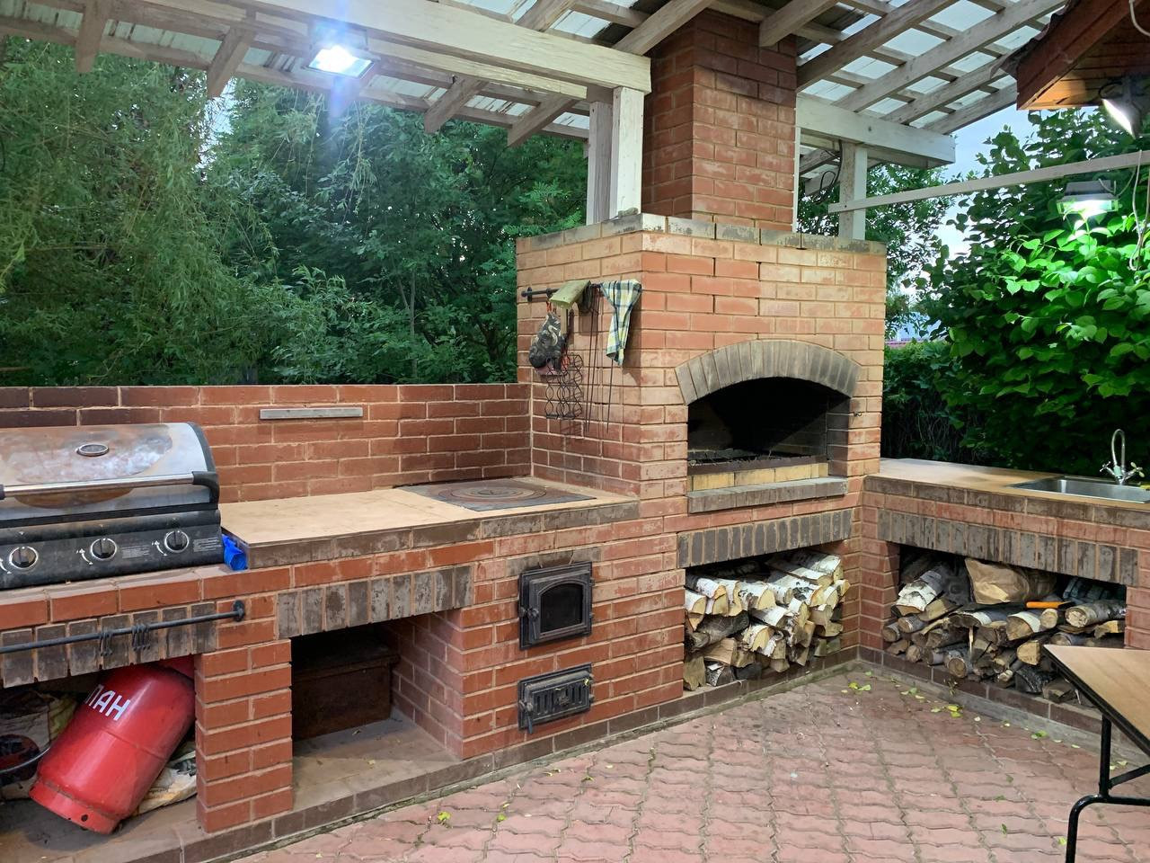 Отдельная уличная зона отдыха с барбекю комплексом с мангалом, грилем, коптильней, раковиной с горячей водой и летней кухней с посудомоечной машиной, холодильником.