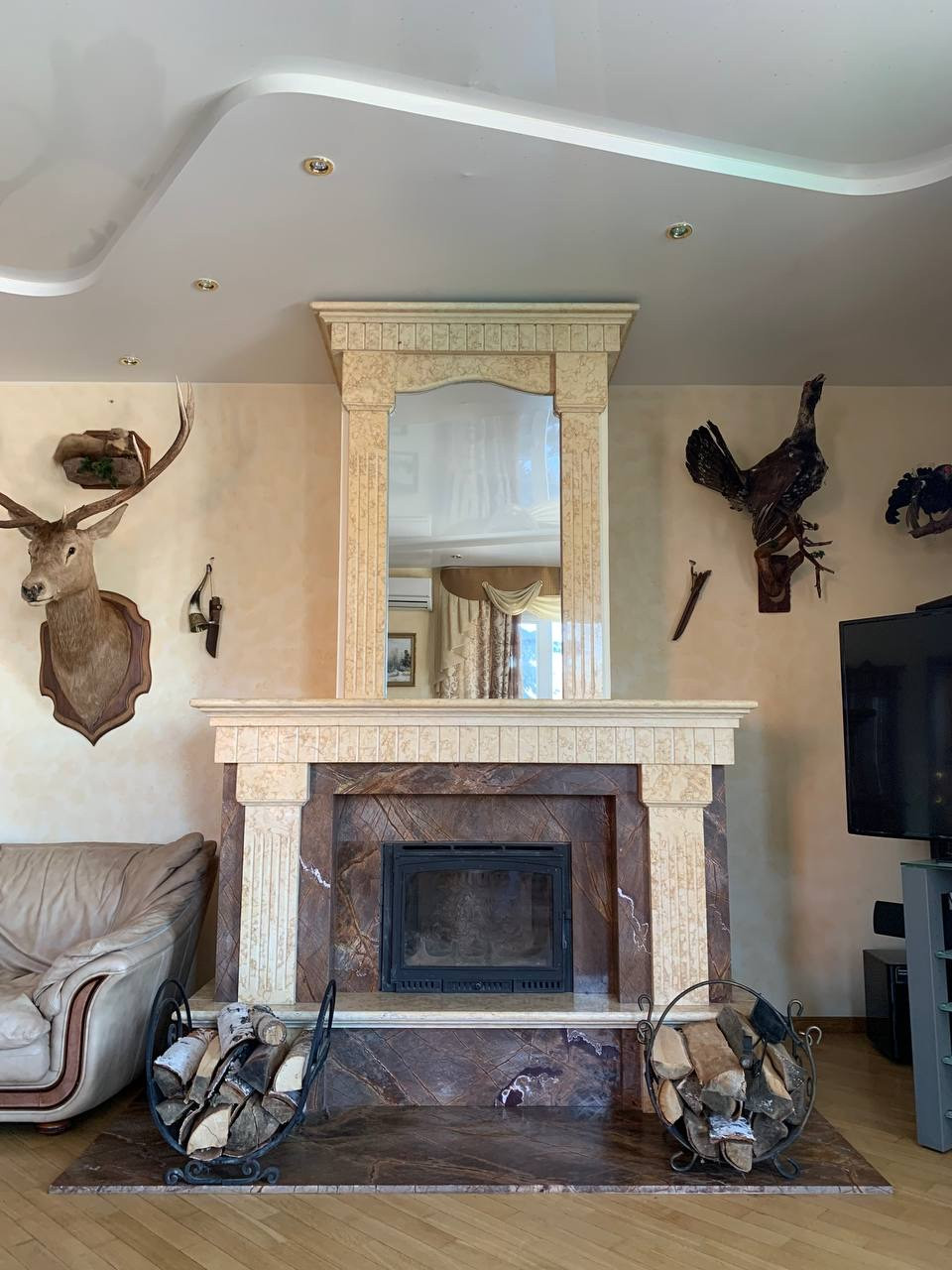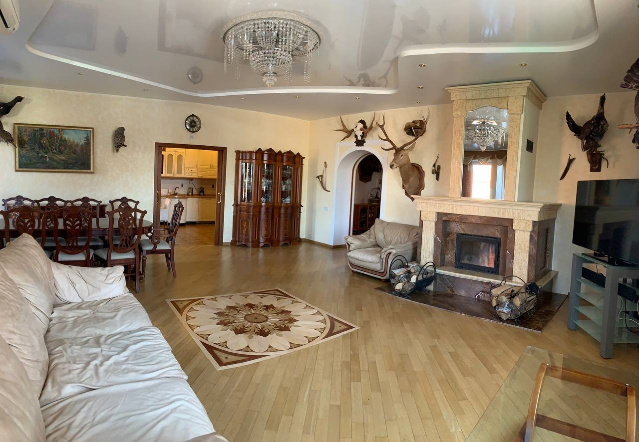 Первый этаж: Кухня, переходящая в гостиную с камином, отделанным мрамором, наборный паркет, обеденный стол на 8 человек. Туалет с ванной.