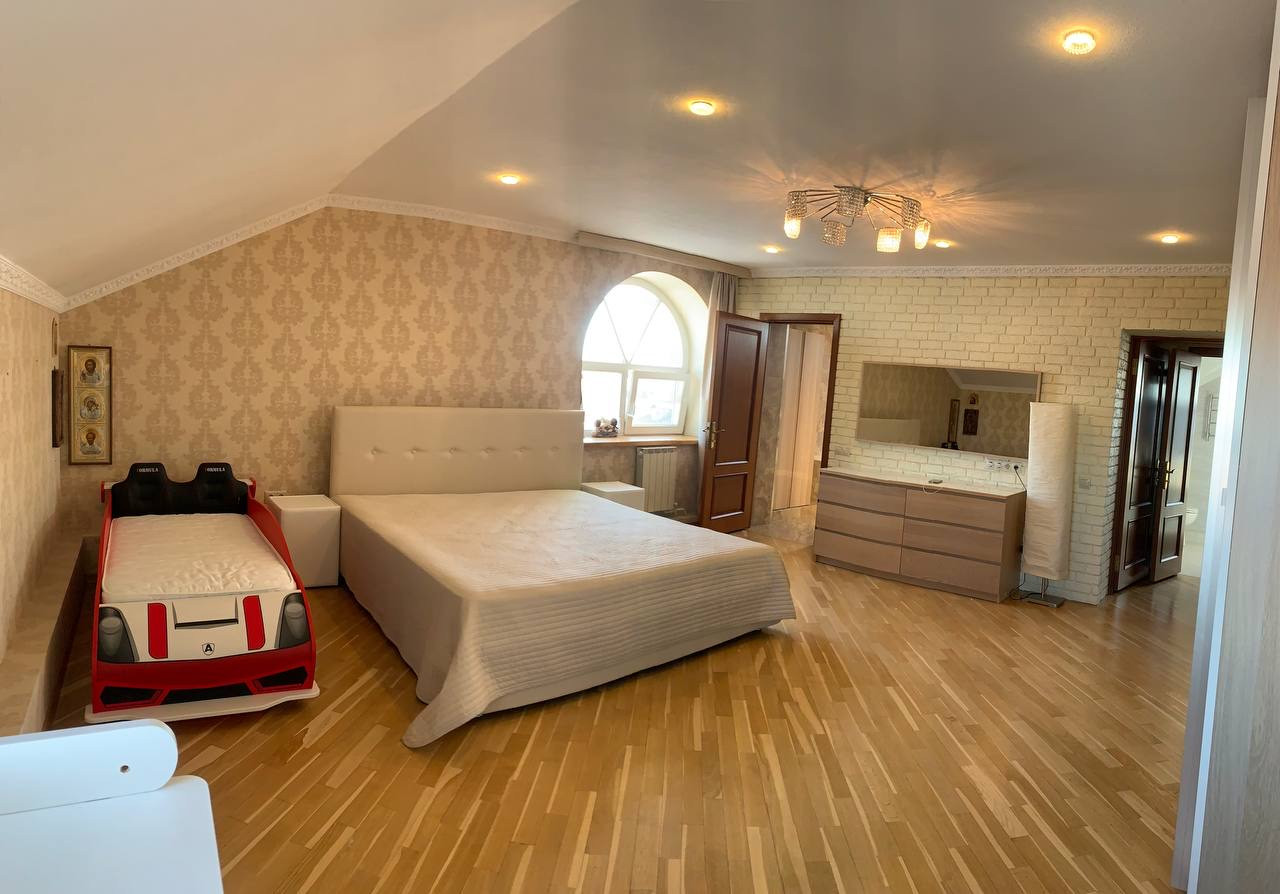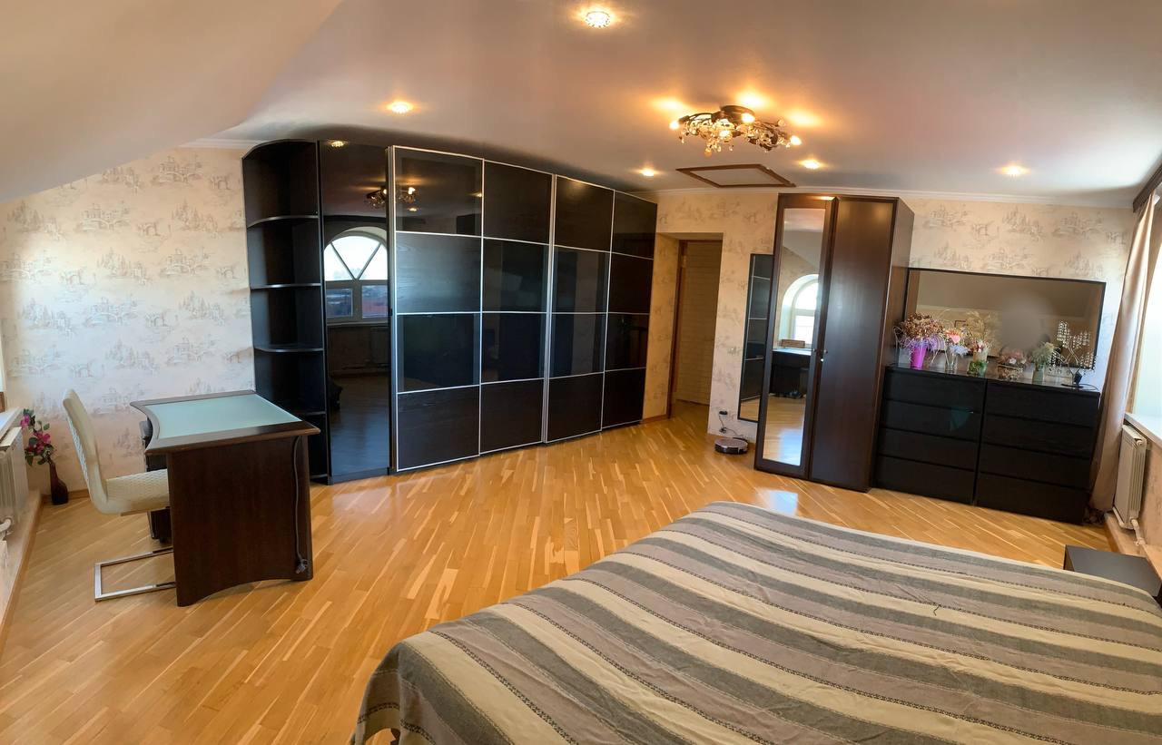 Второй этаж: Мастер спальня 25 квм с балконом, выходящая видом на ухоженный сад с прудом. Спальня совмещена с кабинетом. Также на этом этаже располагается гостевая спальня. Туалет плюс полноценный санузел с душевой кабиной. Библиотека. Зимний сад с русским бильярдом >50м
